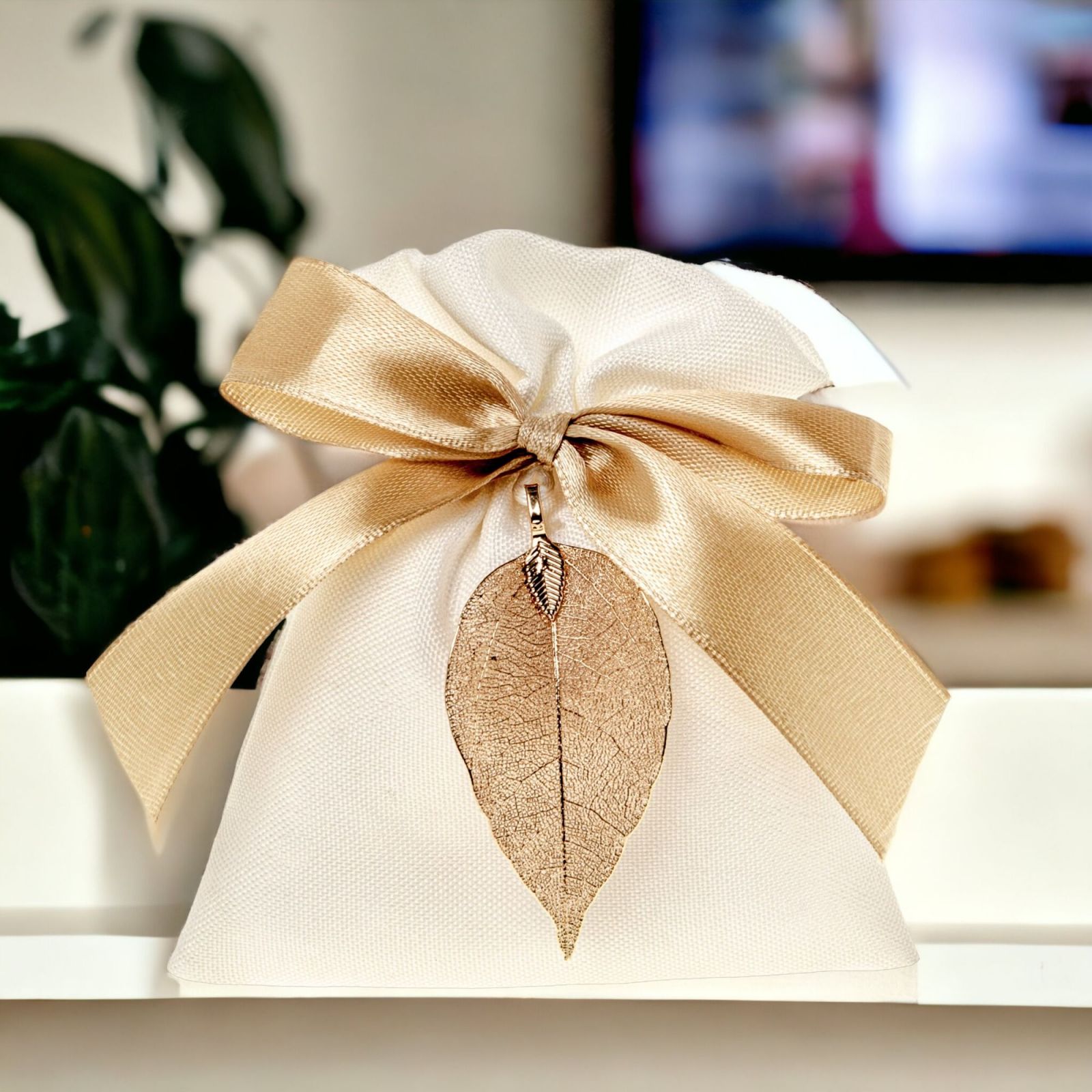 Regala un tocco di classe e raffinatezza ai tuoi ospiti con la bomboniera Linea Foglia Bag Sacchettino Bianco in cotone. Un sacchettino dalla forma delicata, con un grande e una piccolina foglia color beige, un fiocchetto, e un doppio ciondolo dal design unico e di tendenza. Questa bomboniera dalle dimensioni di 10x12 cm è perfetta per eventi come Battesimi, Prime Comunioni, Cresime, Matrimoni, Anniversari e Feste di 18 anni.