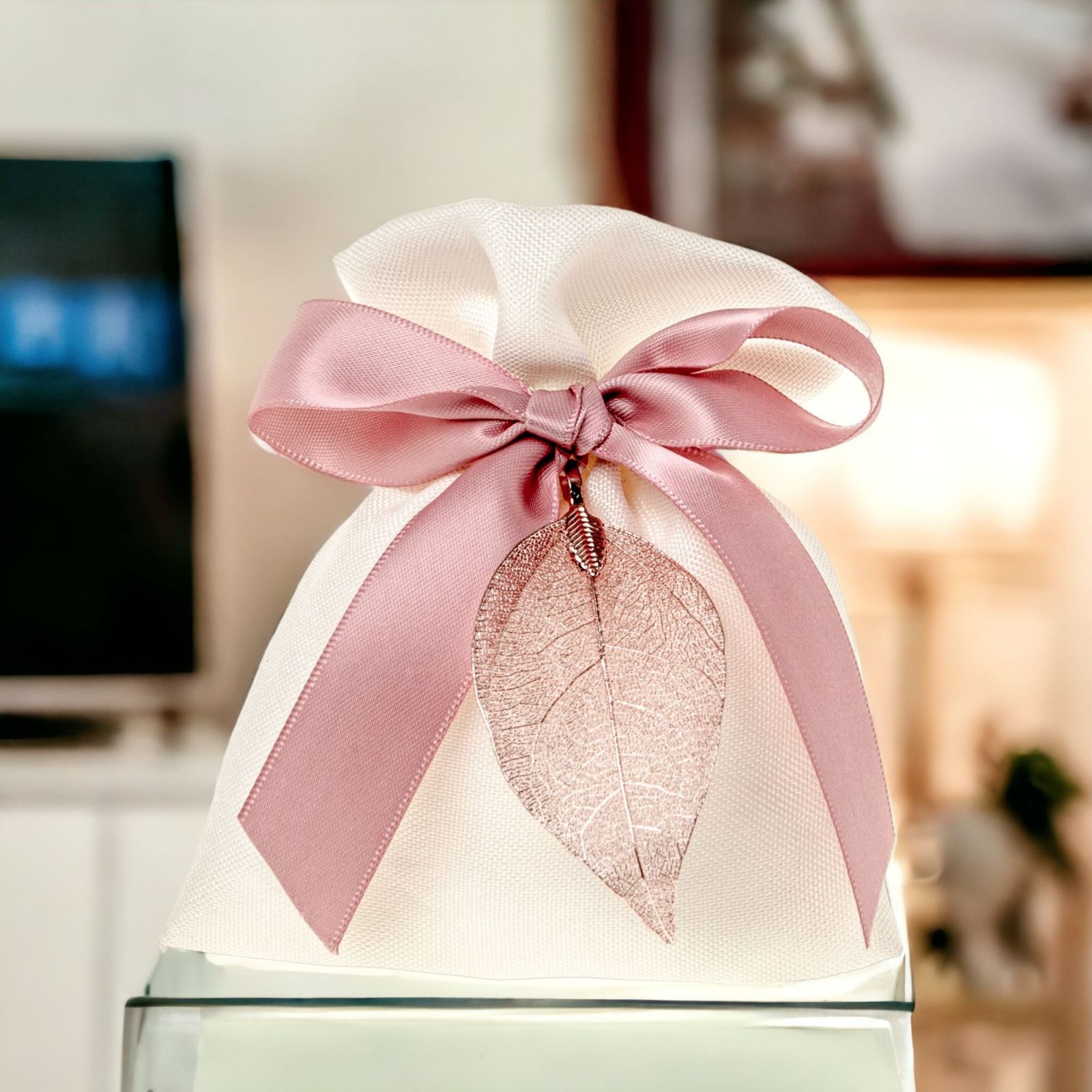 La nostra bomboniera con foglia è uno splendido dono da regalare agli invitati che partecipano a un evento speciale come un battesimo, una prima comunione, una santa cresima, un matrimonio o un anniversario. Questa idea segnaposto è una sacchetto bianco di dimensione cm 10x12 circa.