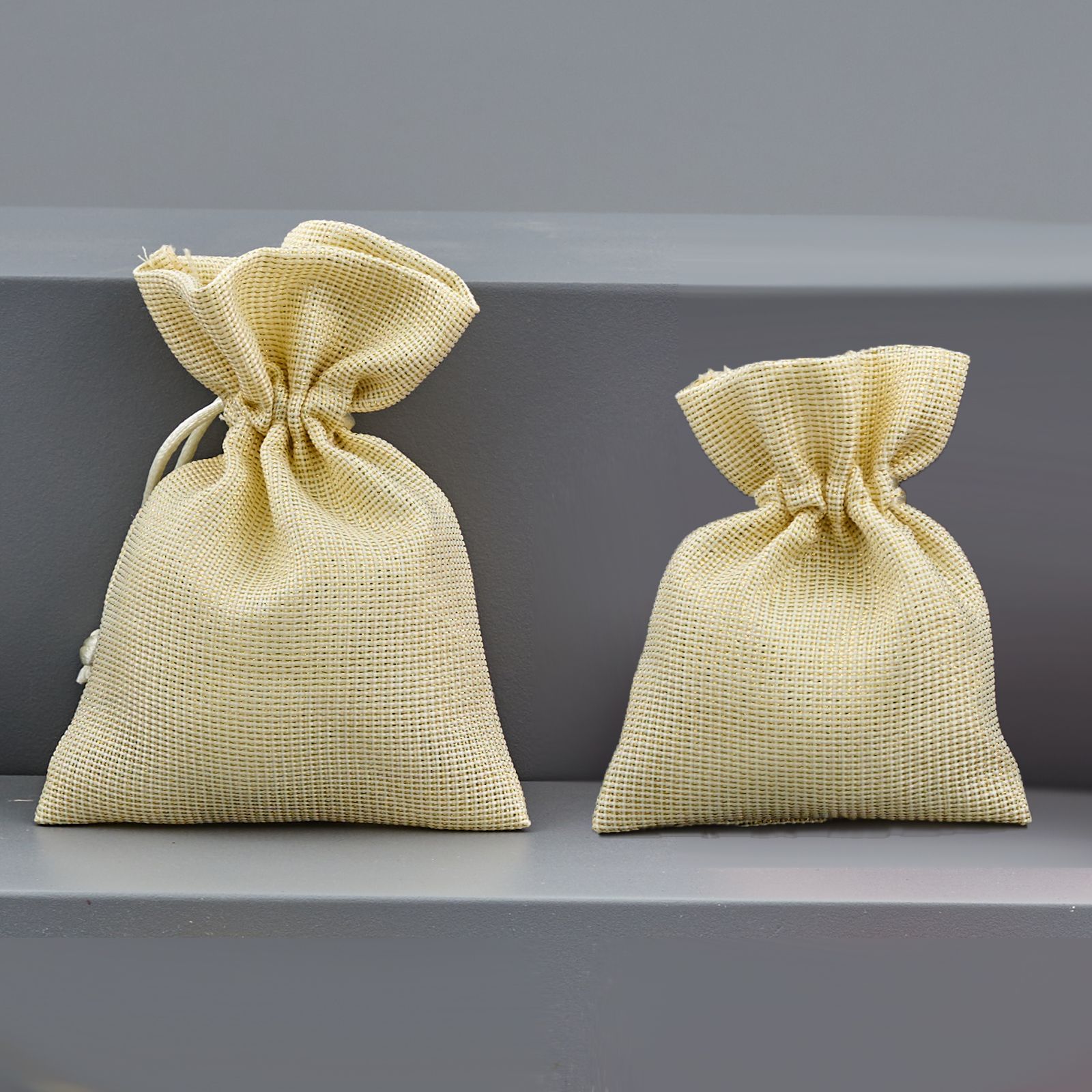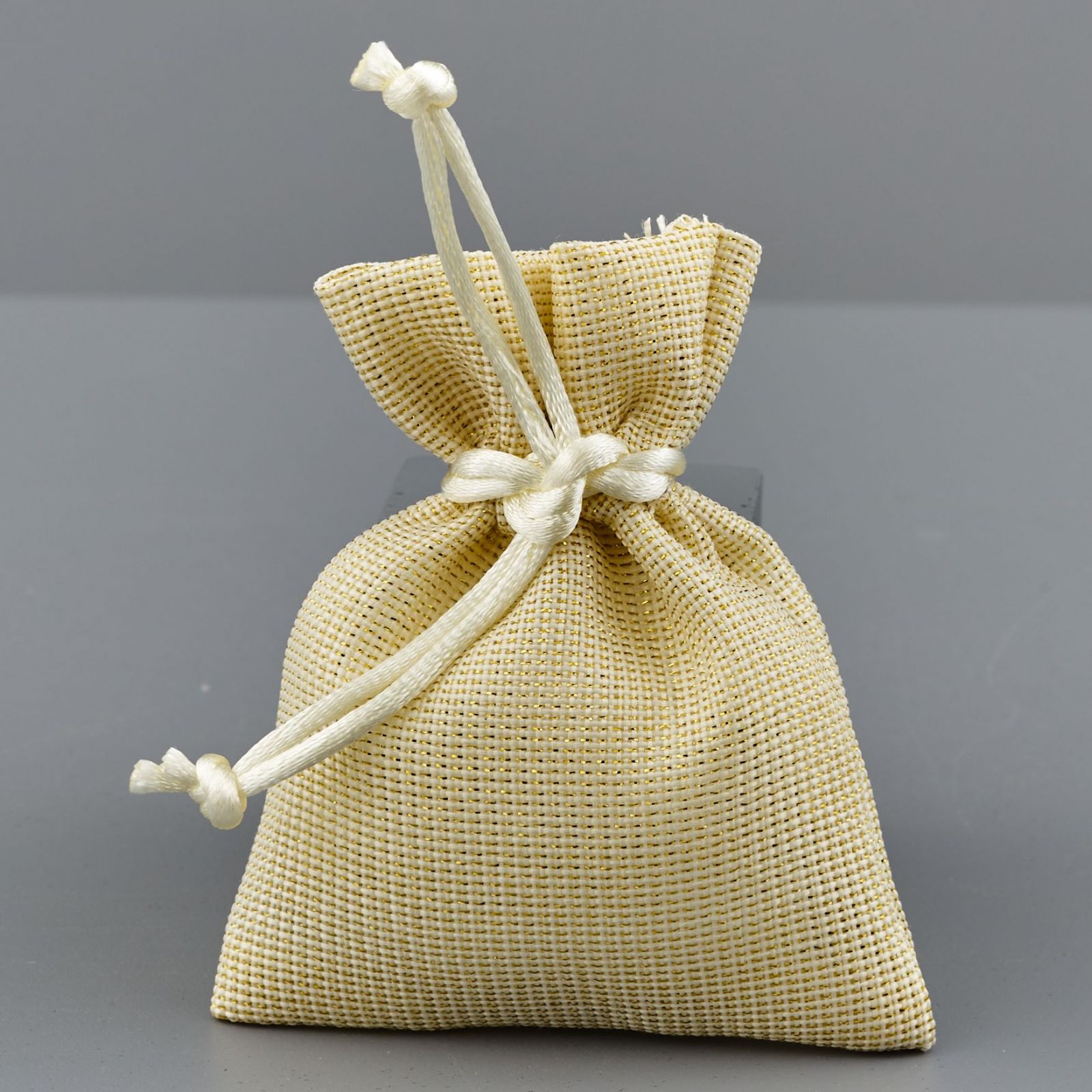 Concedi ai tuoi invitati un dono unico e speciale regalando loro un sacchetto portaconfetti. Disponibile in due misure per soddisfare ogni esigenza, questo sacchetto elegante è realizzato in cotone color oro/crema ed è perfetto per abbellire una confettata originale o uno sweettable.