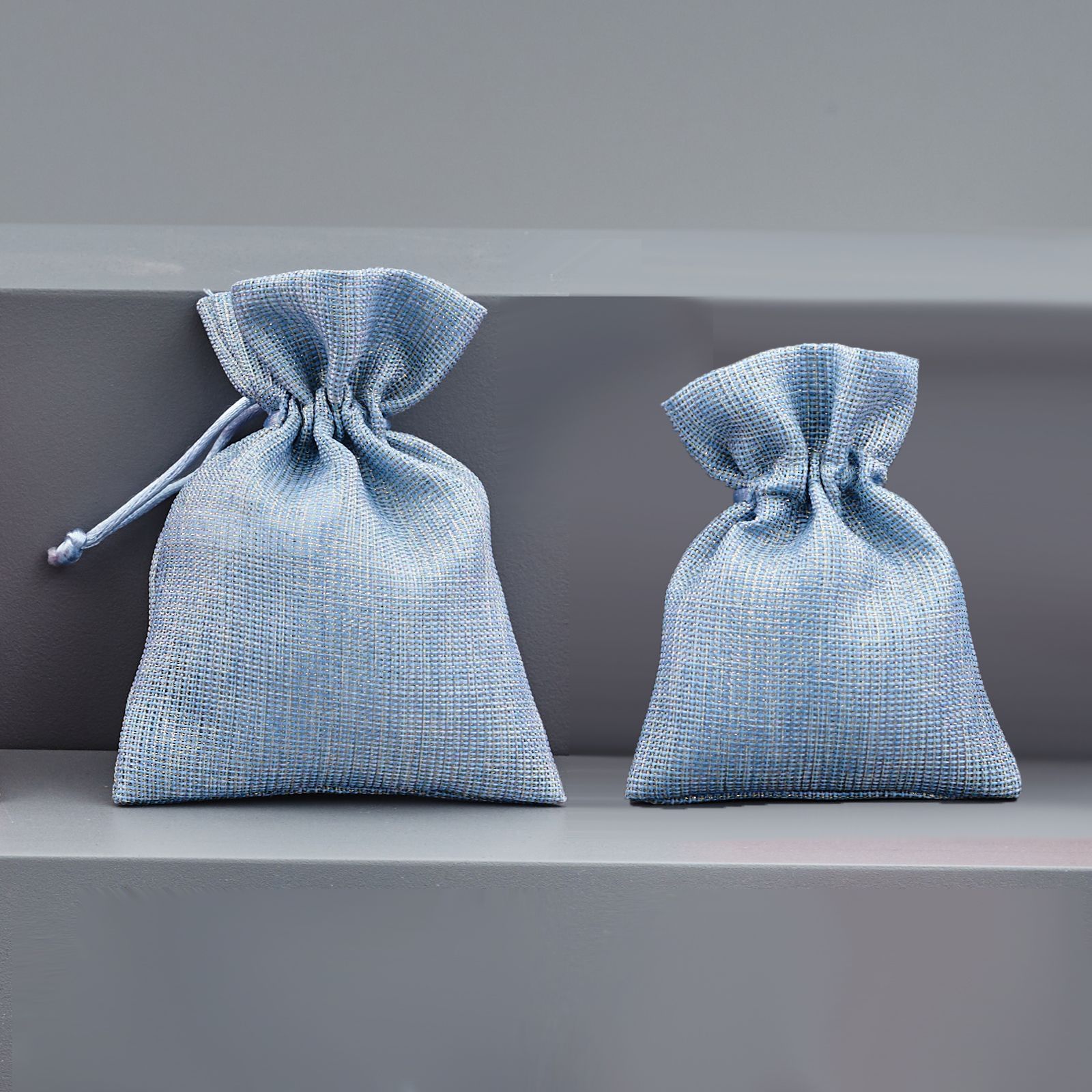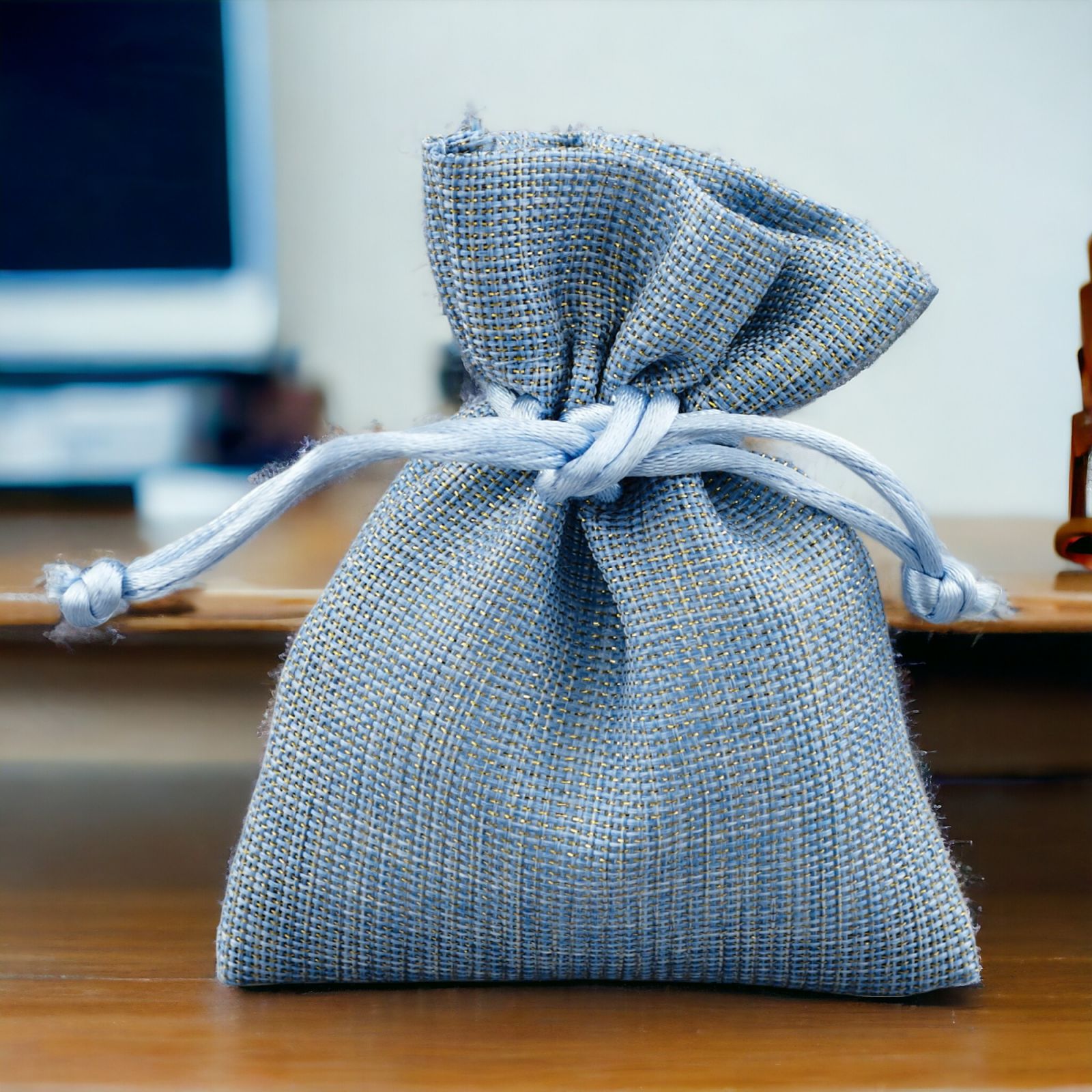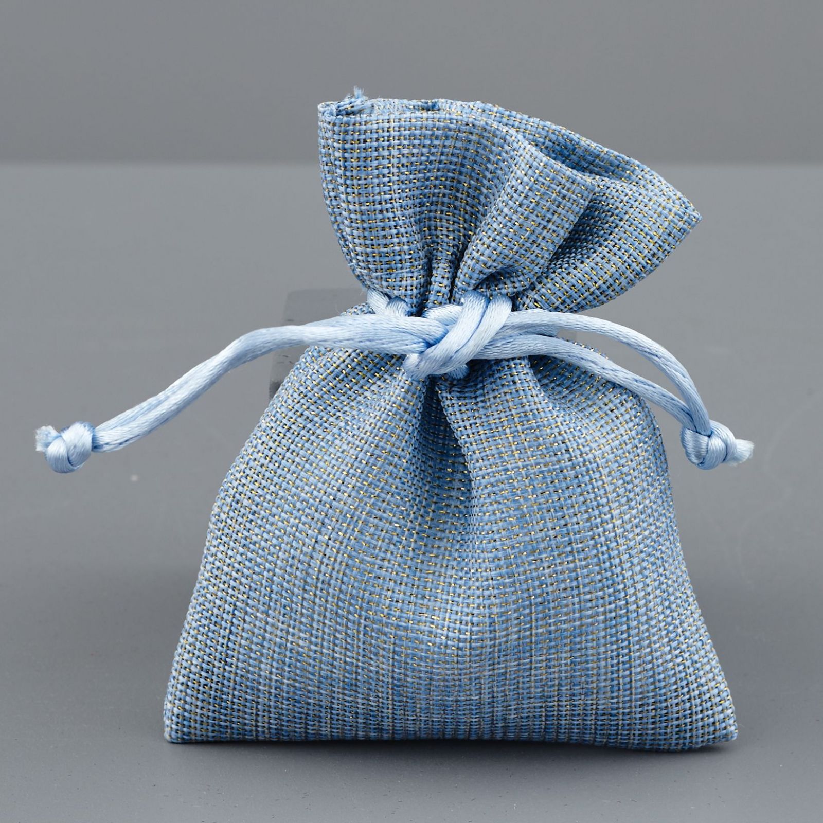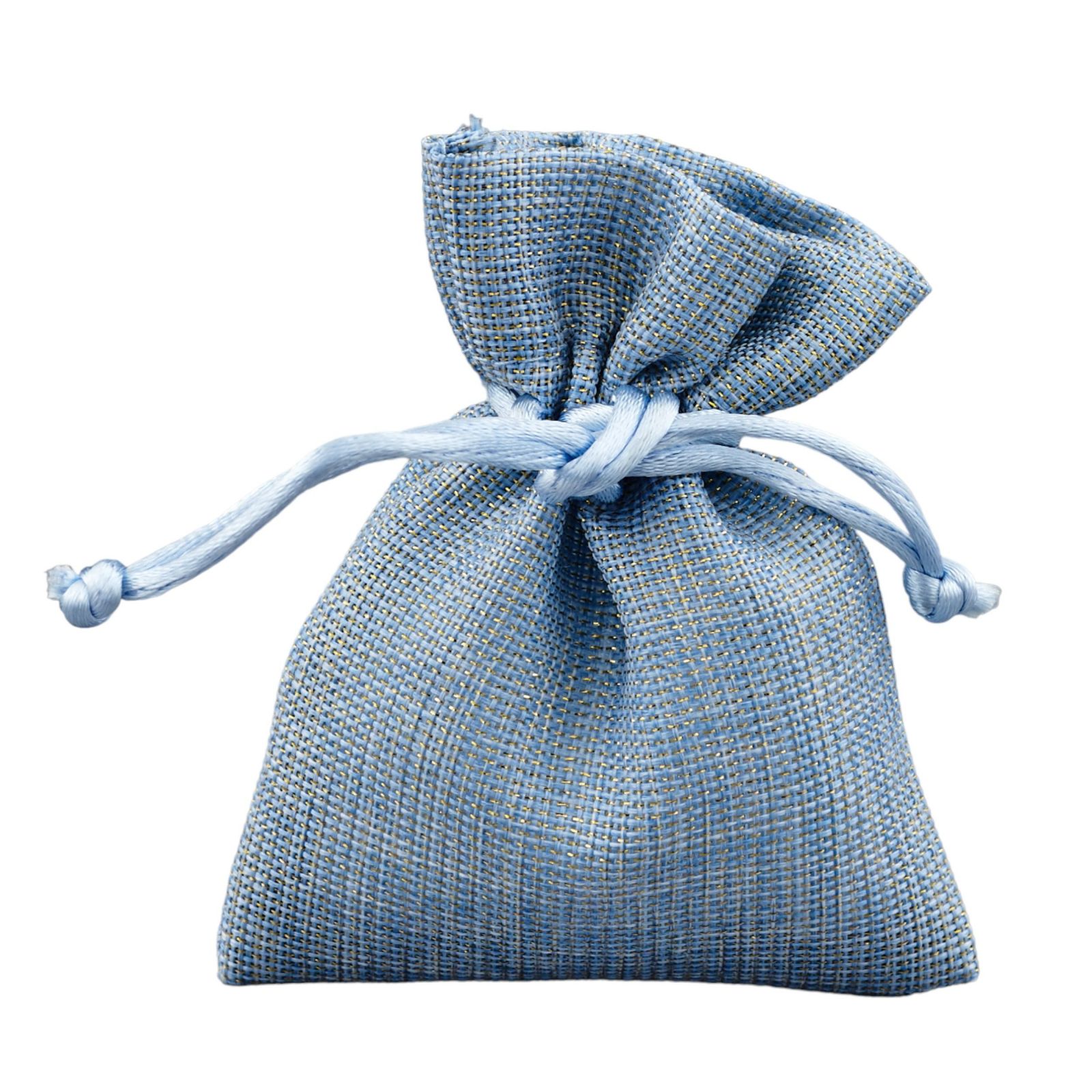 Questo sacchetto, disponibile in due diverse misure, standard 8x10 circa e grande 10X13 cm circa, è realizzato con cotone ed è di colore oro/celeste.