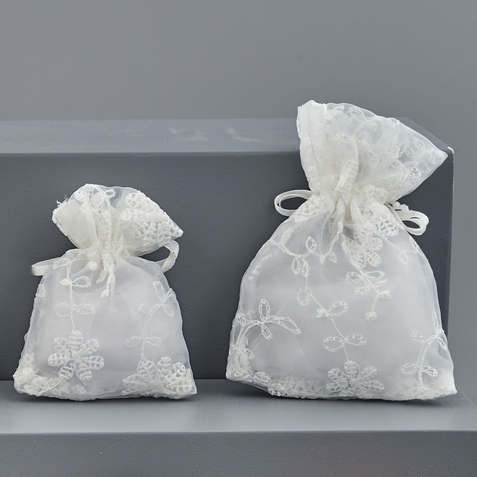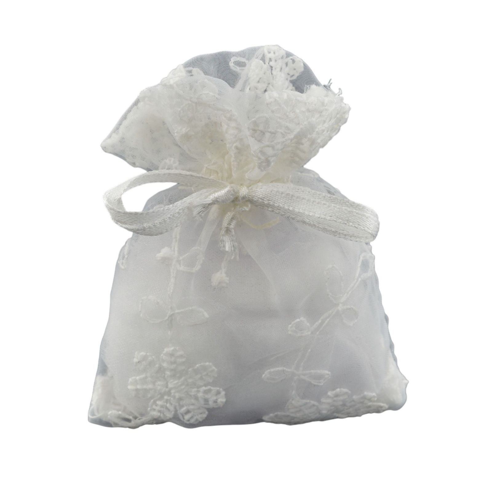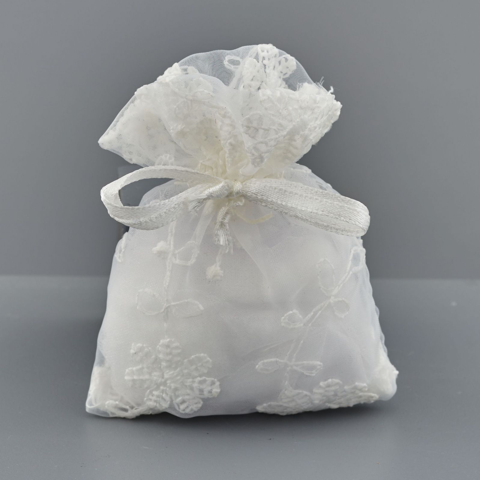 Realizzato in organza di prima qualità, di colore bianco, questo sacchetto è disponibile in due misure - Standard: 8x10 cm circa; Grande: 10x14 cm circa.