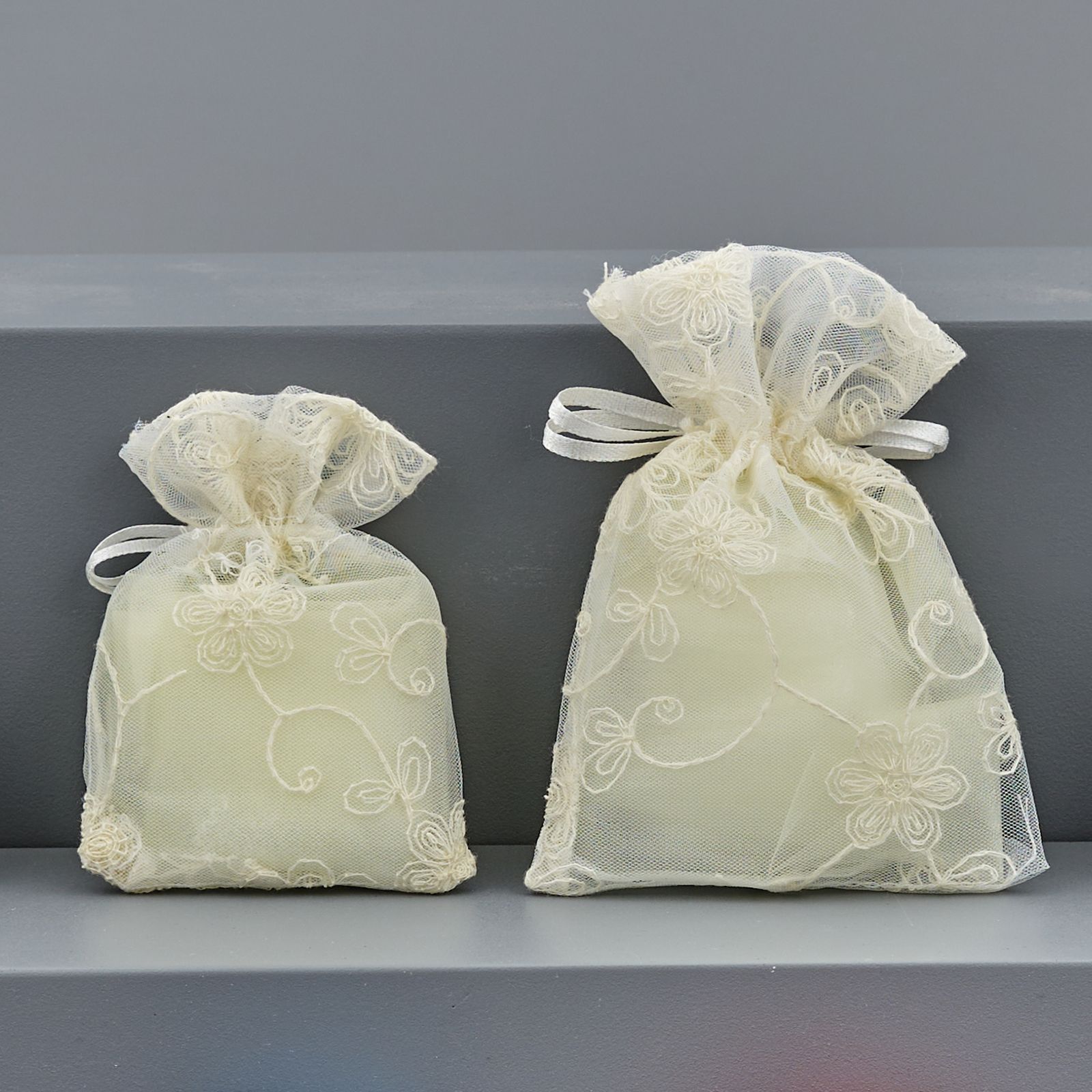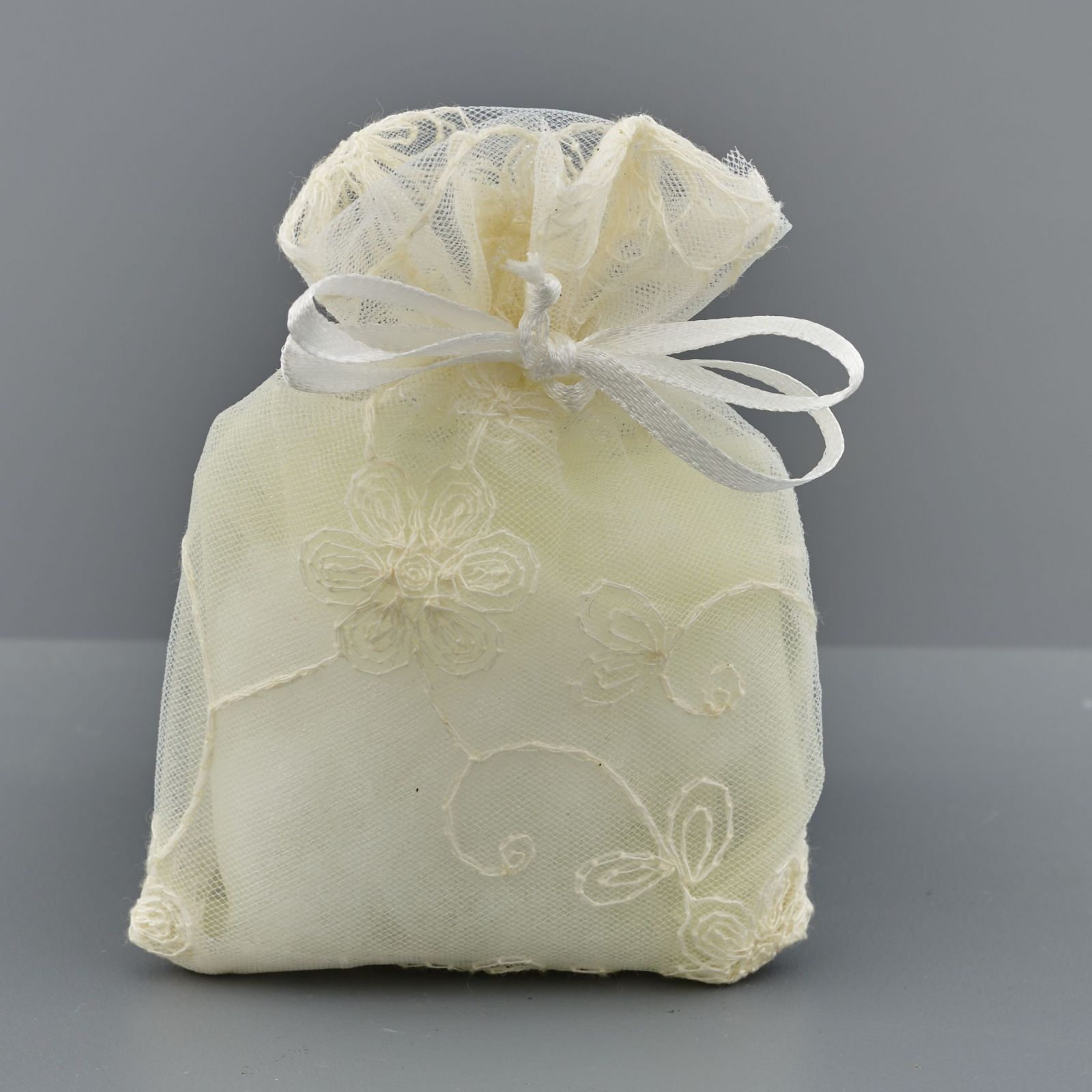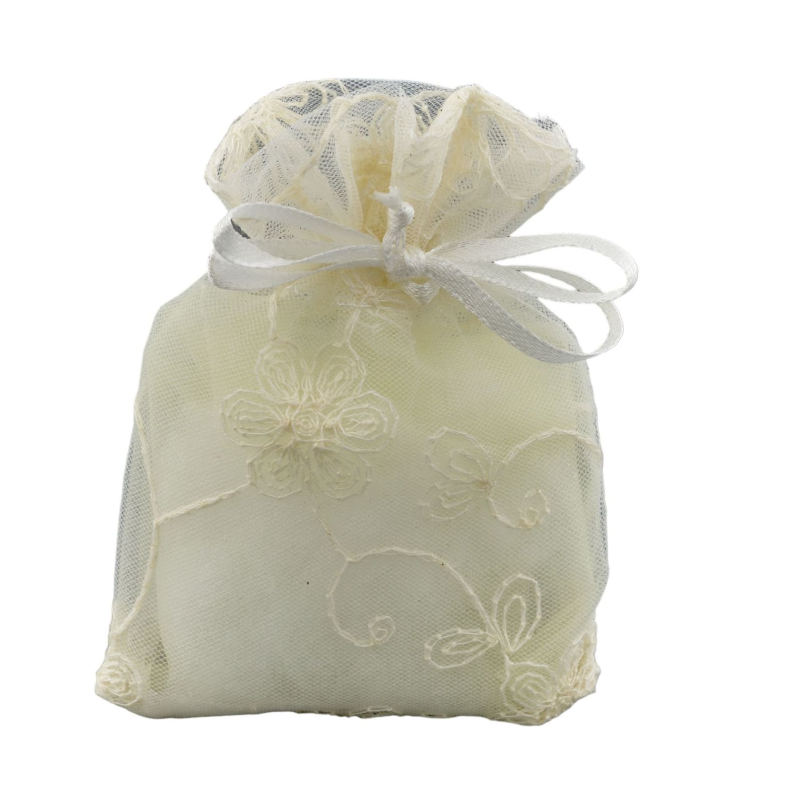 Questa bomboniera in organza ricamata di colore panna, è un dolce segnaposto per tutti gli invitati che partecipano al tuo evento.