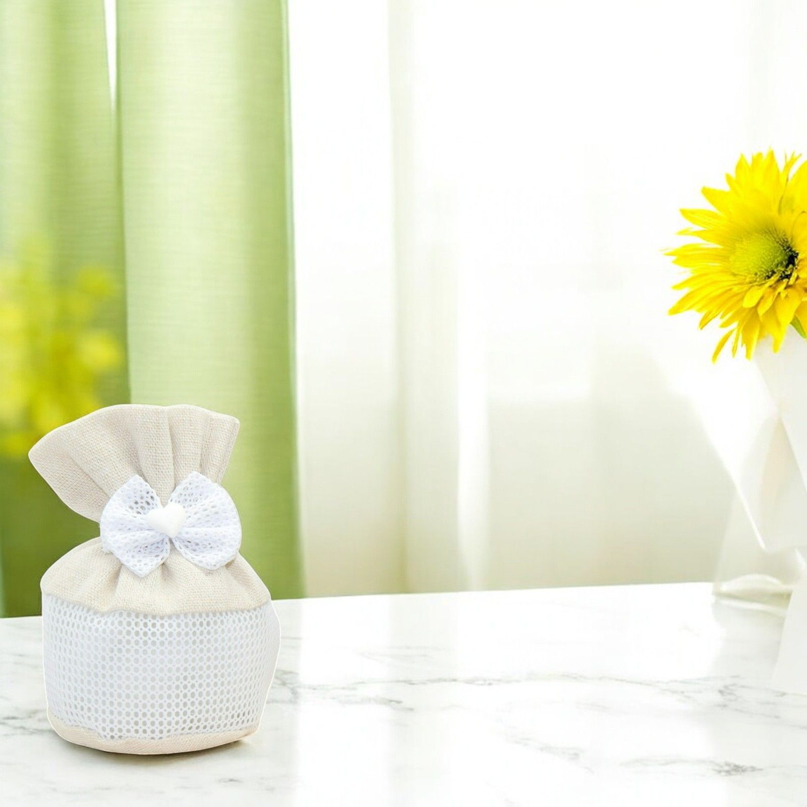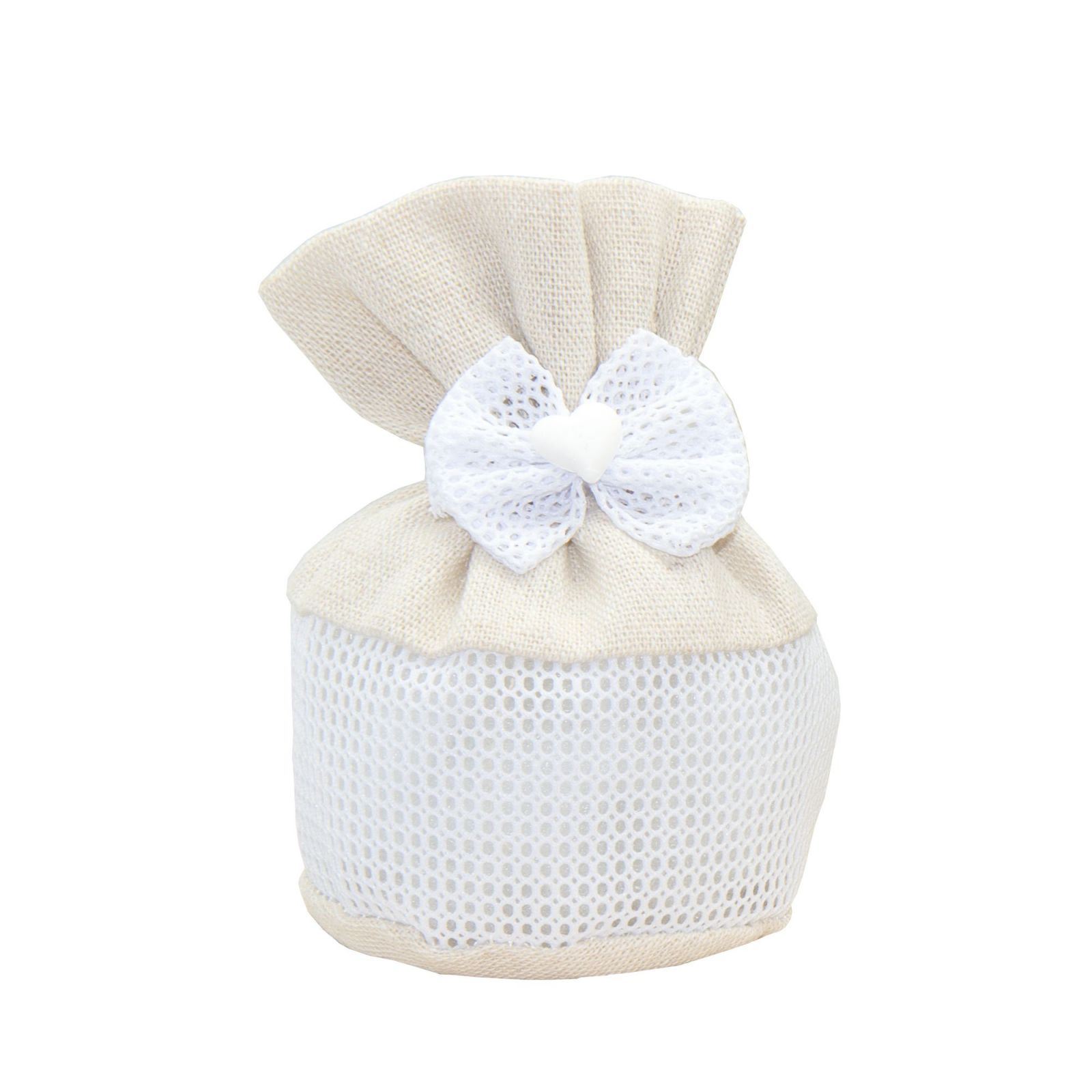 Stai cercando un'idea originale per le tue bomboniere da matrimonio o anniversario? Questo sacchetto portaconfetti tondo è la scelta perfetta per te! Realizzato in cotone e juta, con un elegante fiocchetto centrale con cuoricino, questo sacchettino aggiungerà un tocco di classe e romanticismo al tuo evento.