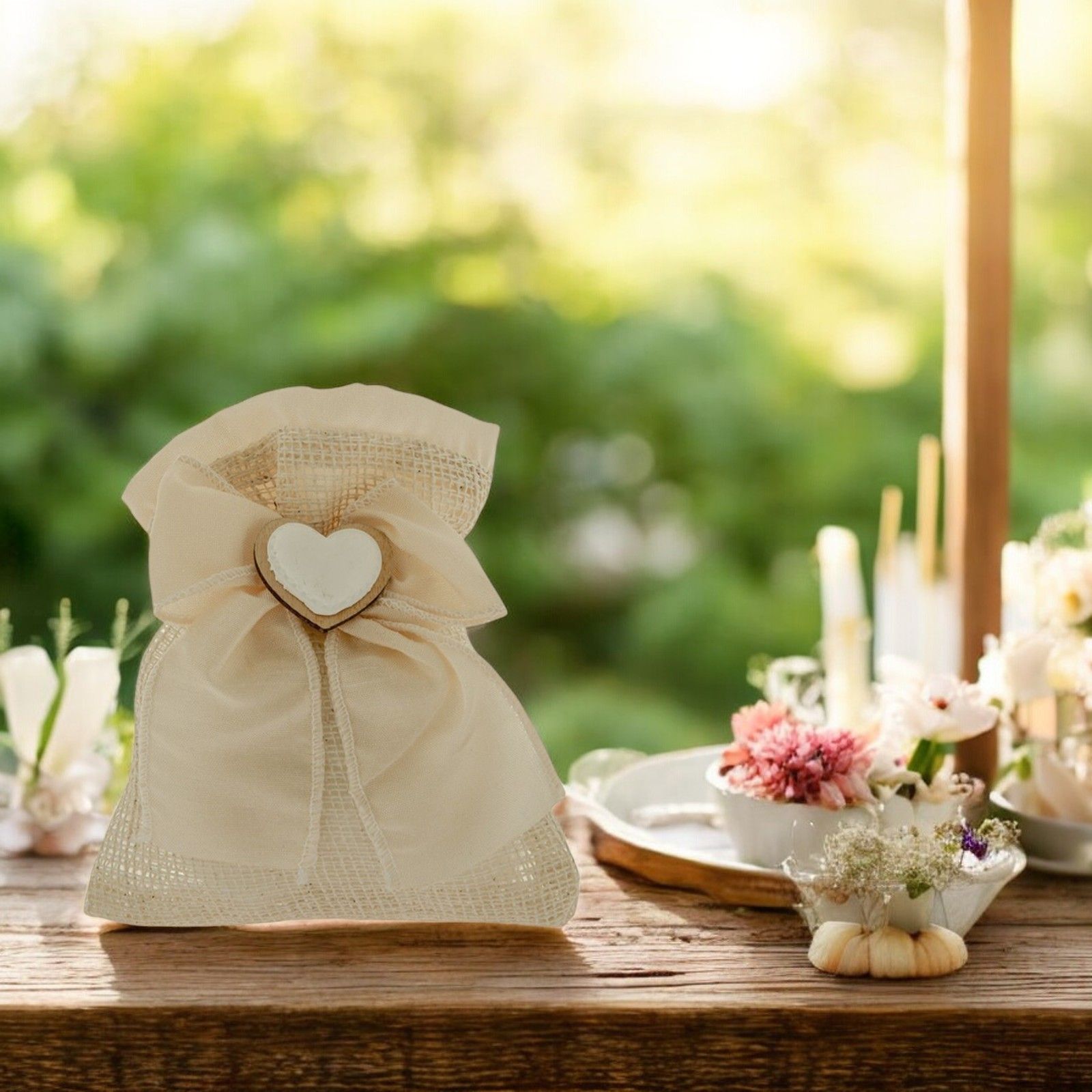 Regalare questa bomboniera significa donare un piccolo gesto di amore e gratitudine ai tuoi ospiti, rendendo il tuo evento ancora più speciale e indimenticabile. Il sacchettino juta con fiocco in organza bianco è la scelta ideale per chi desidera un'opzione raffinata e unica per la propria festa.