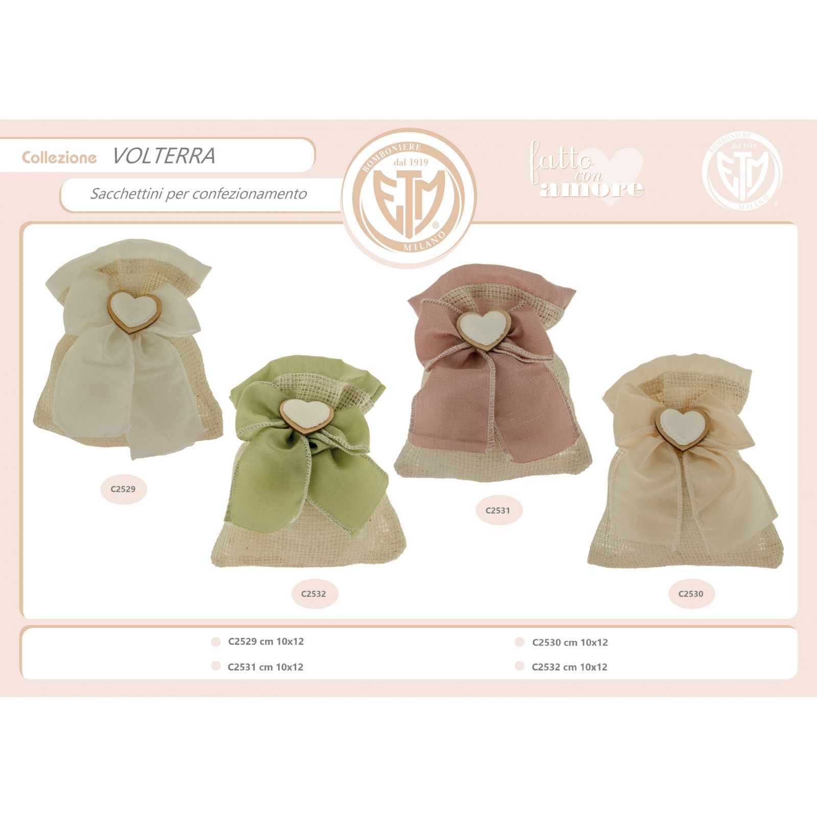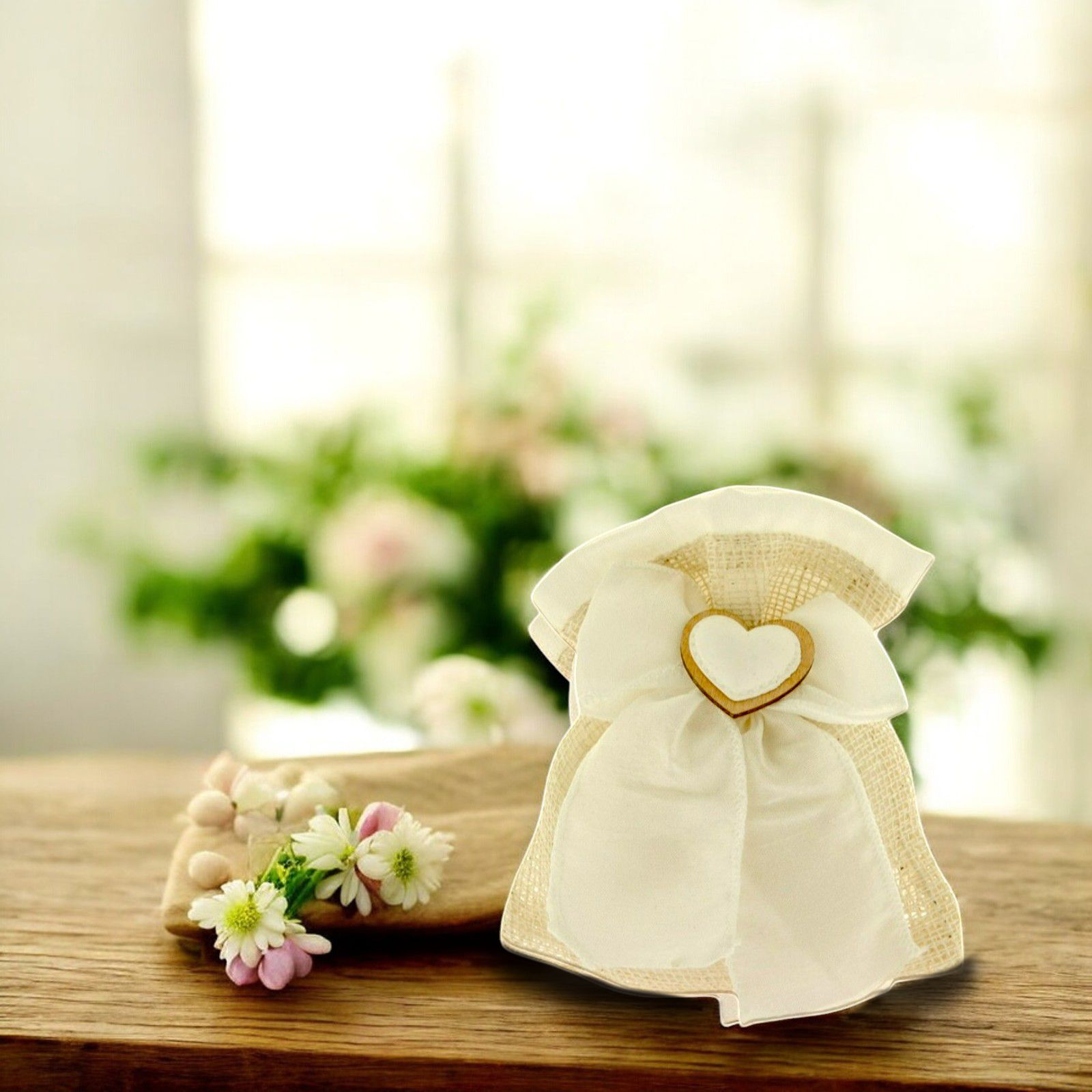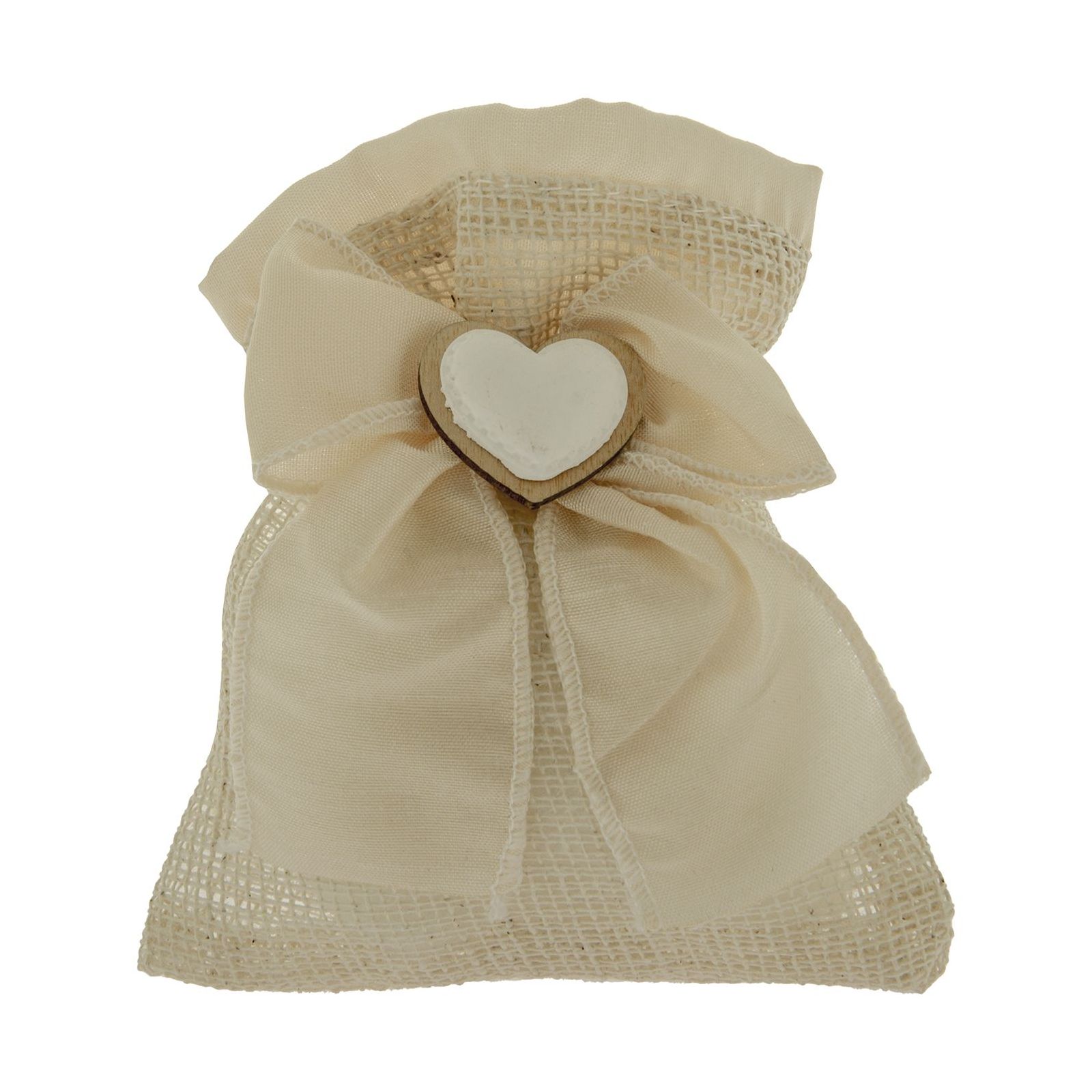 Realizzato in juta e organza di alta qualità, questo sacchettino ha dimensioni di circa 10x12 cm e un colore panna che si adatta perfettamente a ogni tipo di allestimento. La sua particolare applicazione a cuore al centro lo rende un gadget unico e romantico, perfetto per celebrare momenti speciali con i tuoi cari.
