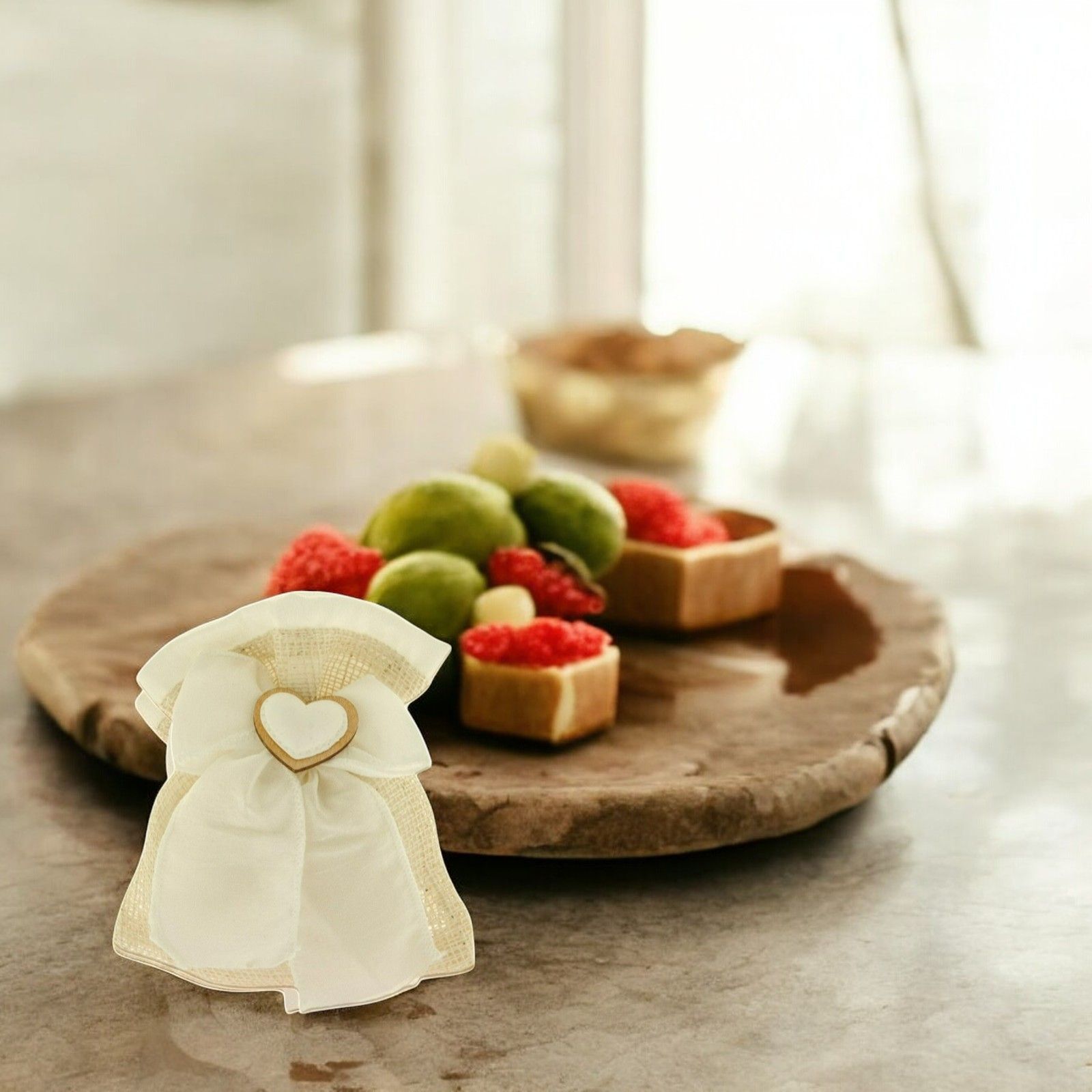 Il sacchettino juta naturale con fiocco in organza panna e applicazione cuore al centro è l'ideale per rendere speciale ogni evento, che sia un matrimonio, una comunione o un anniversario. Questa bomboniera originale può essere utilizzata come segnaposto o portaconfetti, aggiungendo un tocco di eleganza e raffinatezza alla tua festa.