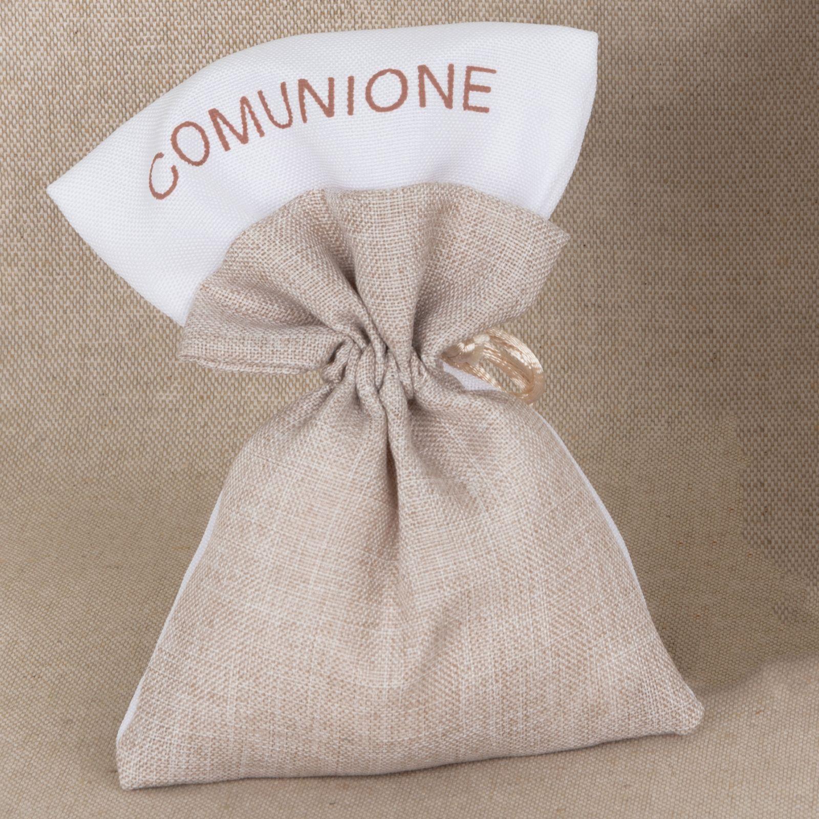 Non perdere l'occasione di sorprendere i tuoi ospiti con un regalo unico e raffinato. Scegli il sacchetto confetti con tiranti e fascia superiore con scritta "comunione" per aggiungere un tocco di classe e originalità alla tua festa di comunione.