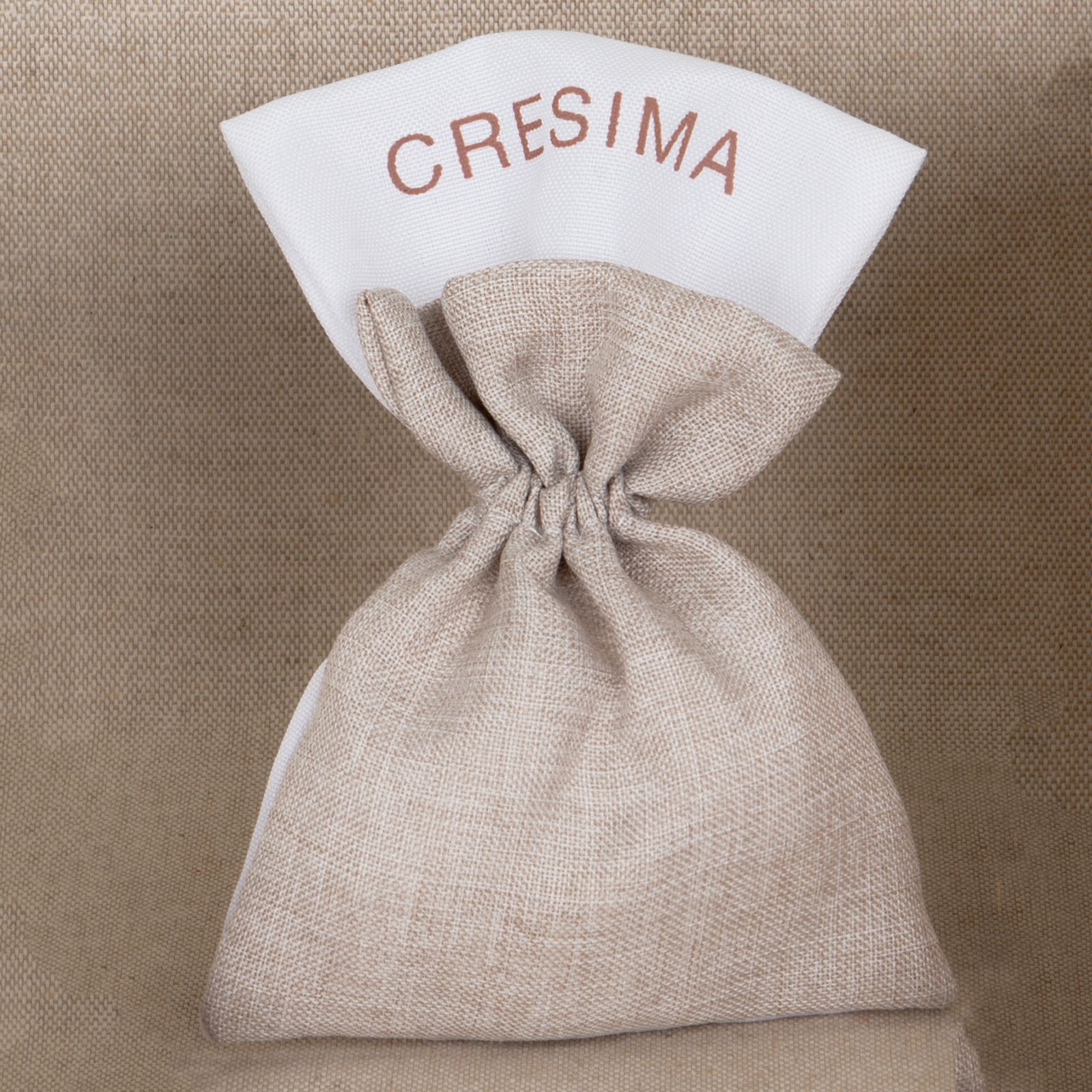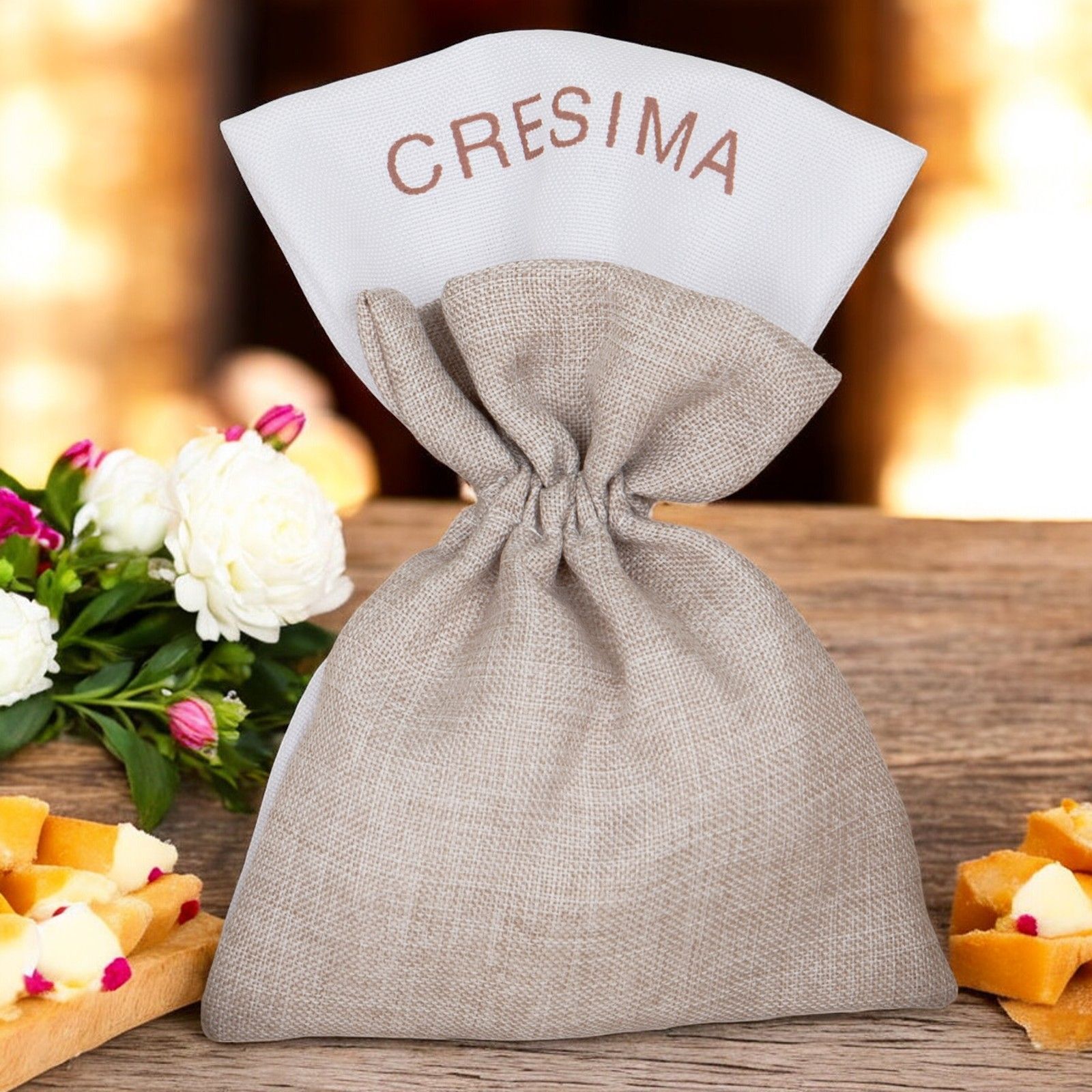 Con una dimensione di circa 10 x 15 cm, questo sacchetto è disponibile nei colori bianco e juta, perfetti per adattarsi al tema della cerimonia. I tiranti e la fascia superiore con scritta cresima aggiungono un tocco di personalizzazione e originalità al regalo.
