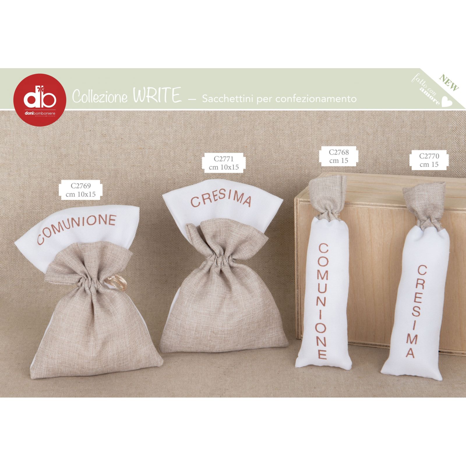Questo elegante sacchetto confetti con tiranti e fascia superiore con scritta cresima è perfetto per essere regalato agli invitati alla cerimonia di cresima. Realizzato con materiali di alta qualità, questo porta confetti è ideale per contenere i dolci e i confetti che verranno distribuiti durante la festa.