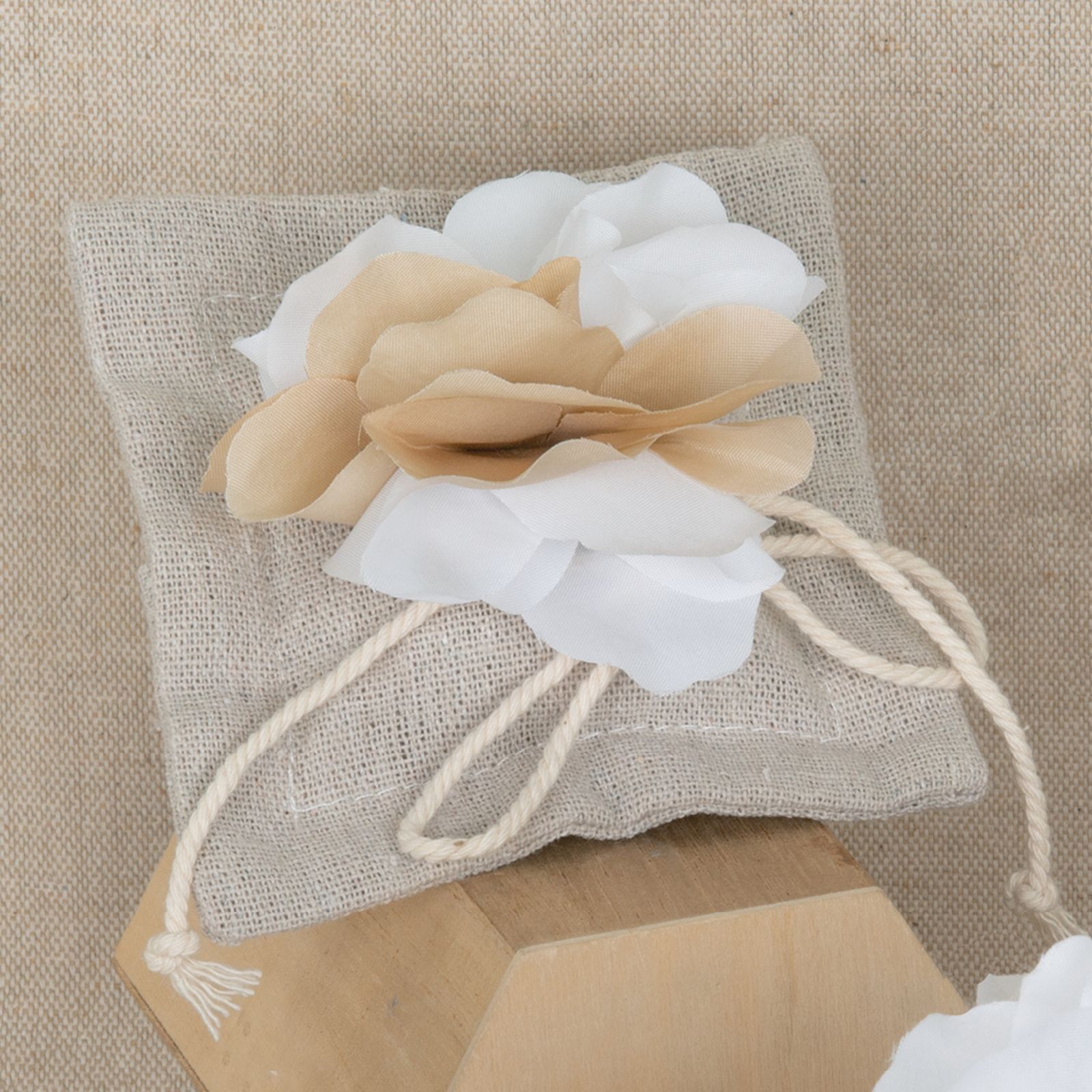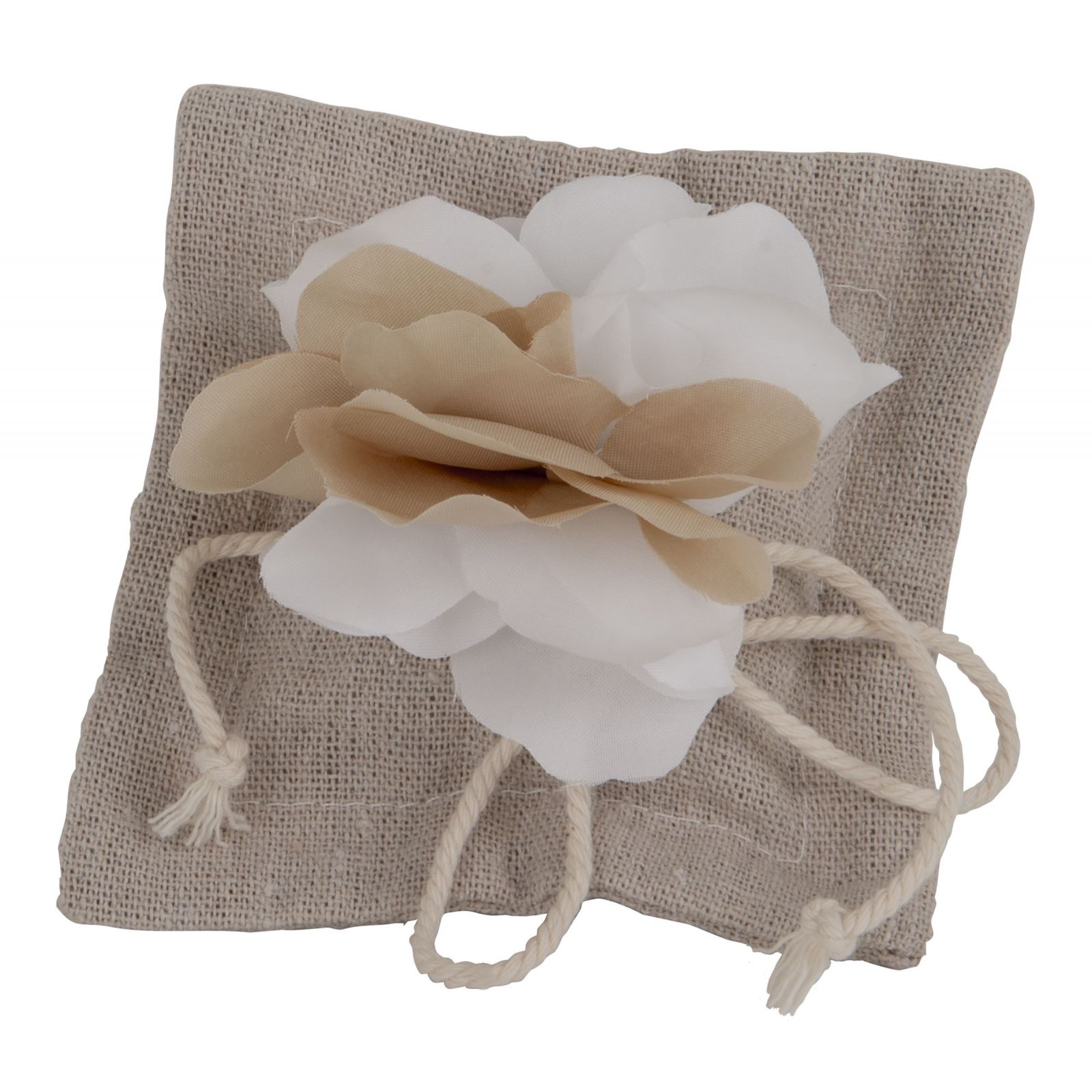 Realizzato in juta, il sacchettino misura circa 10 cm ed è disponibile nel colore juta con fiore bianco e beige. Il suo design lo rende ideale come segnaposto o piccolo omaggio per i tuoi invitati.