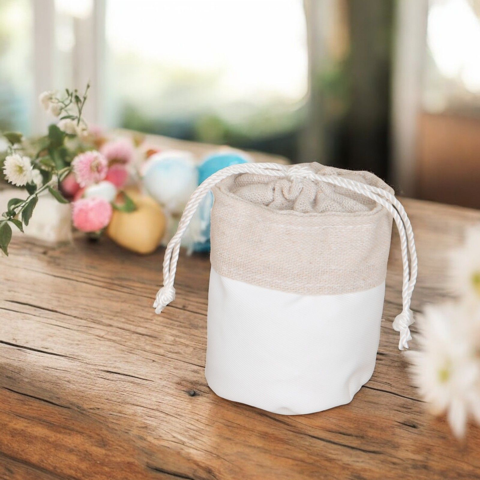 Un'idea originale e raffinata per ringraziare gli invitati alla tua cerimonia sono i sacchettini porta confetti a cestino con comodi tiranti. Realizzati in elegante tessuto bianco e beige, questi sacchetti sono perfetti per eventi come comunioni, cresime, matrimoni e anniversari. Le dimensioni di cm. 8 li rendono pratici da utilizzare come sacchetti portaconfetti o come segnaposto.