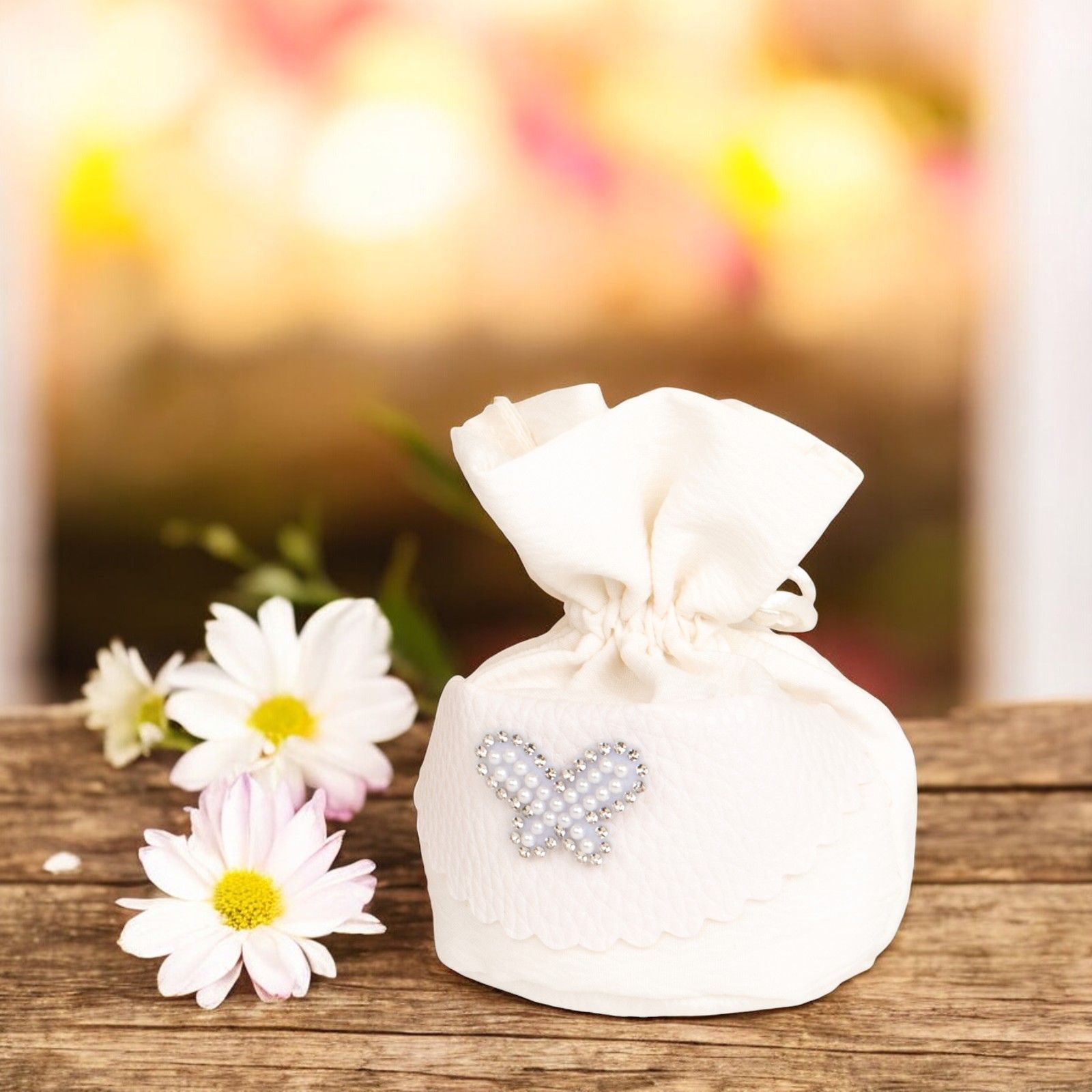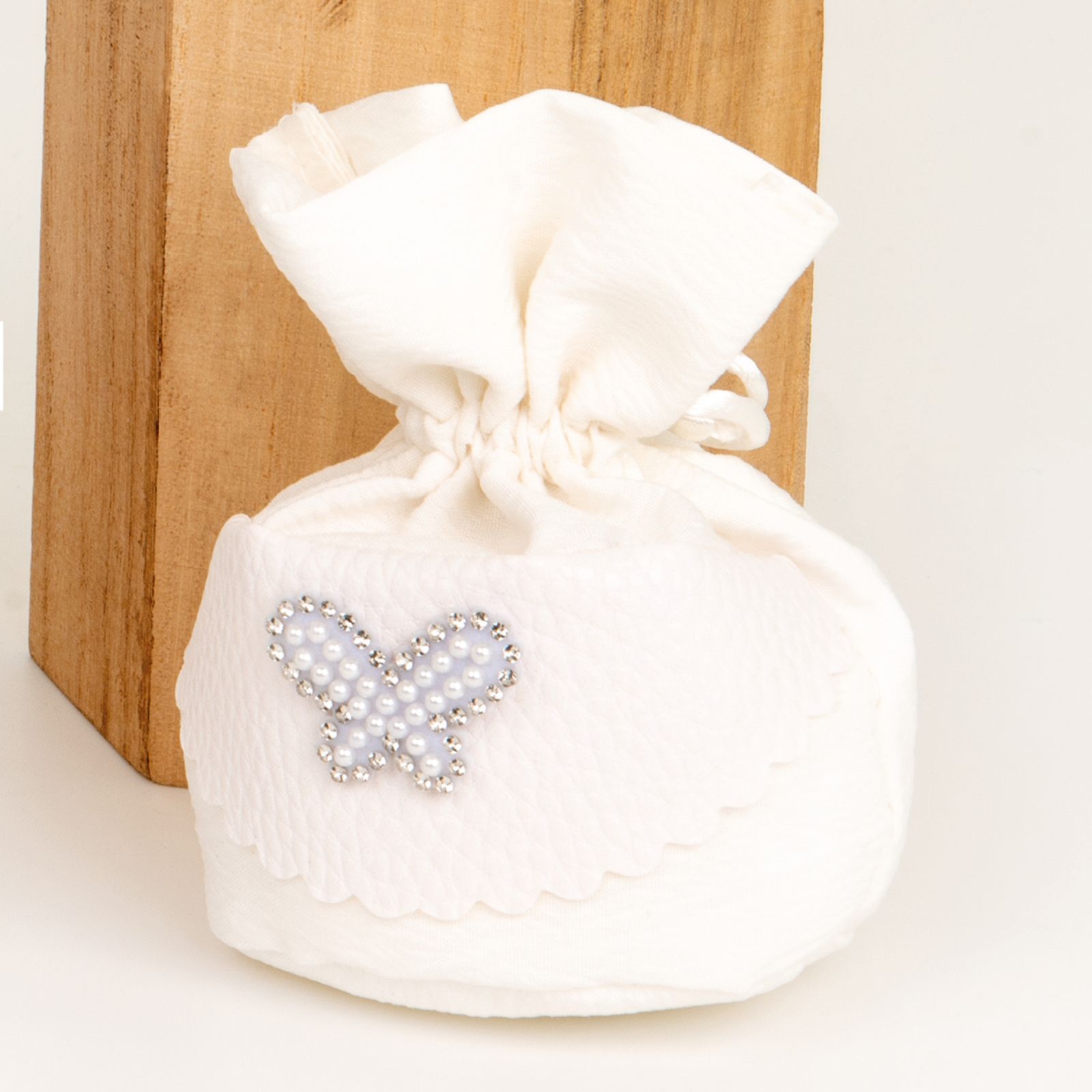 In occasione di eventi speciali come la comunione, la cresima, il matrimonio o un anniversario, regalare una sacchettino per confetti a palla con dettaglio in ecopelle con farfalla con perline è un gesto di eleganza e raffinatezza. Questa bomboniera è perfetta per sorprendere gli invitati alla cerimonia con un regalo unico e originale.