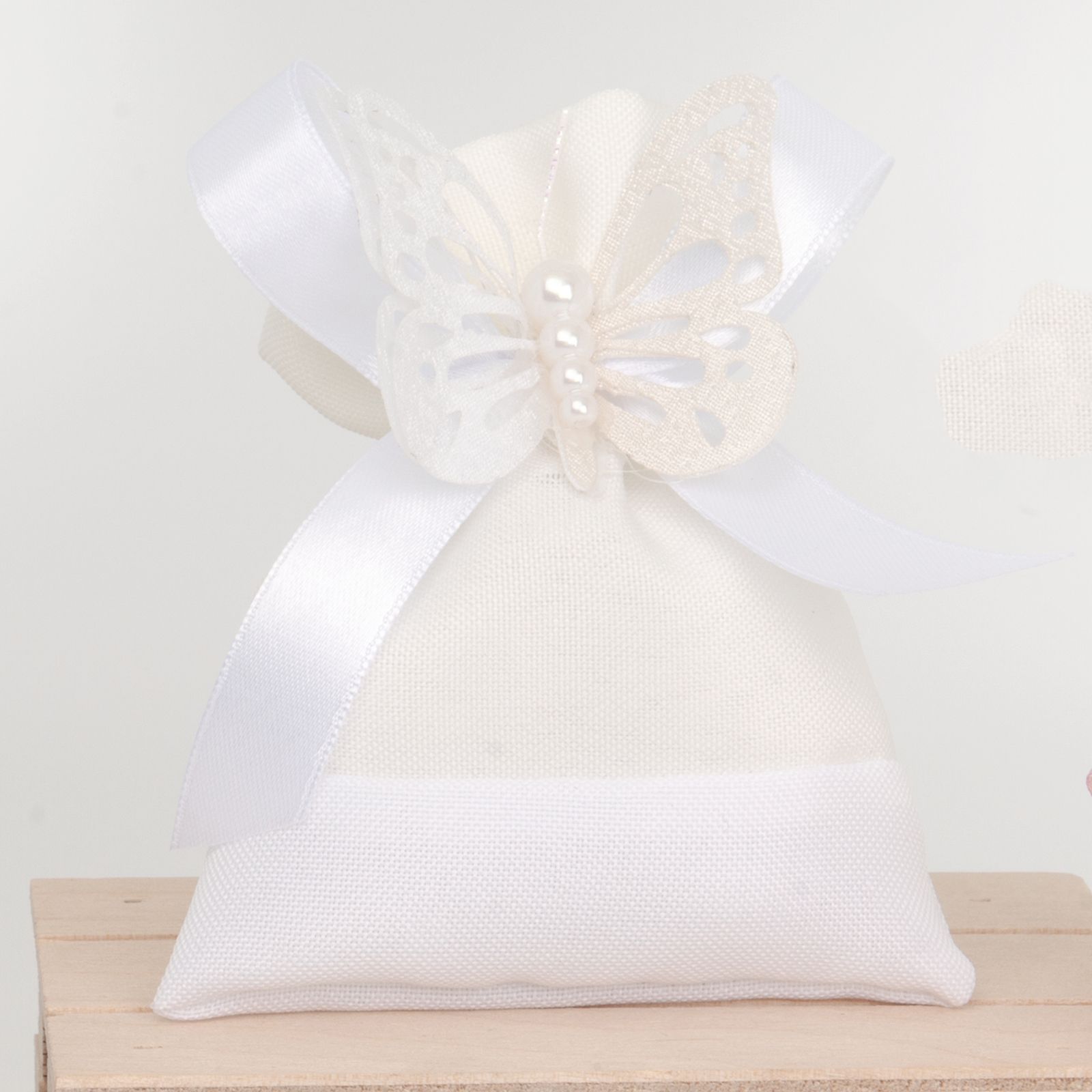 Il sacchettino portaconfetti con tiranti, fiocco e farfalla con perline centrali è un regalo elegante e raffinato per eventi speciali come comunioni, cresime, matrimoni e anniversari. Realizzato in cotone di alta qualità, misura circa 9 x 11 cm ed è disponibile nei colori bianco e panna.
