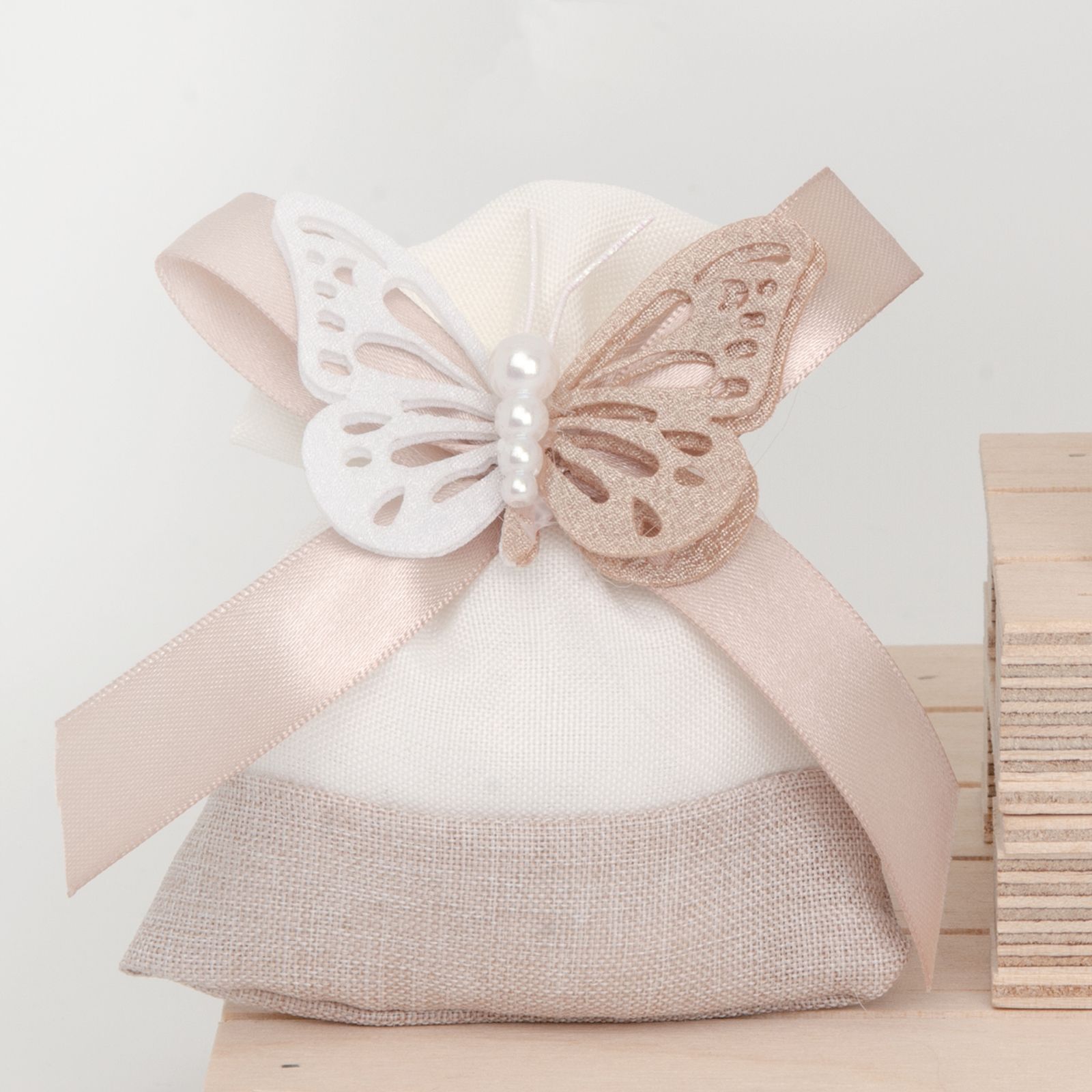 Con dimensioni di circa 9 x 11 cm, il sacchettino nei toni tortora e panna si adatta a qualsiasi decorazione. La farfalla con perline centrali aggiunge un tocco unico e raffinato.