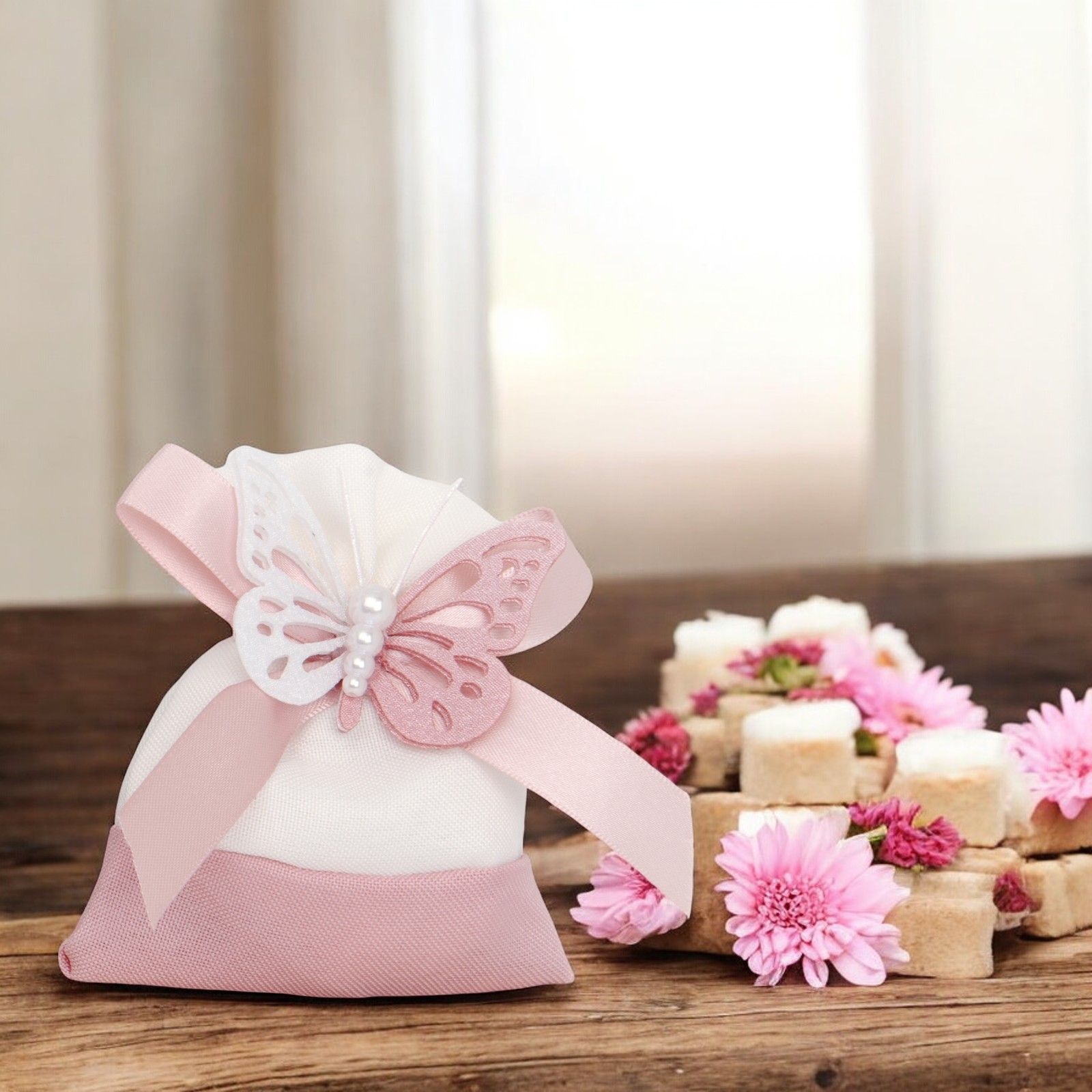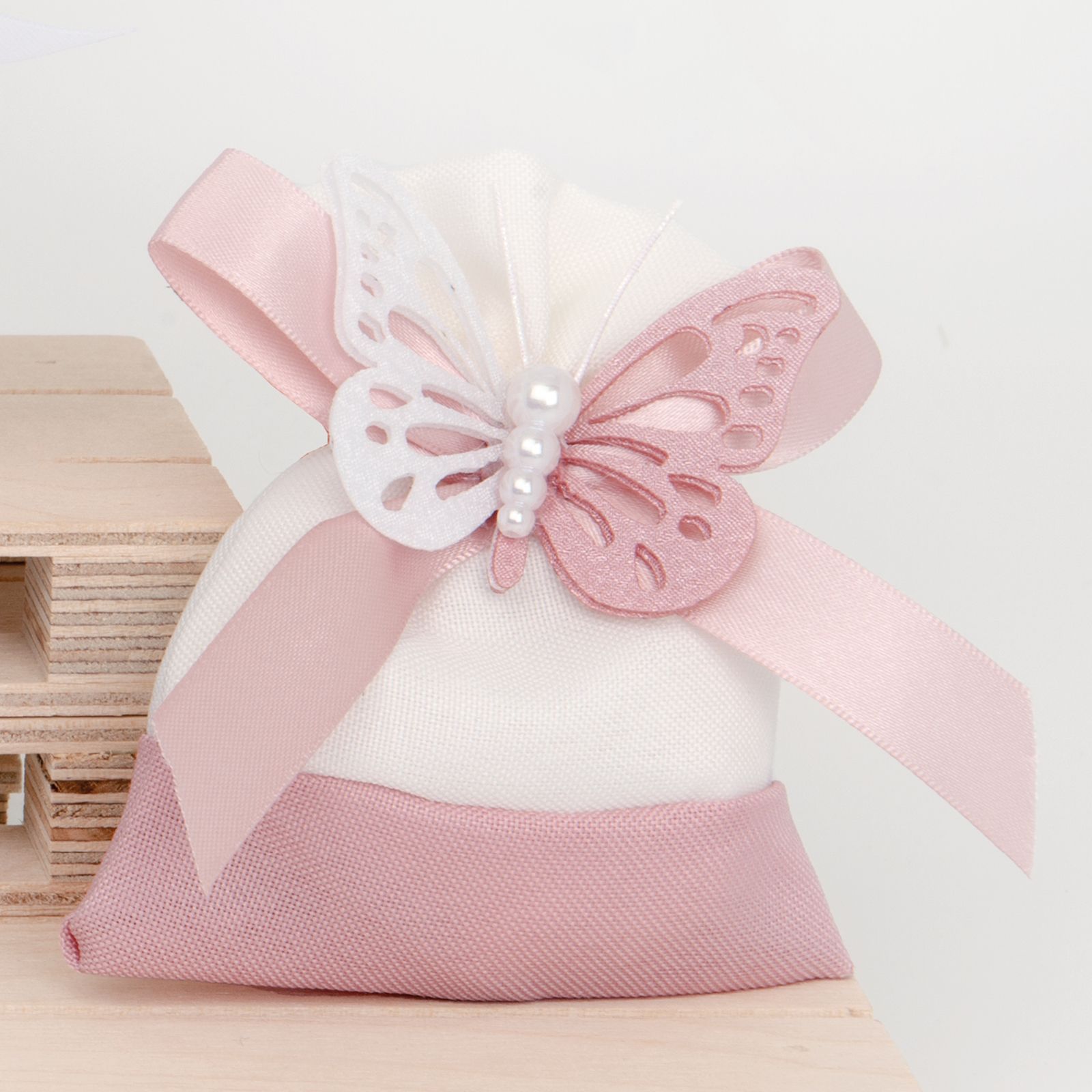 In occasione di eventi speciali come comunione, cresima, matrimonio, anniversario o la nascita di una bimba, regalare un sacchettino portaconfetti con tiranti, fiocco e farfalla con perline centrali lascia un dolce ricordo ai vostri invitati.