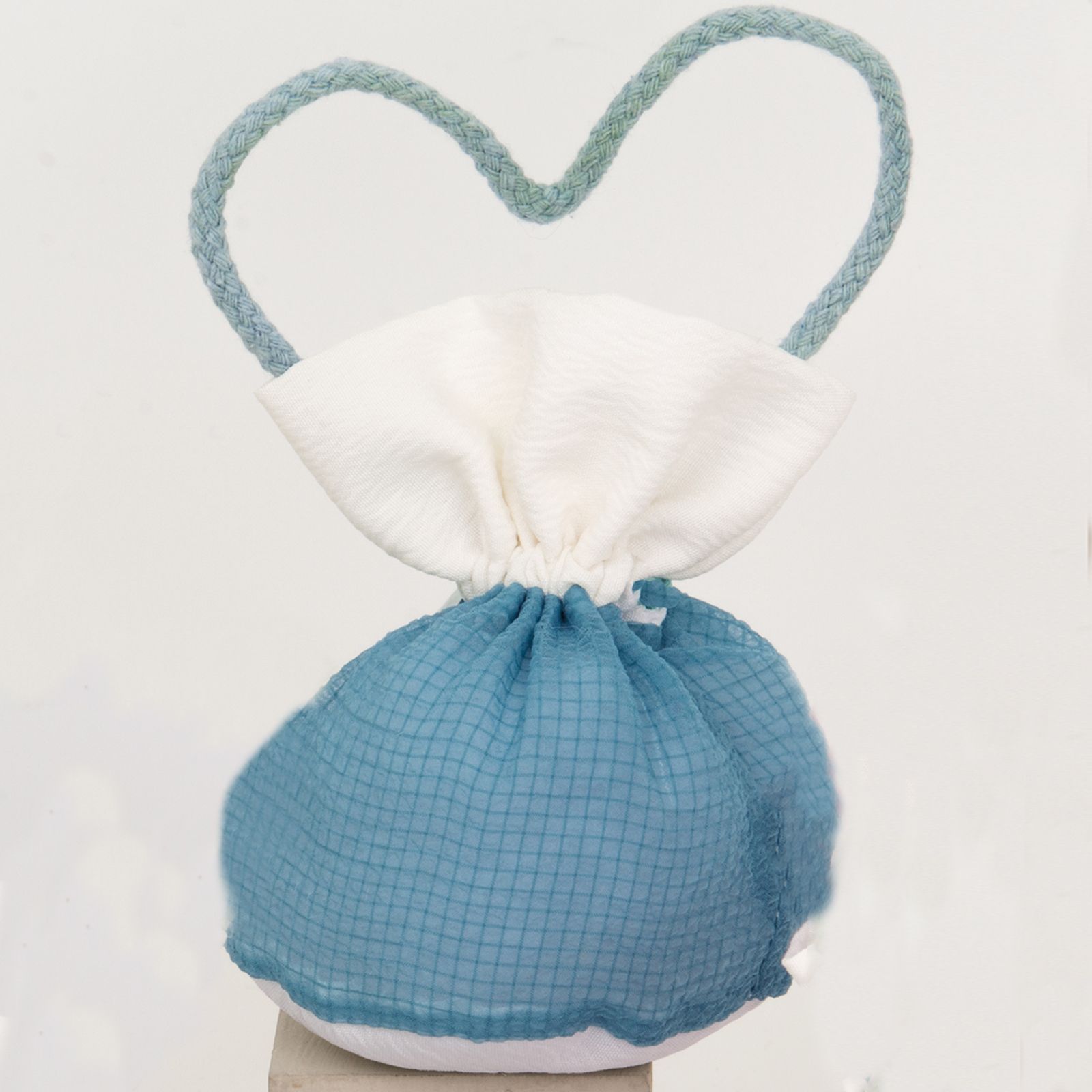 Con le sue dimensioni di circa 14 cm, questo sacchettino è disponibile nei colori celeste e bianco, perfetti per aggiungere un tocco di eleganza e raffinatezza alla tua bomboniera. Il design a palla con manico a forma di cuore lo rende un regalo unico e originale per i tuoi invitati.
