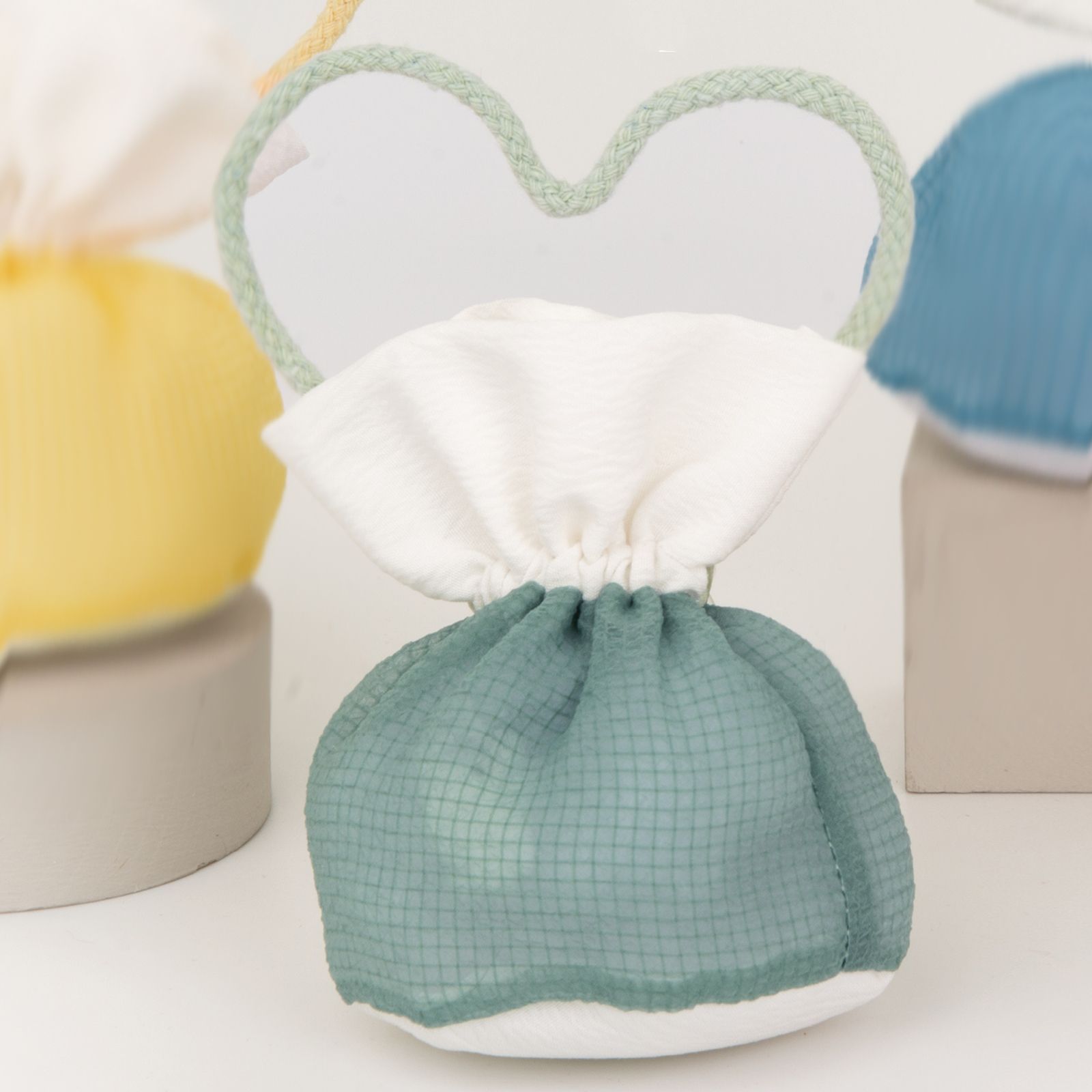 Con le sue dimensioni di circa 14 cm, questo sacchettino è ideale per contenere confetti, caramelle o piccoli regali da regalare ai tuoi ospiti. Il design a palla con manico a forma di cuore lo rende un segnaposto raffinato e delicato, perfetto per aggiungere un tocco di eleganza alla tua tavola.