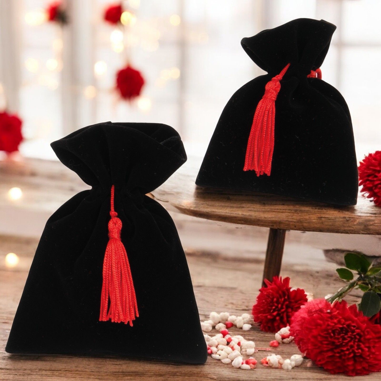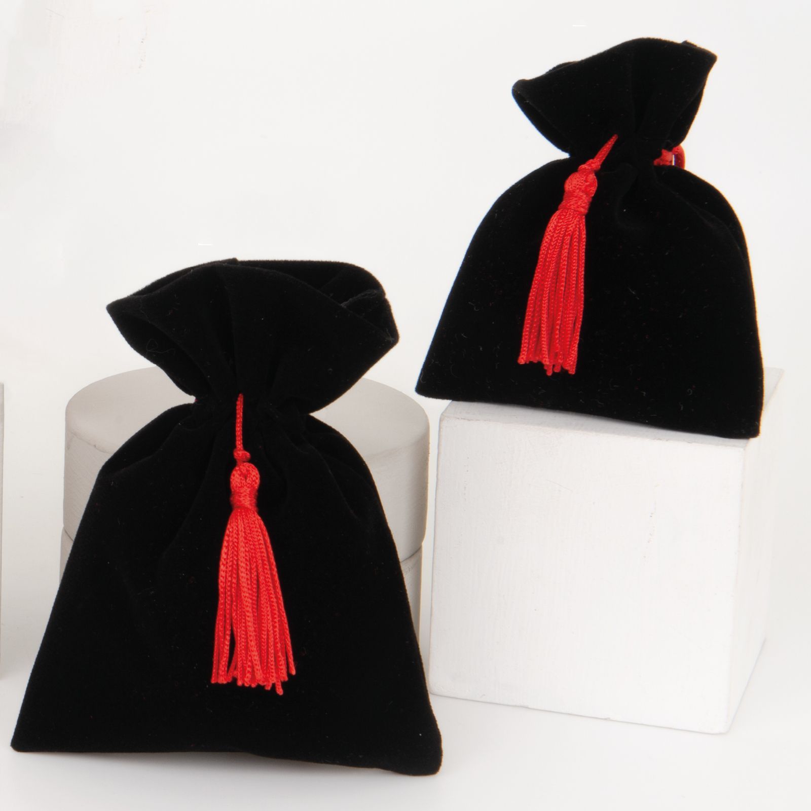 Nella vasta gamma di bomboniere disponibili nel nostro negozio, il sacchettino per confetti con tiranti e nappina rossa è un'opzione elegante e raffinata per festeggiare la laurea di un ragazzo o di una ragazza. Realizzato in pregiato velluto nero, questo sacchettino è disponibile in due dimensioni: standard (8 x 10 cm circa) e grande (10 x 13 cm circa).
