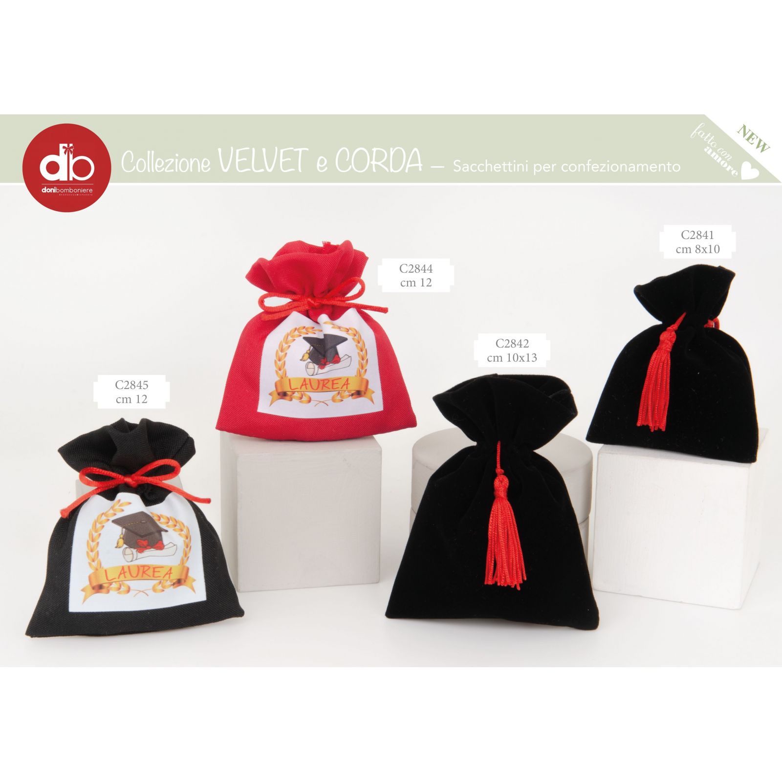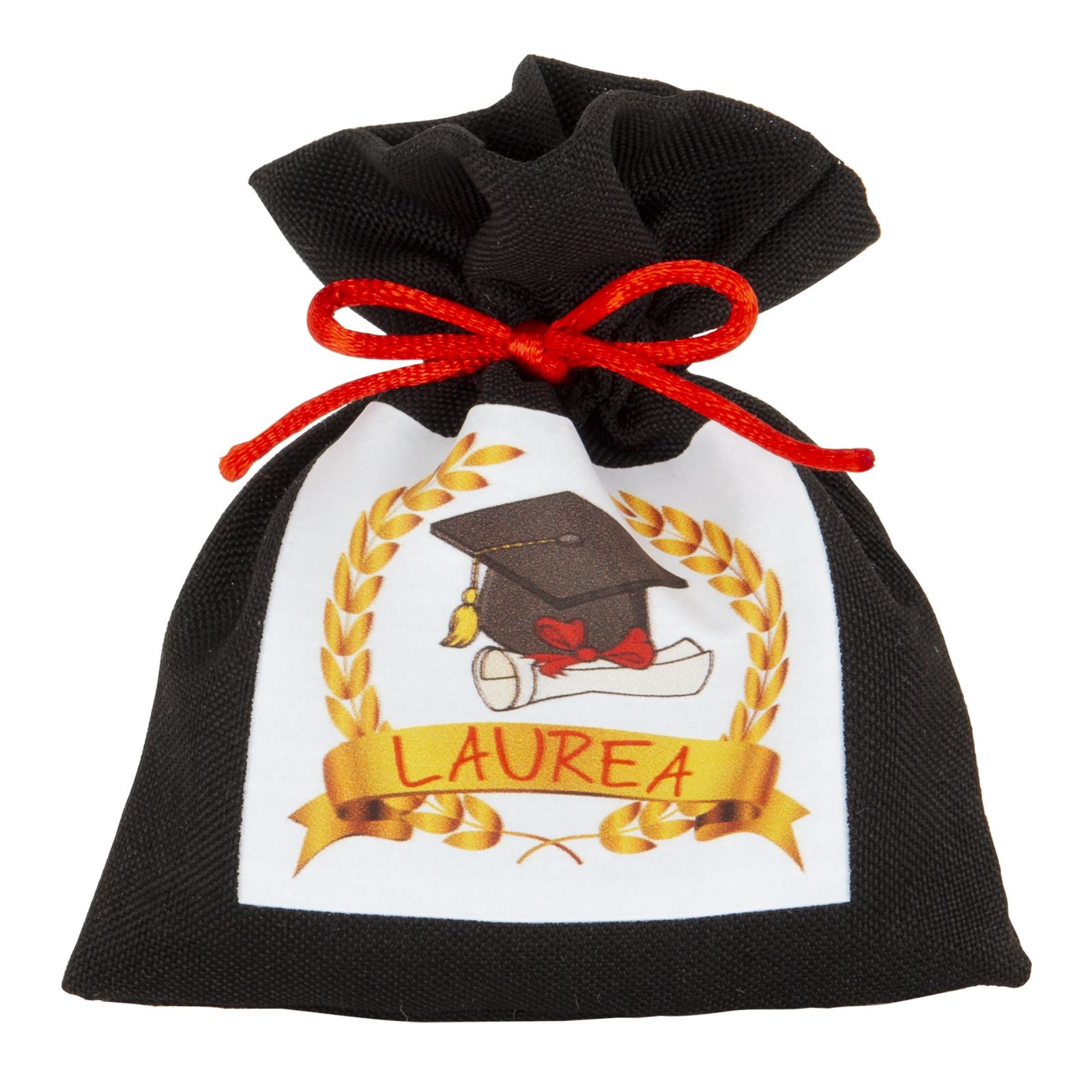 Il contrasto tra il nero del sacchettino e il fiocco rosso conferisce un tocco di eleganza e originalità che renderà questo regalo ancora più apprezzato dai destinatari. Regalare questa bomboniera significa condividere con gli invitati un momento di gioia e gratitudine per la loro presenza e sostegno durante il percorso di studio.