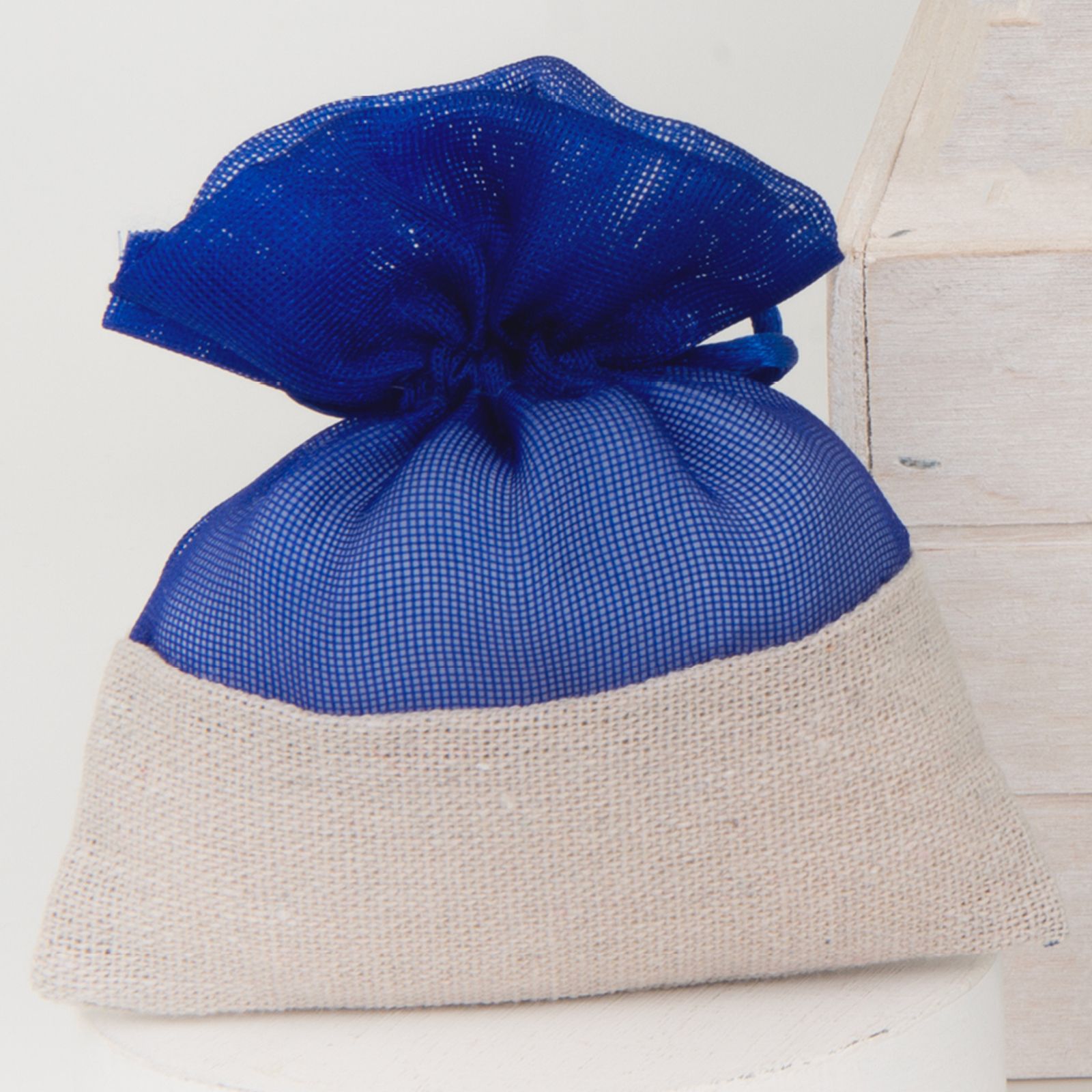 Realizzato in cotone di alta qualità, questo sacchetto portaconfetti ha delle dimensioni di circa 10 x 12 cm e presenta un design bicolore in blu e beige, che si adatta perfettamente a qualsiasi tipo di allestimento. Ideale come segnaposto o per confezionare i tuoi confetti in modo elegante.