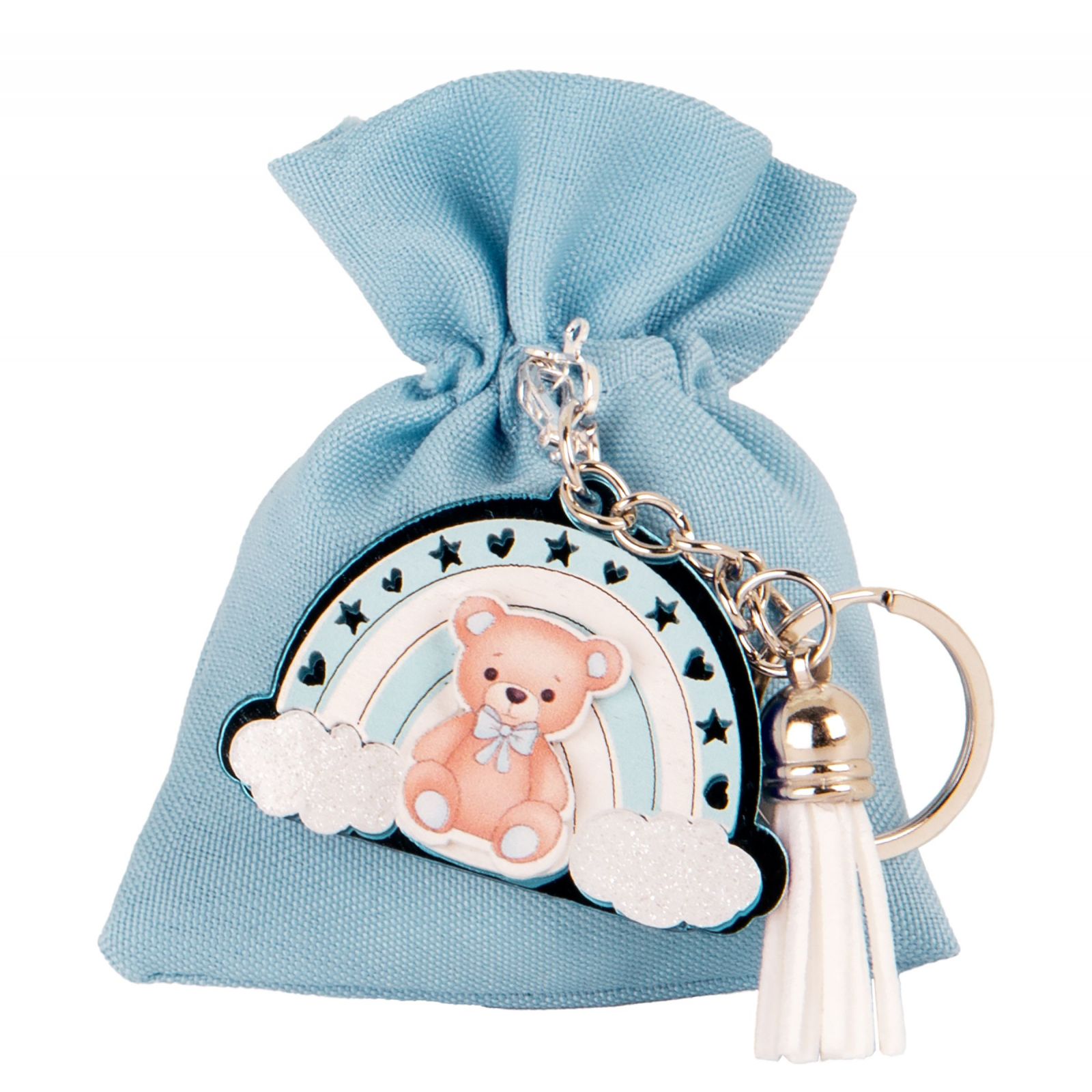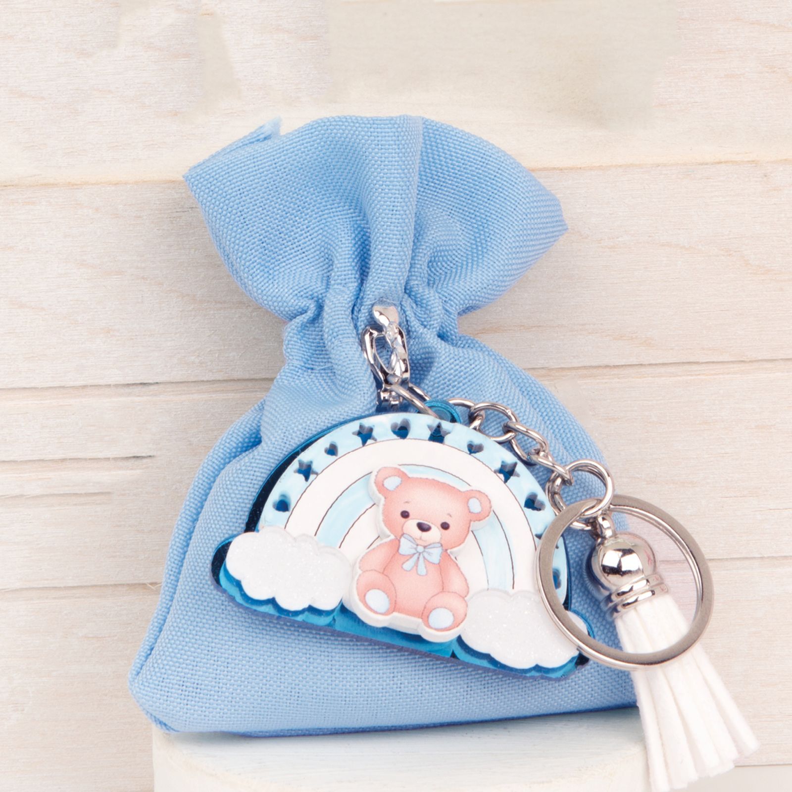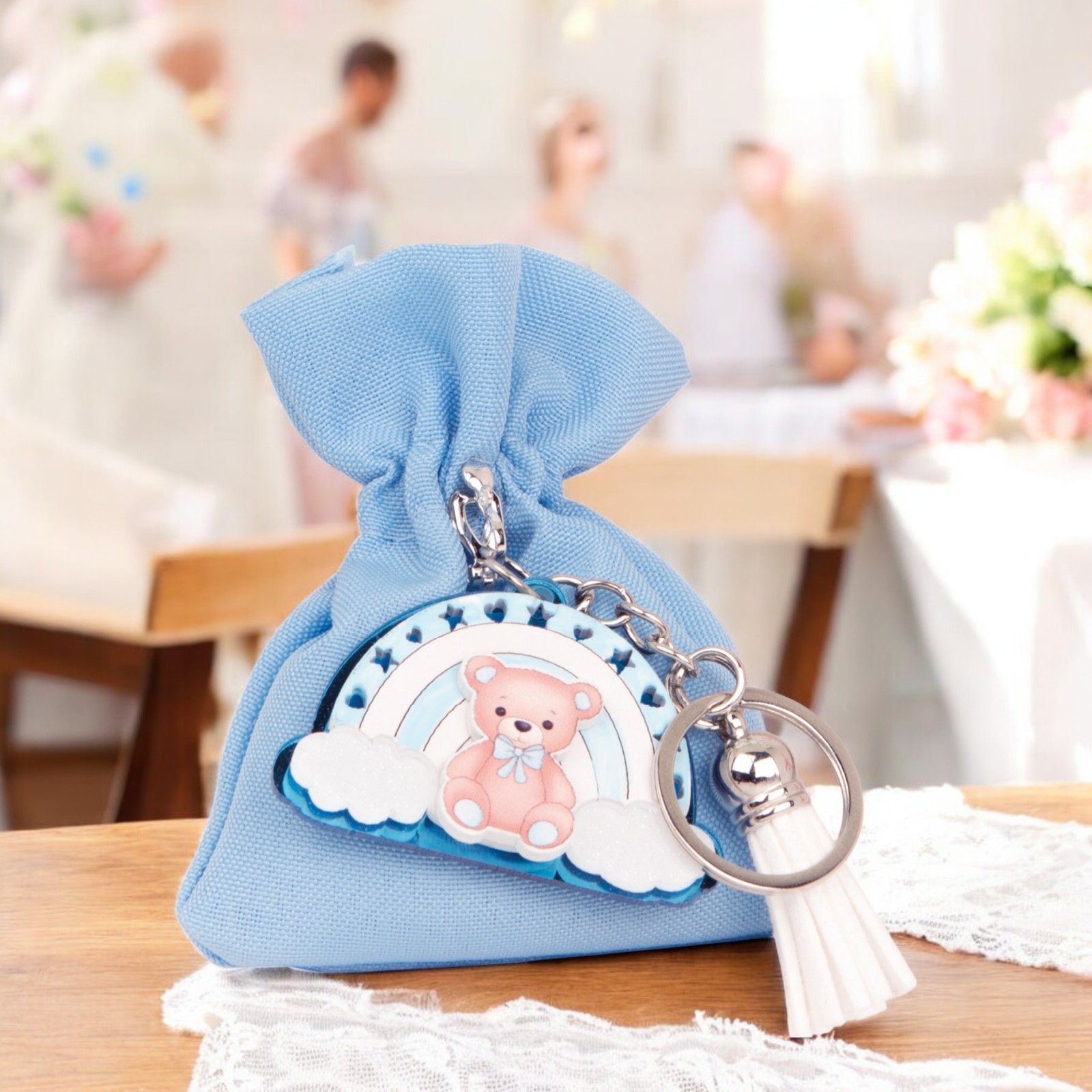 Realizzato in colori celeste e legno, questo sacchettino è composto da un portachiavi adorabile a forma di orsetto con un arcobaleno e una nappina bianca. Le dimensioni del sacchetto sono di circa 10 cm, mentre il portachiavi misura circa 9 cm, rendendolo perfetto per essere appeso a chiavi o zaini come segnaposto ricordo della tua festa.