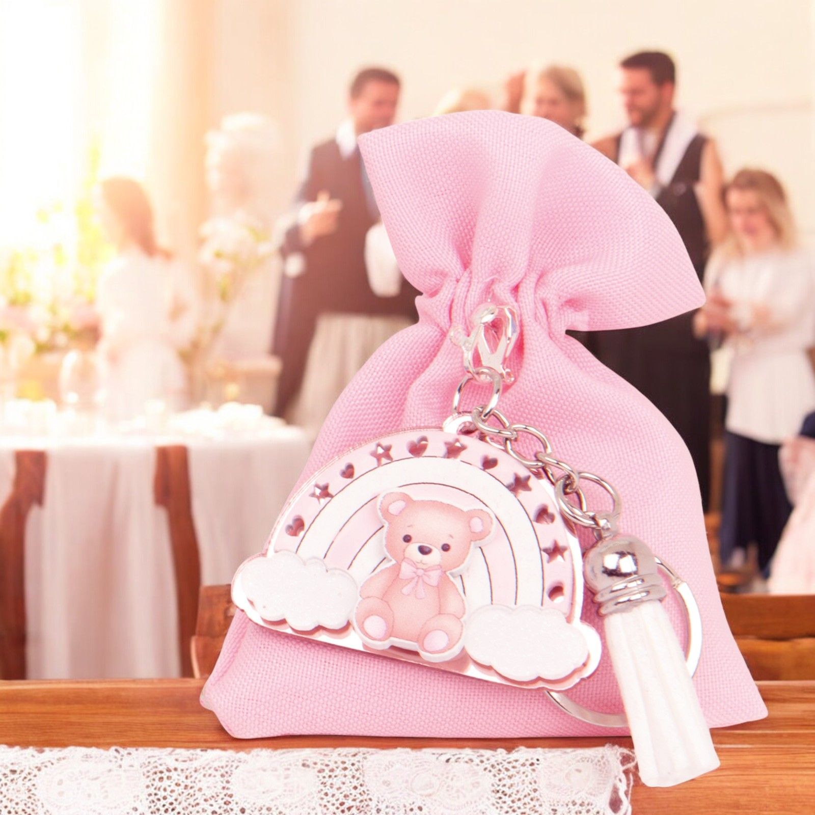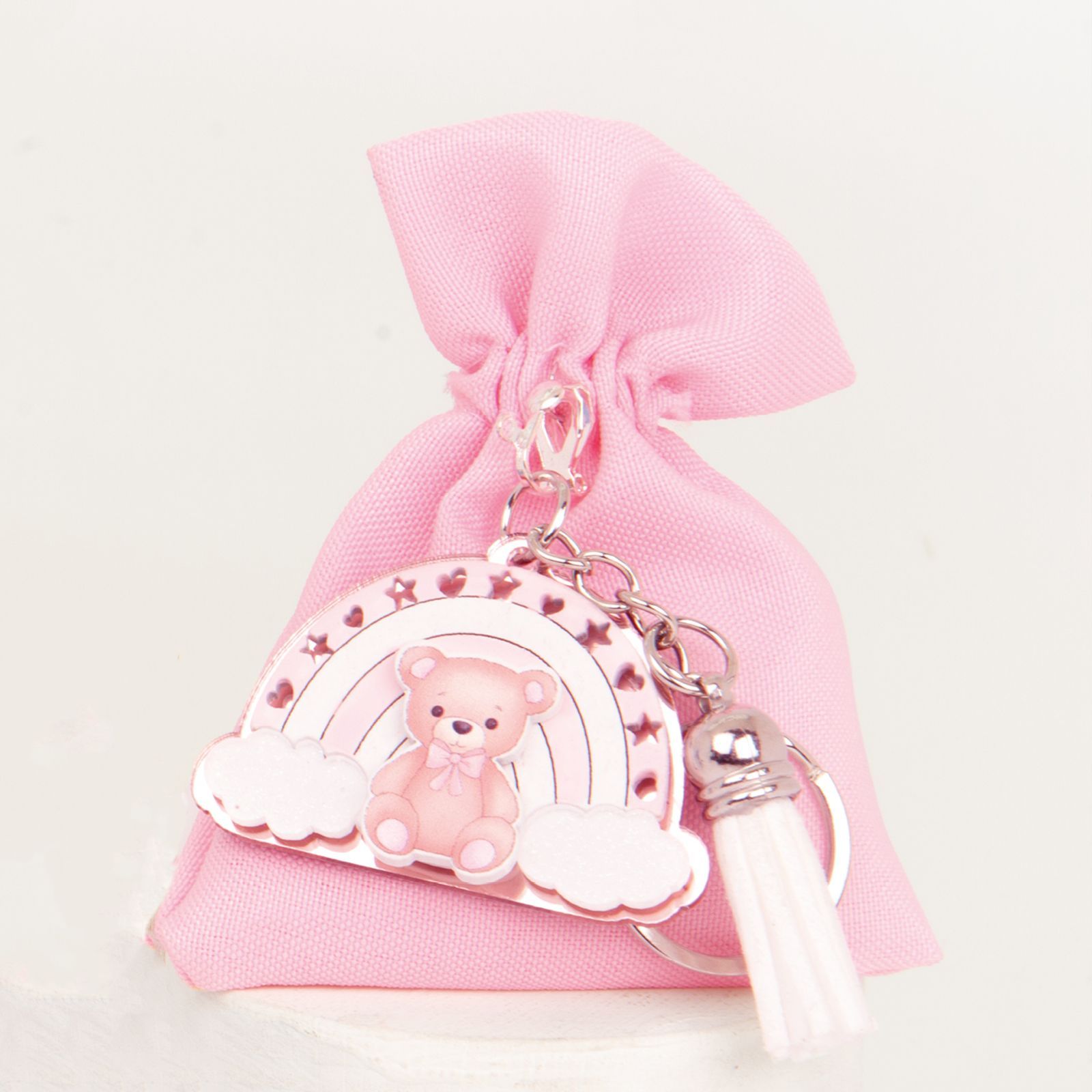 Non perdete l'occasione di sorprendere i vostri invitati con un regalo unico e originale. Acquistate ora la bomboniera Sacchettino portaconfetti con portachiavi a forma di orsetto e create un ricordo indelebile per tutti coloro che parteciperanno alla vostra cerimonia.