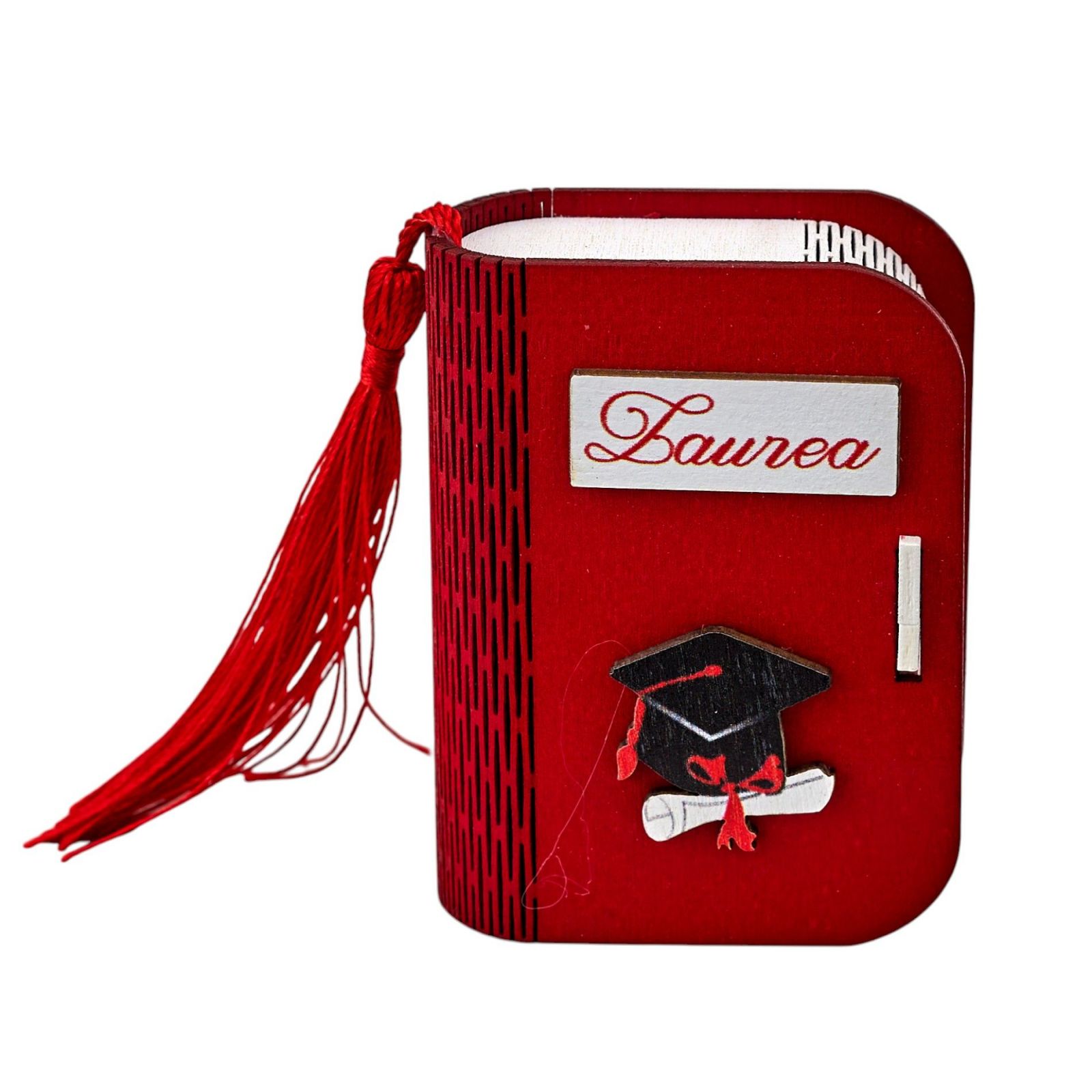 Festeggiate il vostro traguardo accademico con un dettaglio che non passa inosservato: una raffinata scatolina portaconfetti in legno di colore rosso, impreziosita da una nappina coordinata e decorata con il classico tocco e la pergamena. Perfetta per celebrare la vostra laurea con un accessorio elegante e ricco di significato, ideale per tutte le facoltà, da ingegneria a economia e infermieristica.