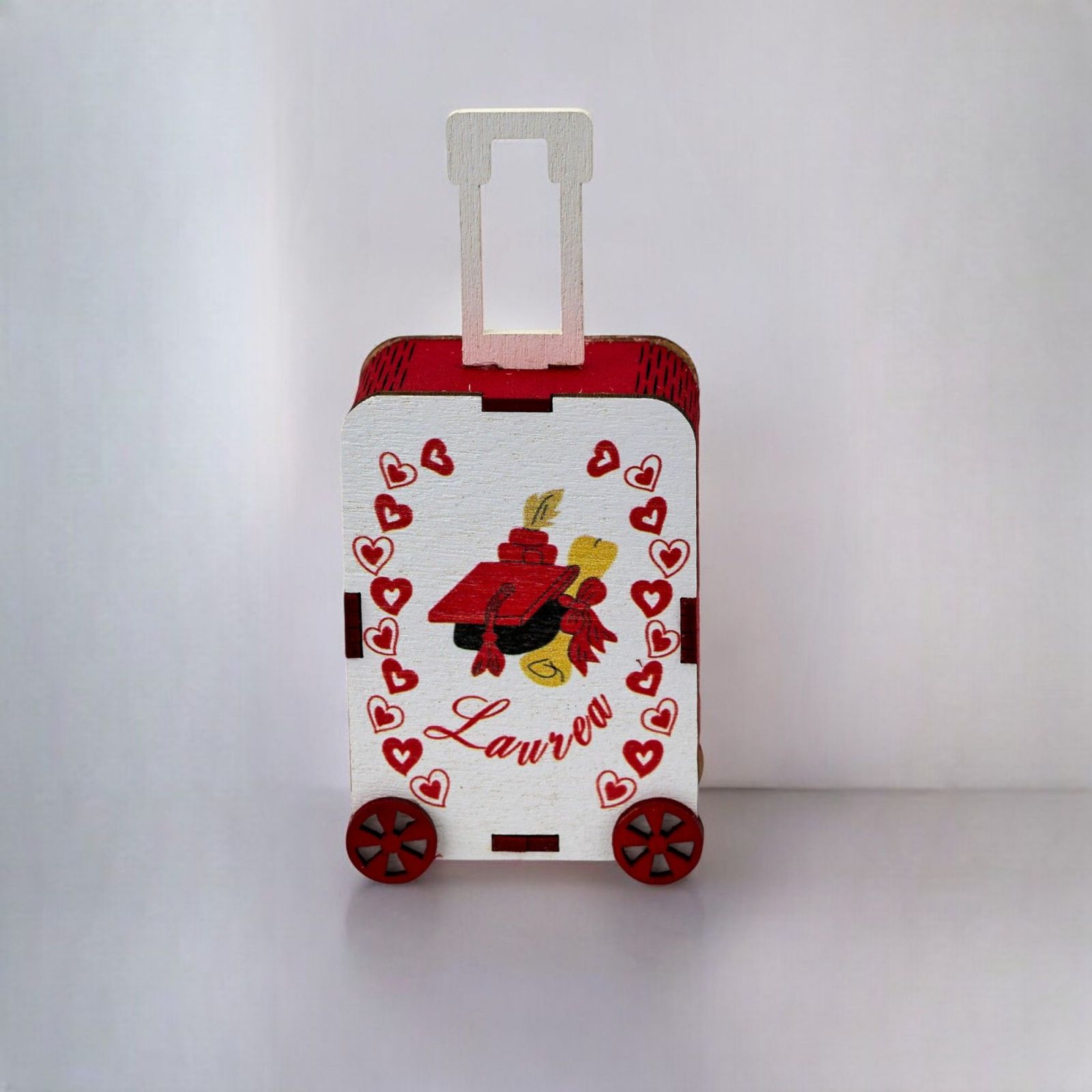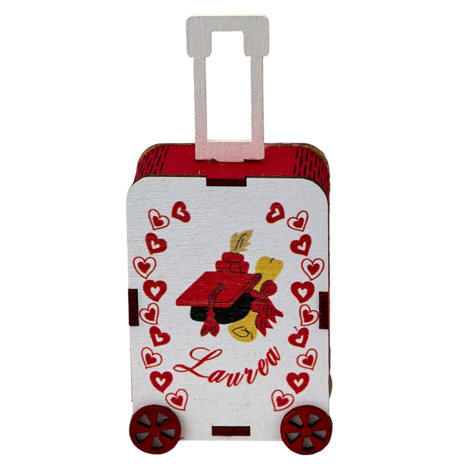 Questa bomboniera particolare e originale è perfetta per celebrare la laurea di un caro amico o familiare. Realizzata in legno, ha dimensioni di 7,5 x 5 x 3 cm circa e presenta un design a forma di trolley con una scritta "laurea" e una pergamena. Il colore rosso e bianco conferisce un tocco elegante e festoso a questo gadget che sicuramente sorprenderà gli invitati.