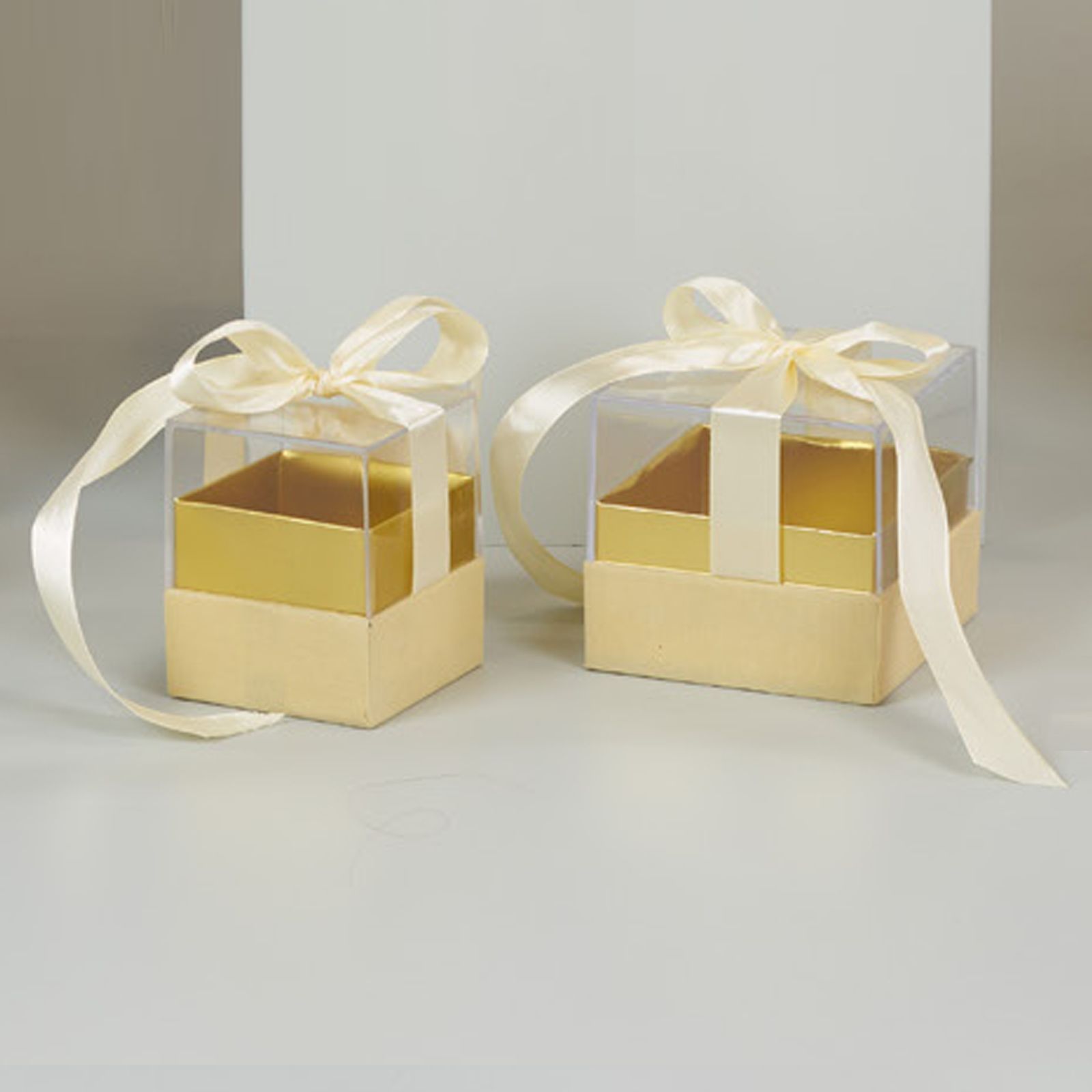 Scatole confezione bomboniere eleganti e raffinate per rendere speciale il tuo evento. Questa scatolina trasparente con base color oro e fiocco bianco è perfetta per matrimonio, anniversario, comunione o cresima. Disponibile in due misure: Standard (6 x 6 x 6 cm circa) e Grande (8 x 8 x 8 cm circa).