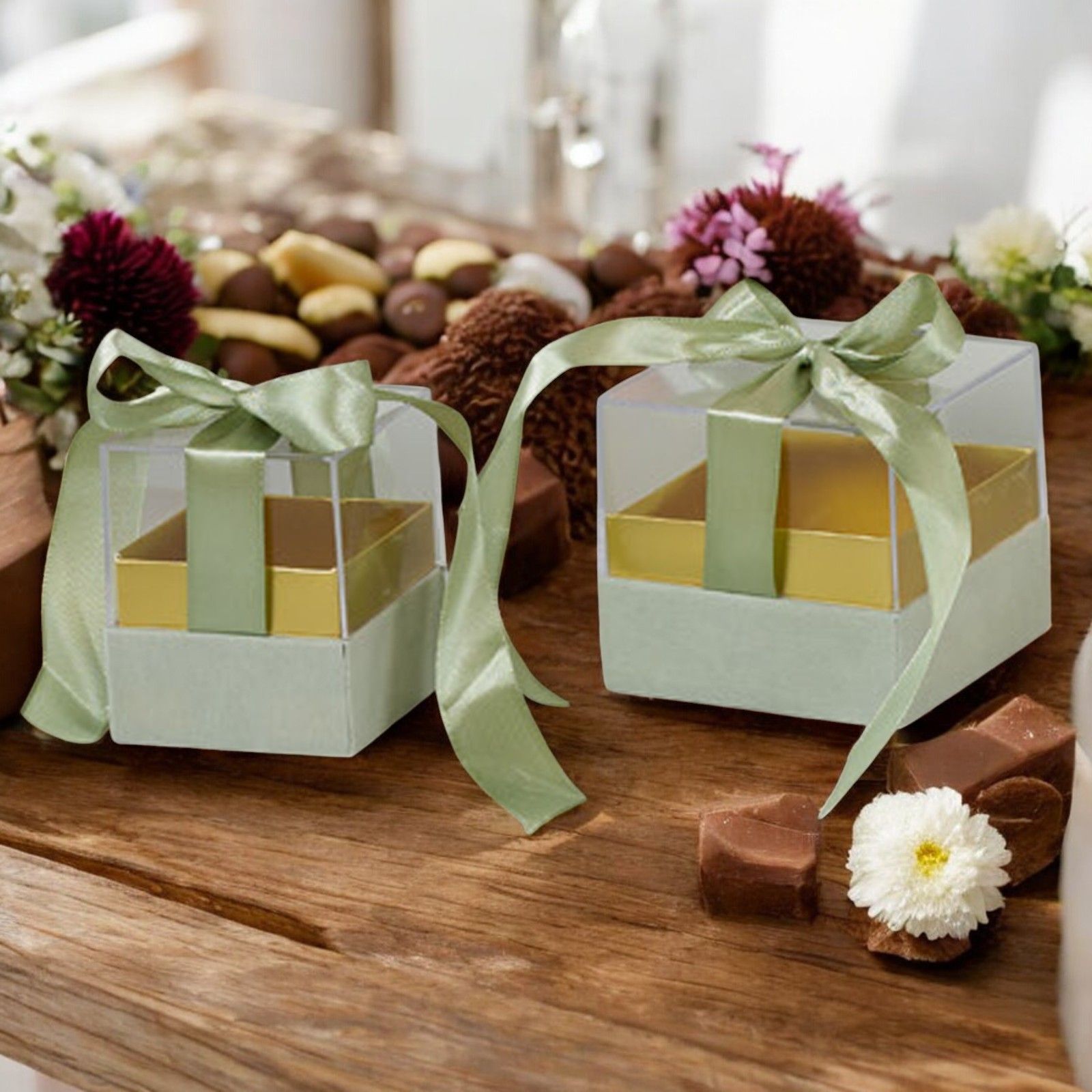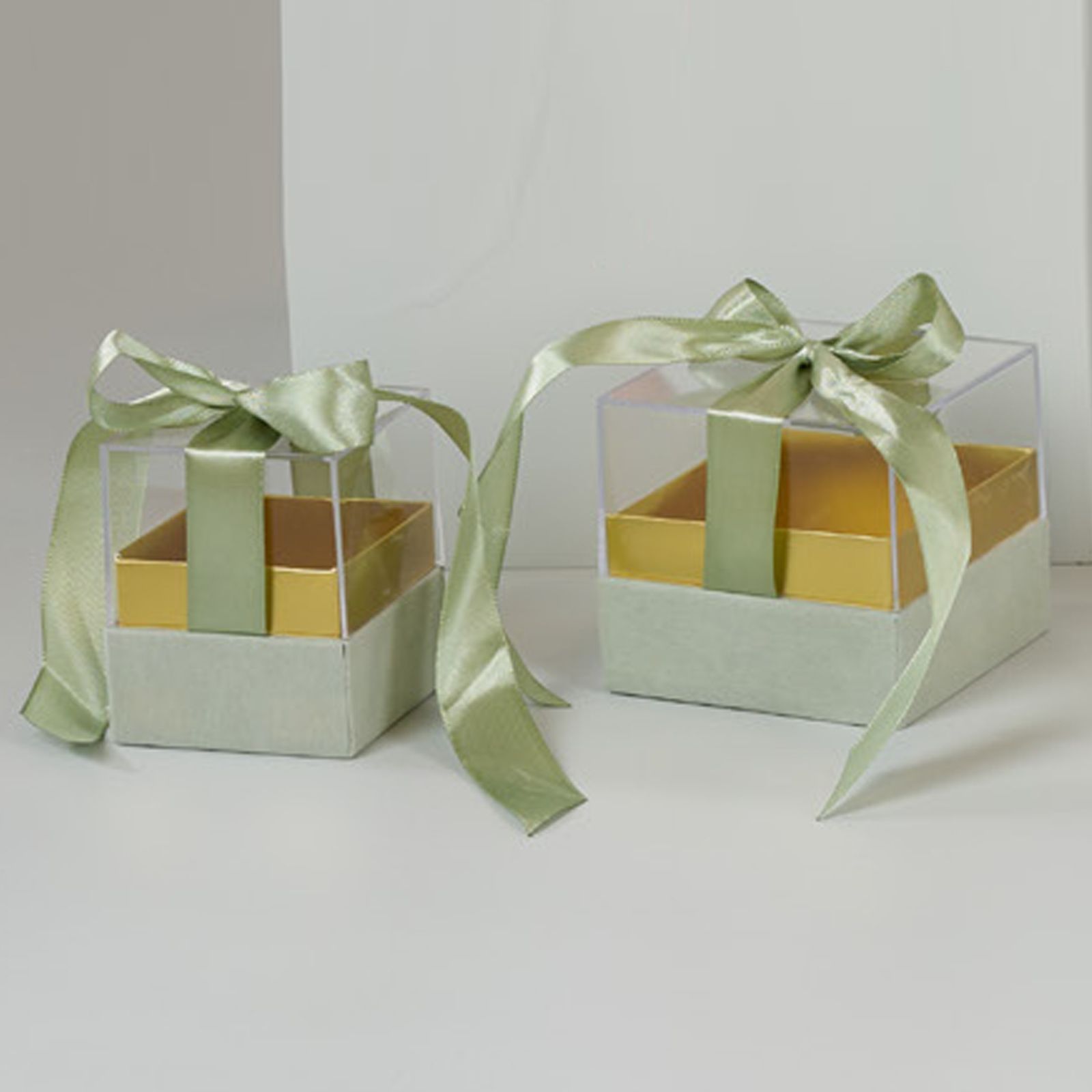 Con il suo fiocco bianco e la base color oro, questa scatolina è perfetta per contenere confetti o piccole bomboniere da regalare agli invitati. Il design trasparente permette di mostrare il contenuto in modo elegante e raffinato.