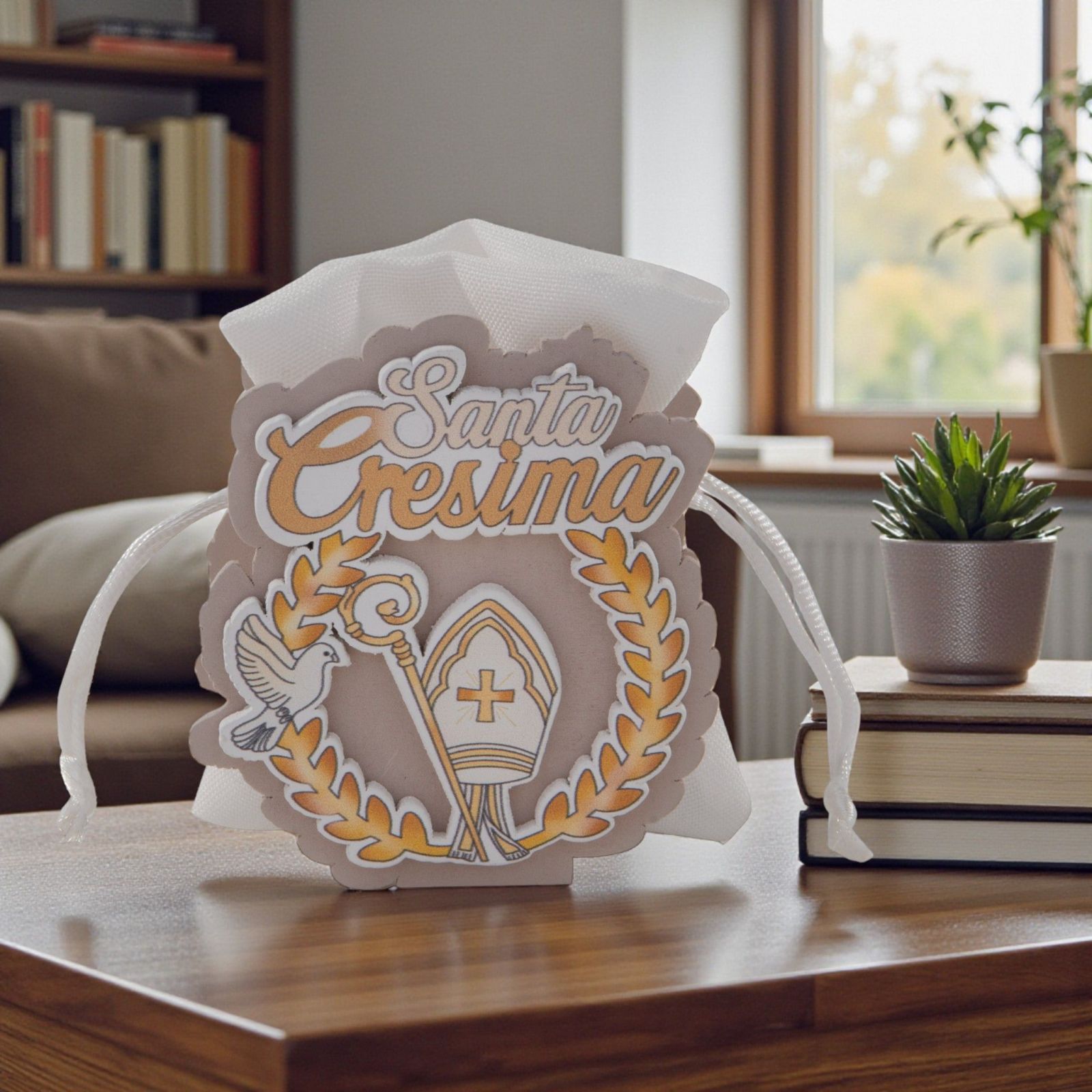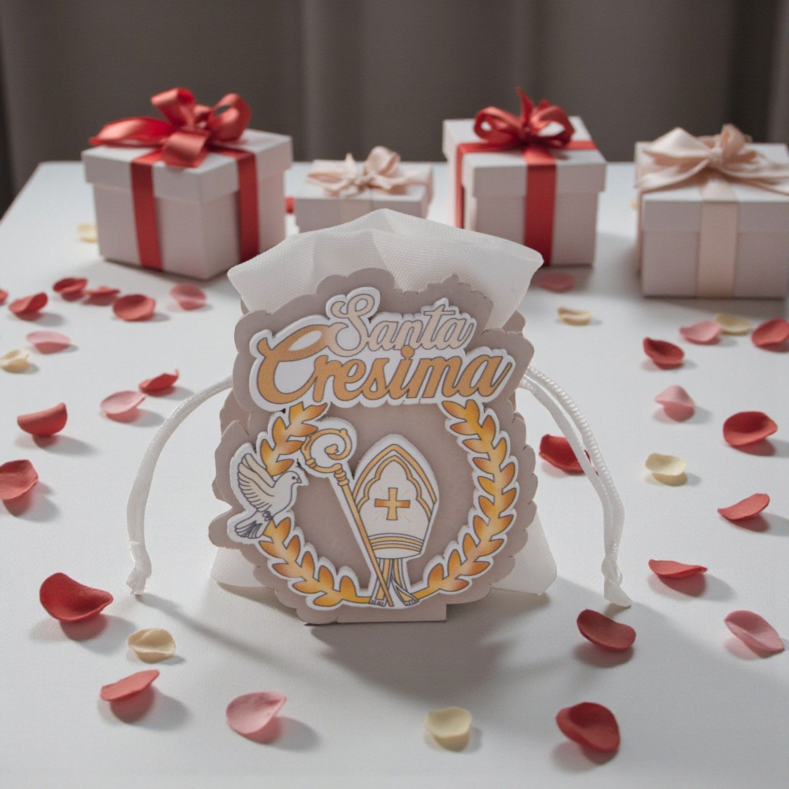 Festeggia la Santa Cresima con questa raffinata scatolina portaconfetti, completa di sacchetto con tiranti e decorata sul davanti con simboli sacri e la scritta “Santa Cresima”. Ideale come portaconfetti originale o come piccolo pensierino cresima per gli invitati, combina eleganza e praticità in un dono che resterà nel cuore di chi lo riceve.