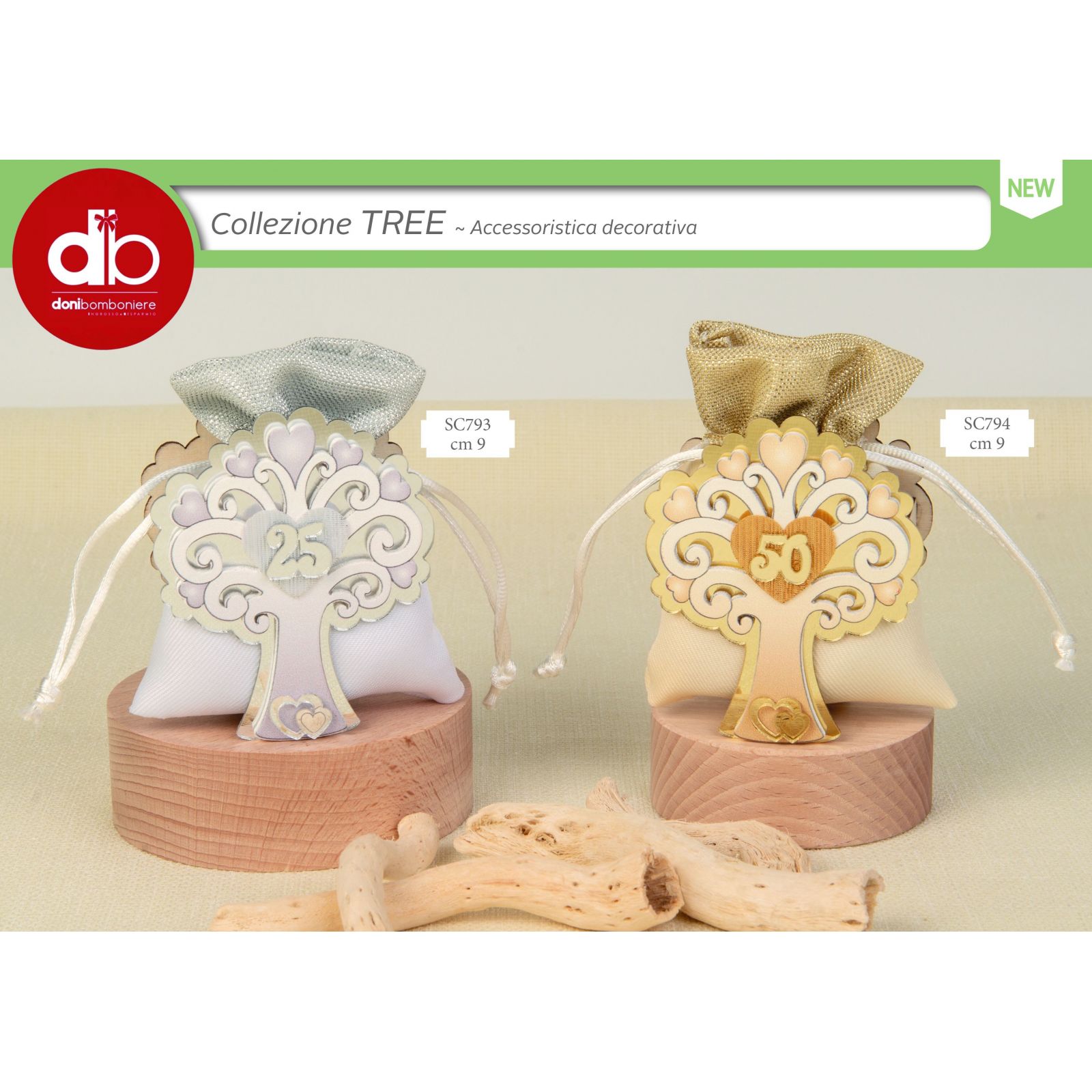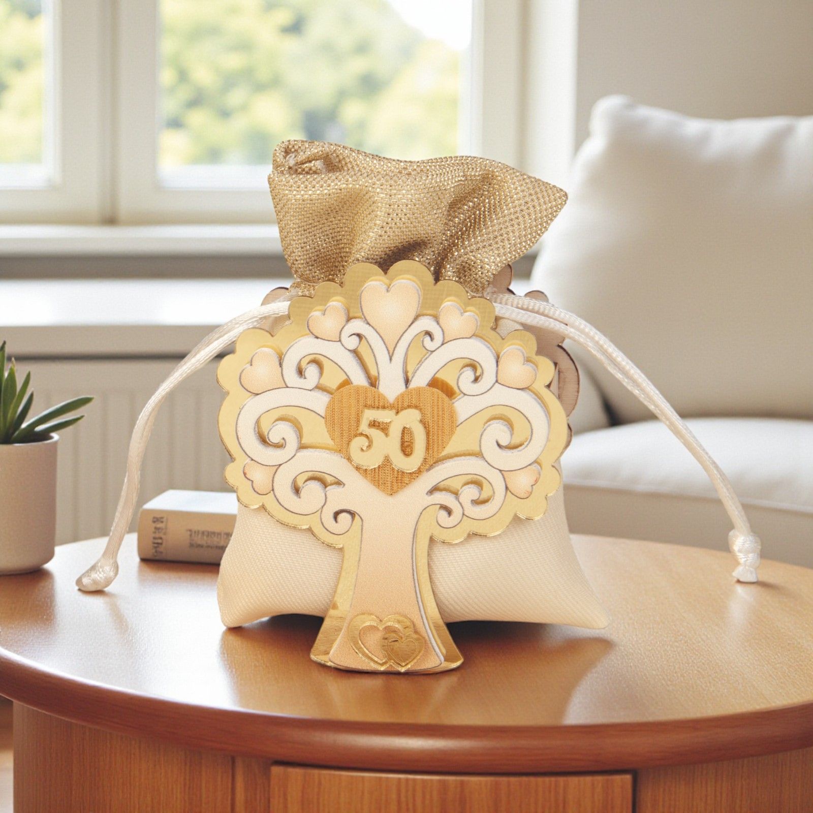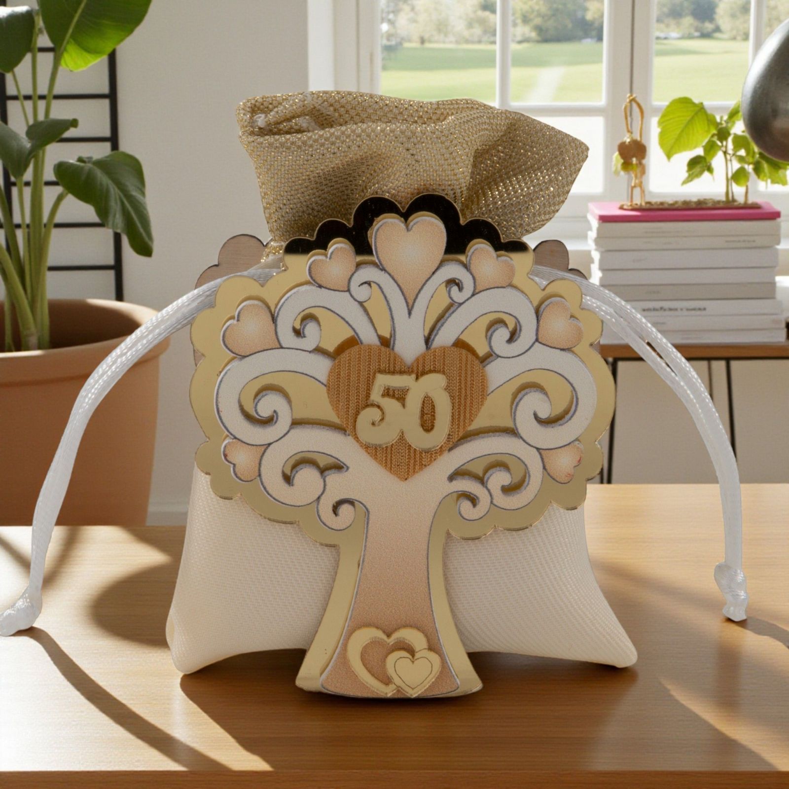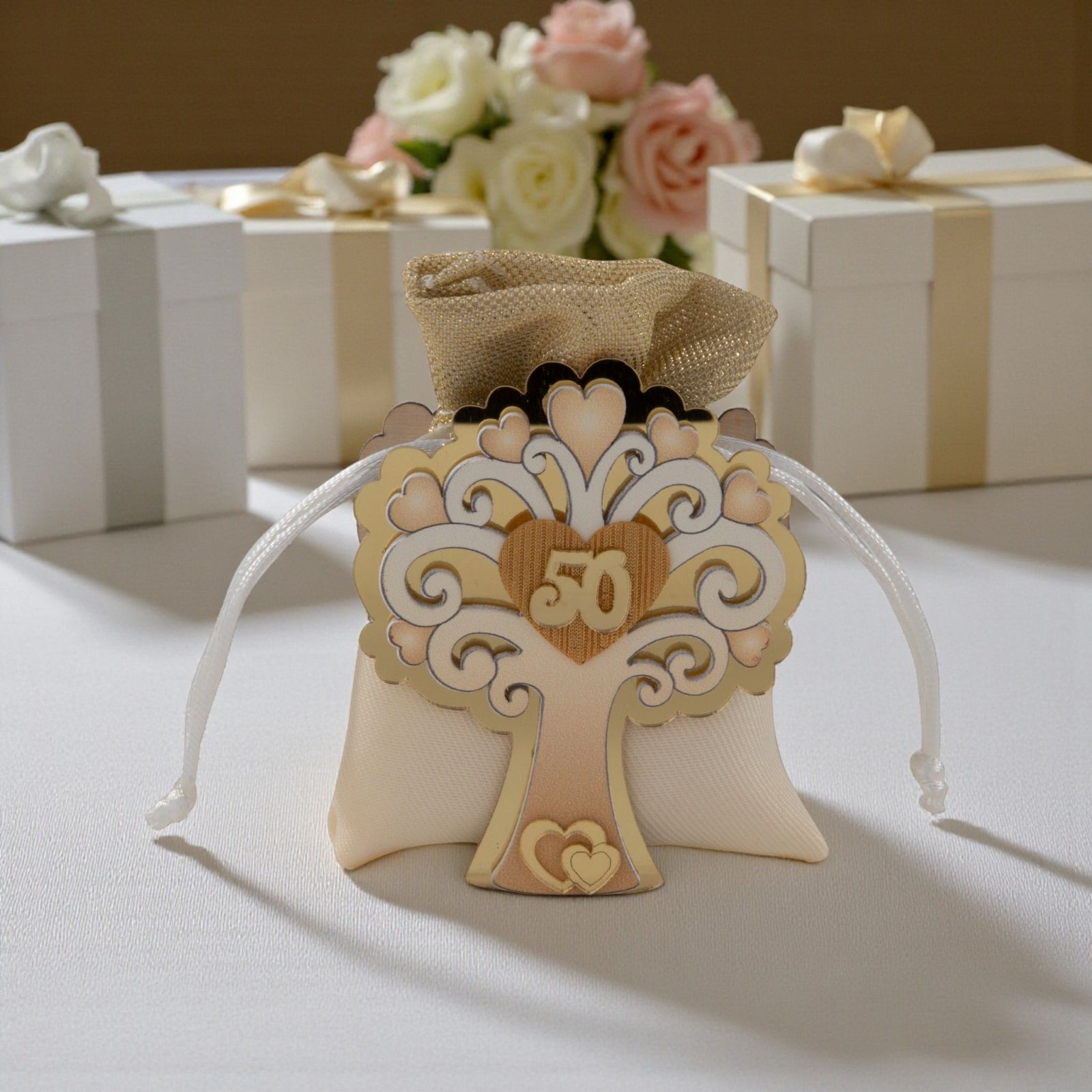 Rendi memorabile il 50° anniversario con questa raffinata scatolina per confetti a forma di albero della vita, impreziosita da foglie a forma di cuore e dal numero 50 al centro. I dettagli dorati e il sacchettino coordinato oro e bianco trasformano la confettata nozze oro in un momento elegante e ricco di significato per tutti gli invitati.