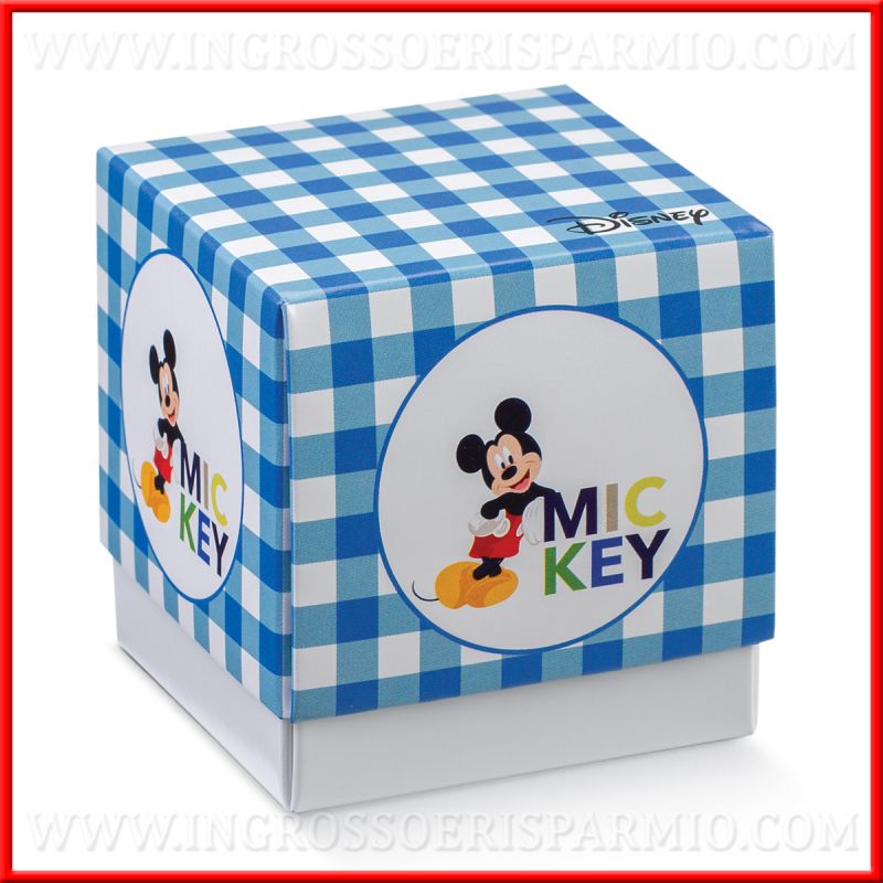 Astucci / scatoline per confetti firmate Disney, realizzate in cartoncino, composte da fondo bianco e coperchio decorato: fantasia a quadretti bianchi e celesti e Topolino con scritta "Mickey" raffigurato su tutti i fronti della scatoletta porta confetti.