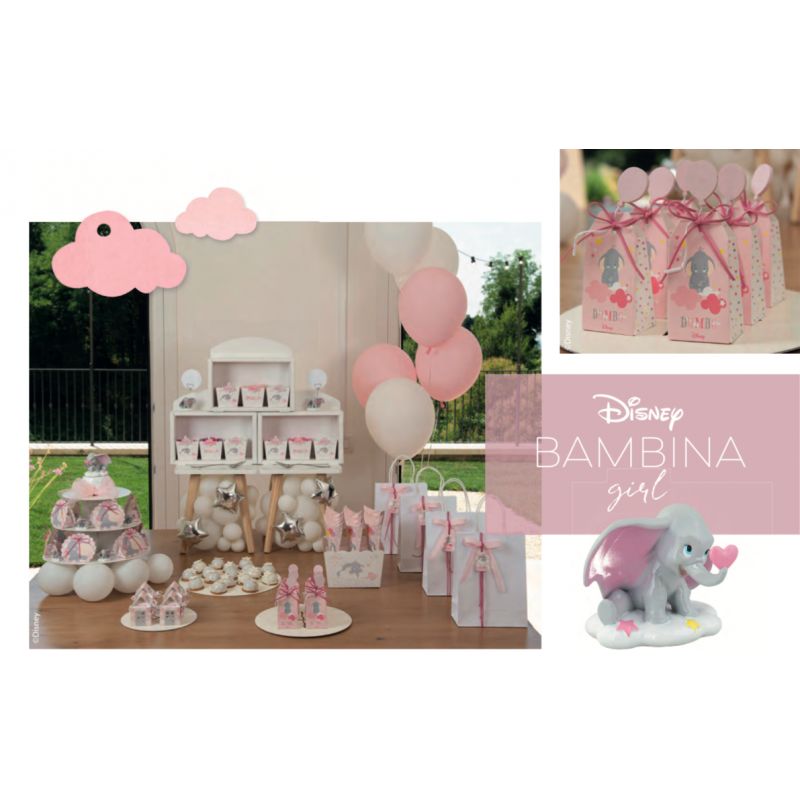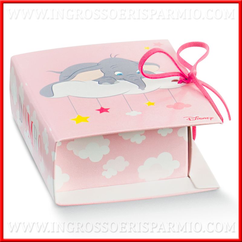 Scatoline portaconfetti rosa, realizzate in cartoncino lucido, a forma di libro, su cui è disegnato Dumbo, personaggio dei cartoni Disney, su di una nuvola bianca, da cui pendono delle stelline e delle piccole nuvole. Sul retro della scatola per confetti, vi è la scritta "Up up in the clouds" con stelline e palloncini, mentre la parte laterale è decorata con tante nuvole bianche e rosa e la scritta "DUMBO". Il libro portaconfetti si chiude grazie a dei fori presenti sulla copertina anteriore e su quella posteriore, dal quale far passare un nastrino (NON INCLUSO).