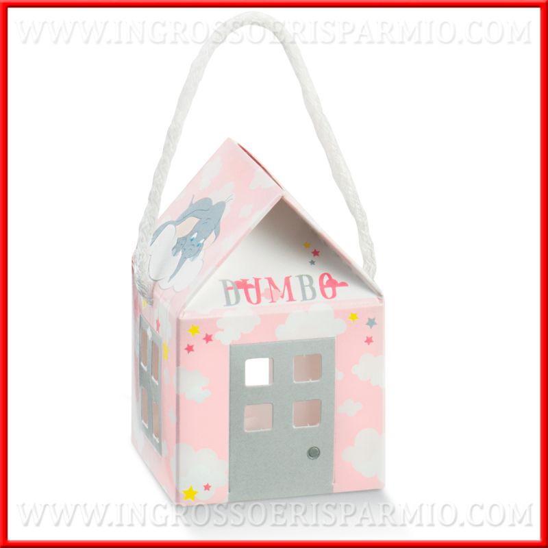 Scatolette per confetti a forma di casetta di Dumbo, in cartoncino lucido di colore rosa, con cordoncino bianco, decorata con nuvole e stelline, sul cui tetto è raffigurato il simpatico elefantino. La scatolina porta confetti nascita, presenta delle finestrelle intagliate su tutti i quattro lati.