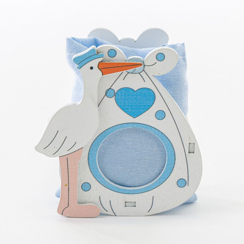 Il porta confetti è realizzato con una struttura rigida in legno con la rappresentazione di una cicogna con il suo sacco nei colori del celeste e bianco. All'interno è posizionato un elegante sacchetto in tessuto azzurro nel quale includere i confetti.