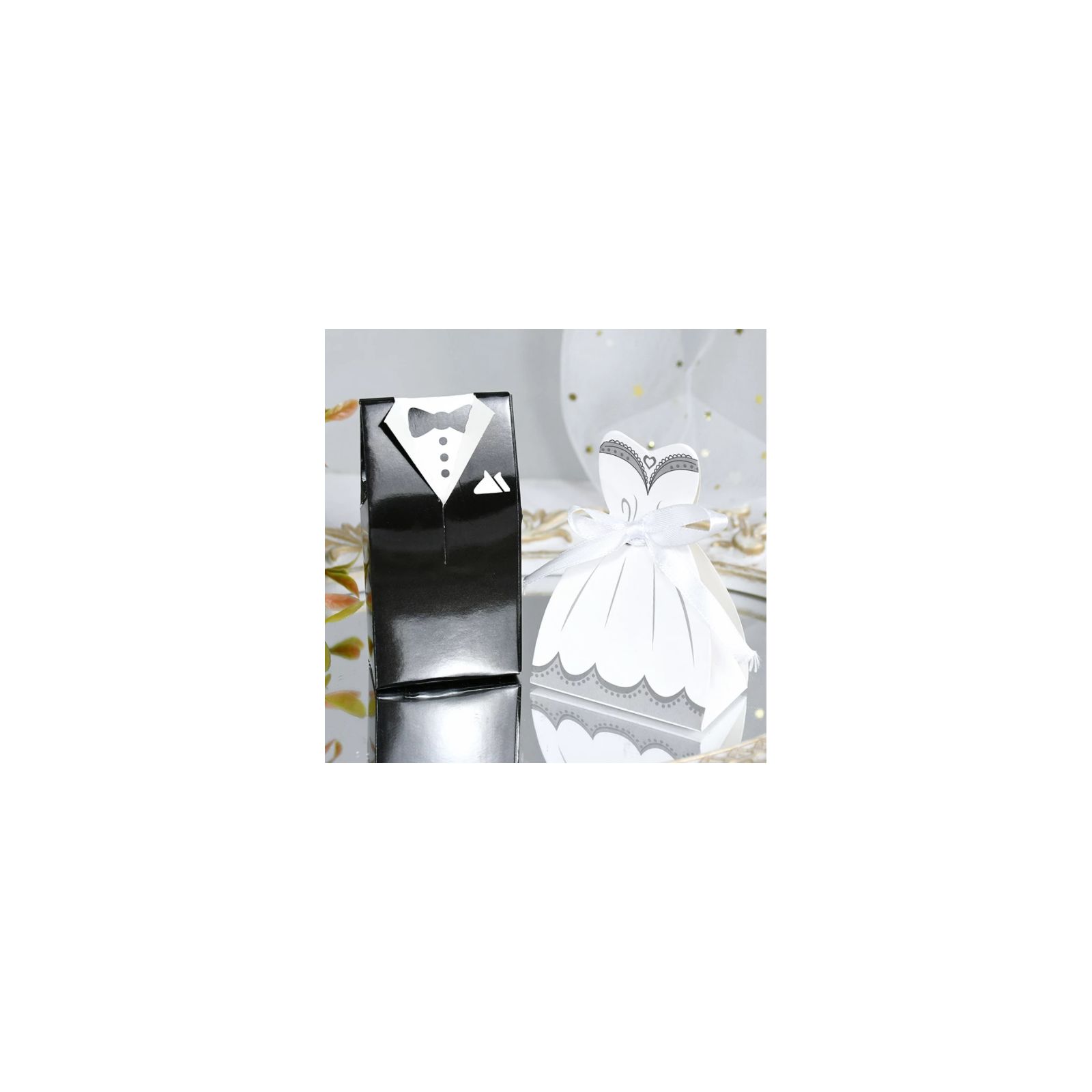 Subito disponibili per te queste simpatiche scatoline in cartoncino a forma di abito da sposa e smoking da sposo nei classici colori del bianco per lei e nero/bianco per lui. Entrambe le scatoline possono contenere all'interno confetti/caramelle e rimangono in piedi da sole.