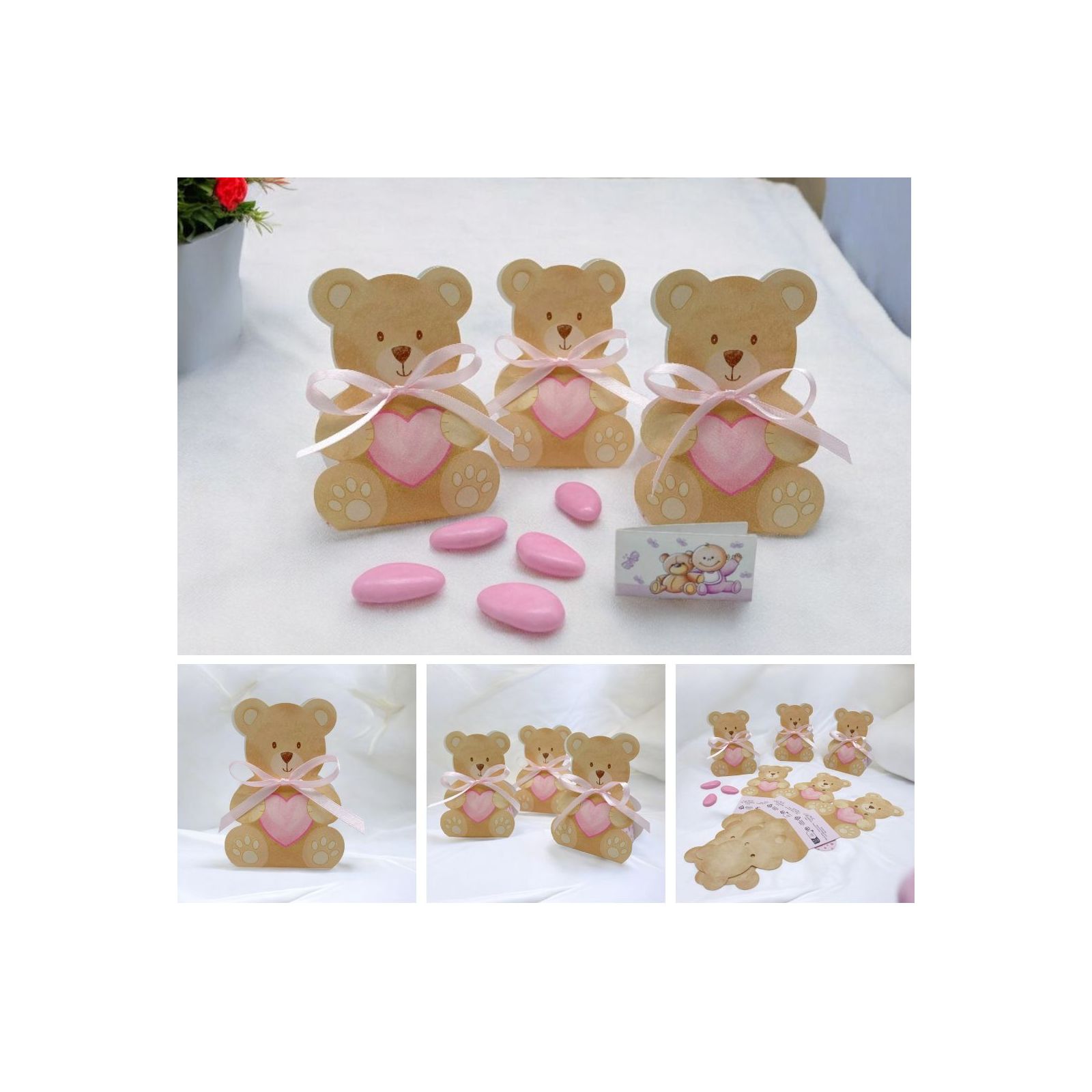 I laterali della scatolina sono decorati con uno sfondo rosa arricchito da cuoricini fucsia, mentre l'adorabile orsetto tiene fra le mani un cuore rosa,ideale per bambine, simbolo dell'amore e dell'affetto.