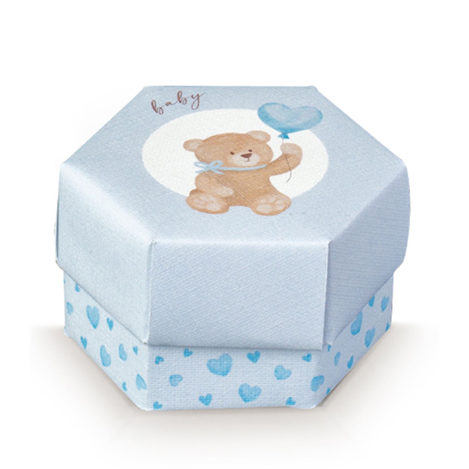 Realizzato in cartoncino celeste di alta qualità, made in Italy, il portaconfetti presenta una forma esagonale unica. Il coperchio è decorato con un tenero orsetto che regge un palloncino a forma di cuore e la scritta "Baby", mentre la base è abbellita da tanti piccoli cuoricini azzurri. Questi dettagli giocosi e dolci conferiscono un tocco speciale alla bomboniera, rendendola perfetta per festeggiare la gioia di un nuovo arrivo nella famiglia.