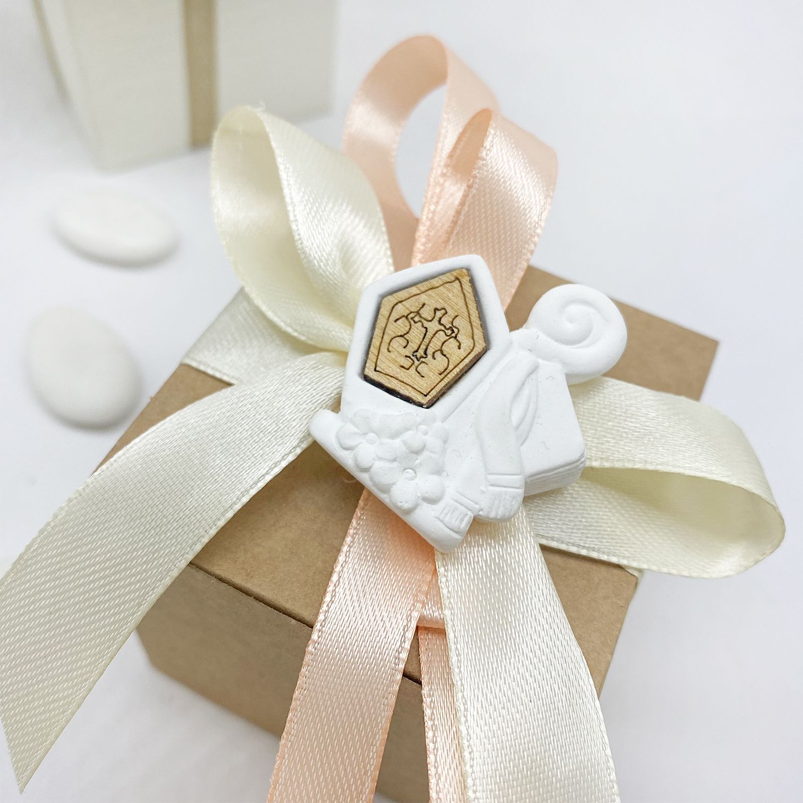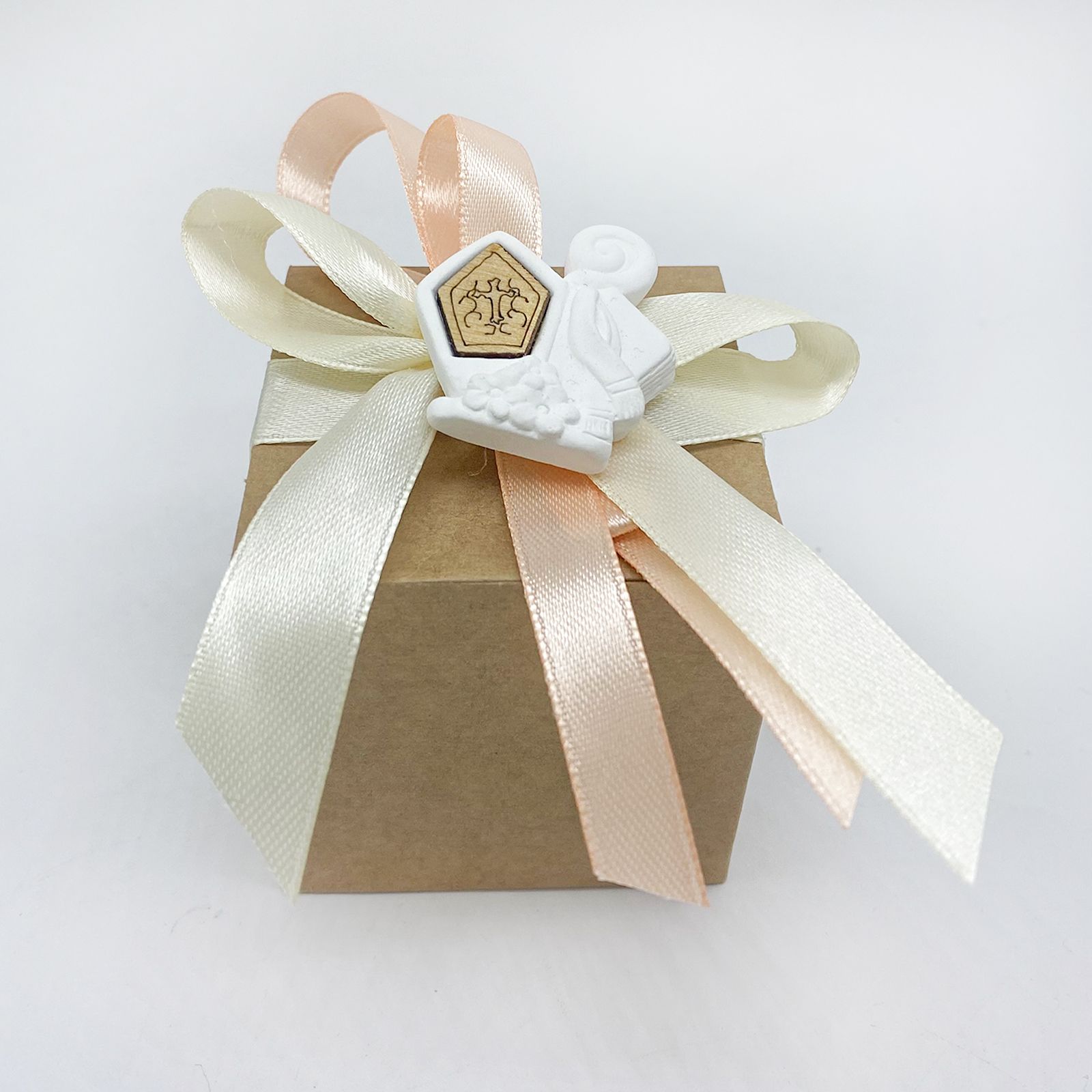 Questa scatolina avana, realizzata in resistente cartoncino, è un'elegante bomboniera a forma di cubo, perfetta per celebrare la cresima. La sua raffinata chiusura con un nastro color panna e un doppio fiocco avorio e rosa aggiunge un tocco di grazia. Sul fiocco è posizionato un gessetto rappresentante i simboli della cresima: mitra e pastorale, con un'incisione in legno raffigurante la croce. Il gessetto è decorato con piccoli fiori nella parte inferiore, aggiungendo un tocco delicato al regalo.