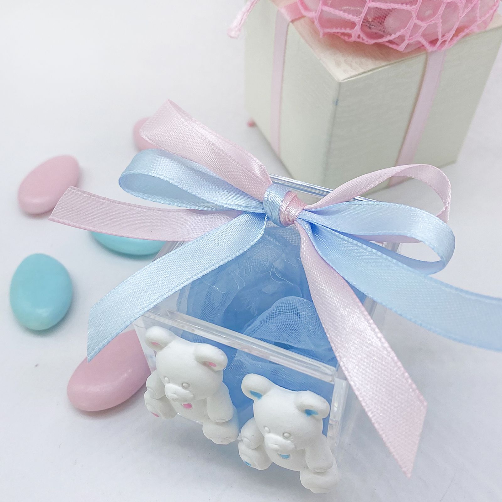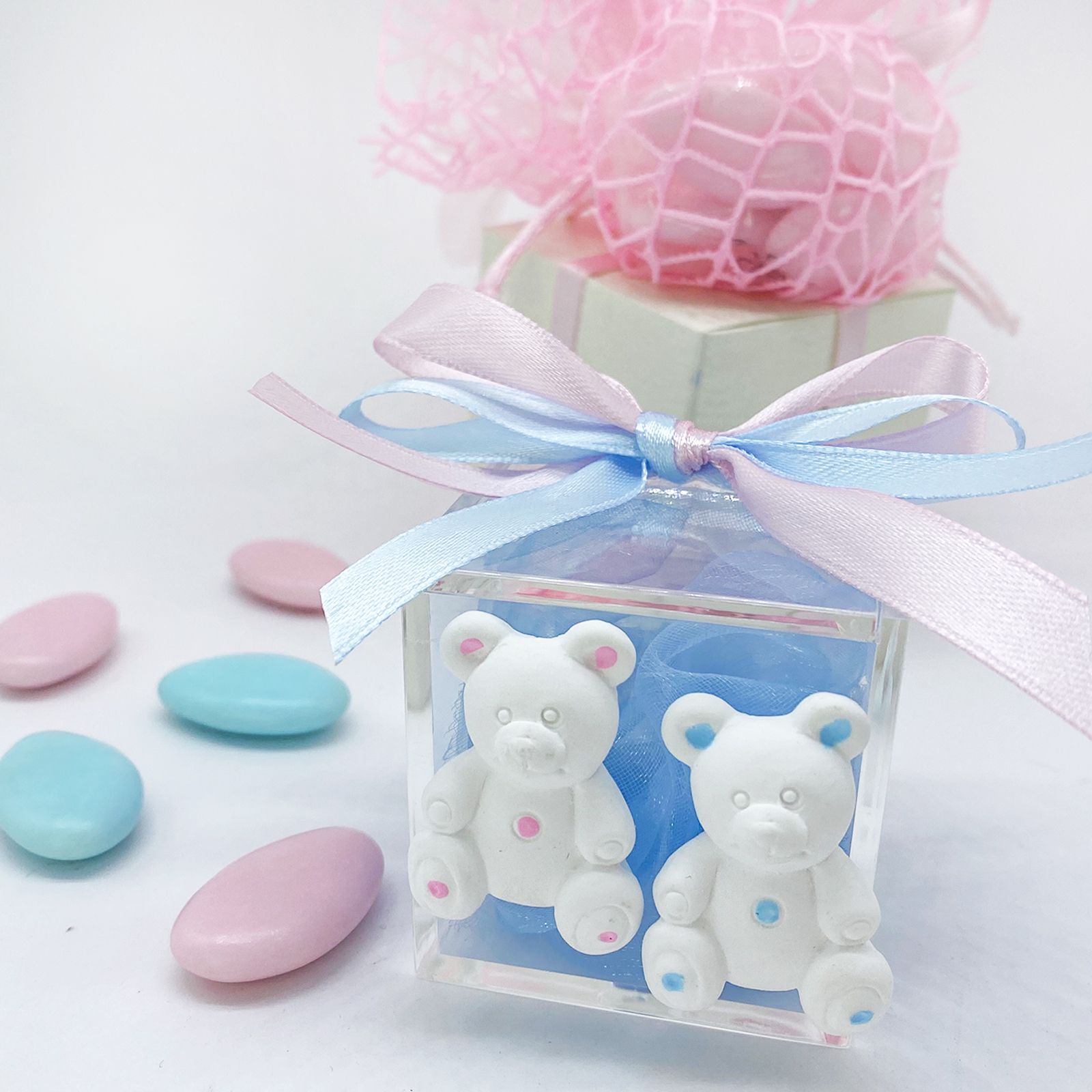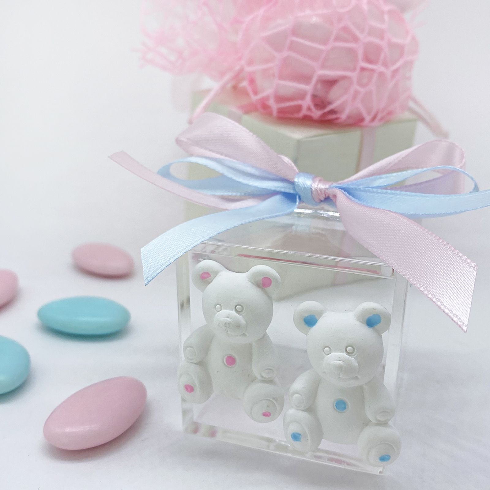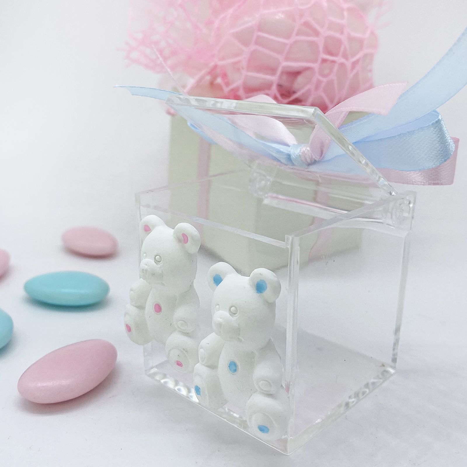 Celebra il dolce arrivo dei gemellini con questa affascinante confettata che sarà il tocco perfetto per qualsiasi evento speciale. La scatolina trasparente in plexiglass , non solo può contenere confetti o piccoli regali, ma è anche ideale come segnaposto creativo. L'applicazione di teneri gessetti a forma di orsetti, con dettagli colorati in rosa o azzurro, aggiunge un tocco di tenerezza e gioia.