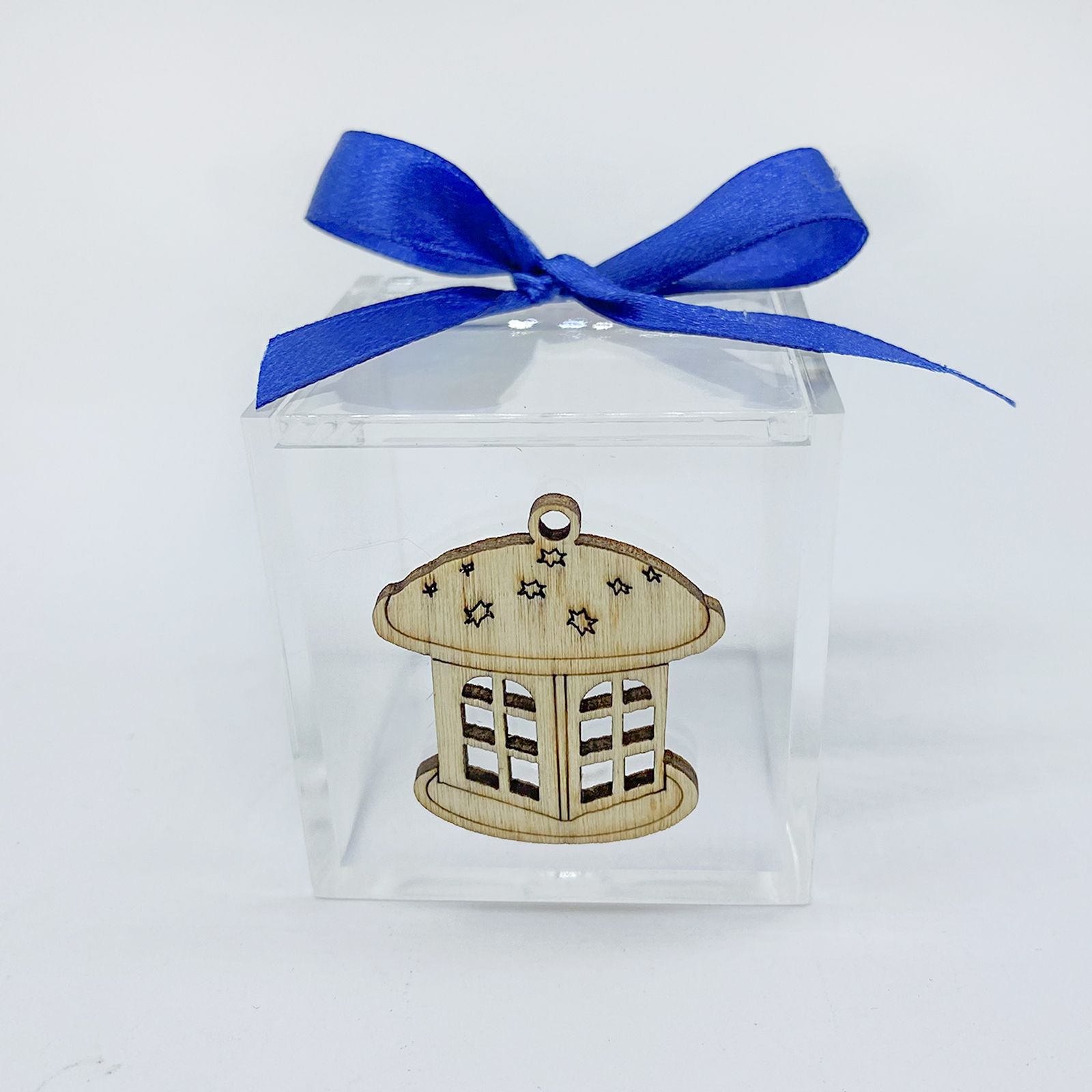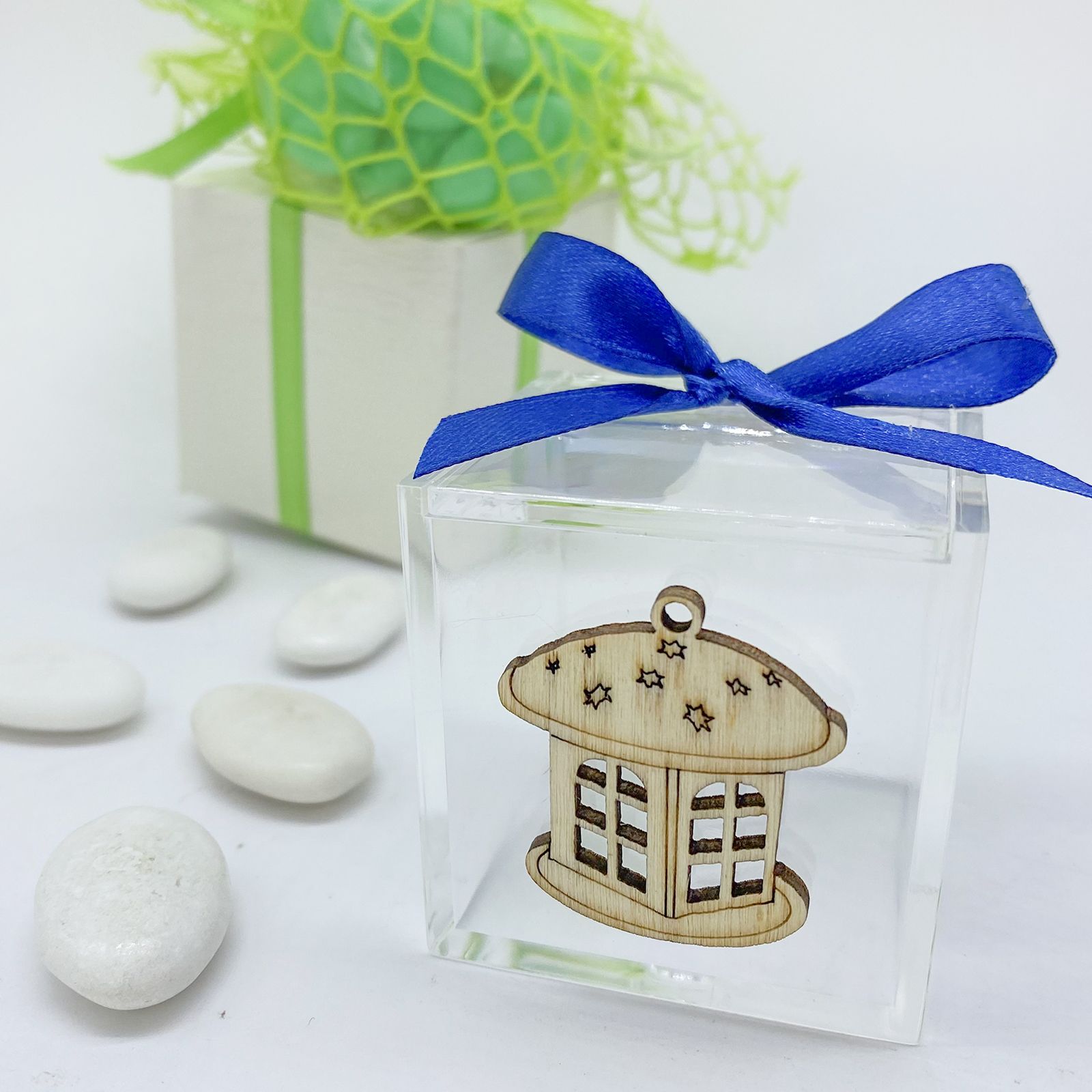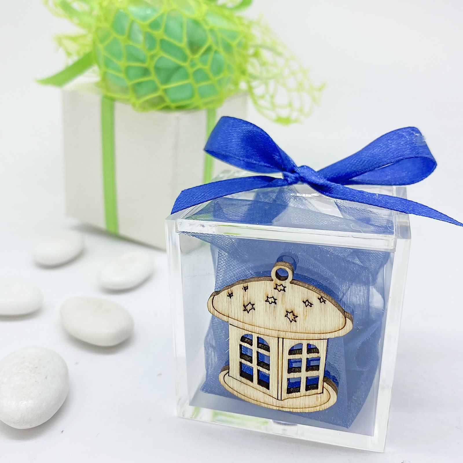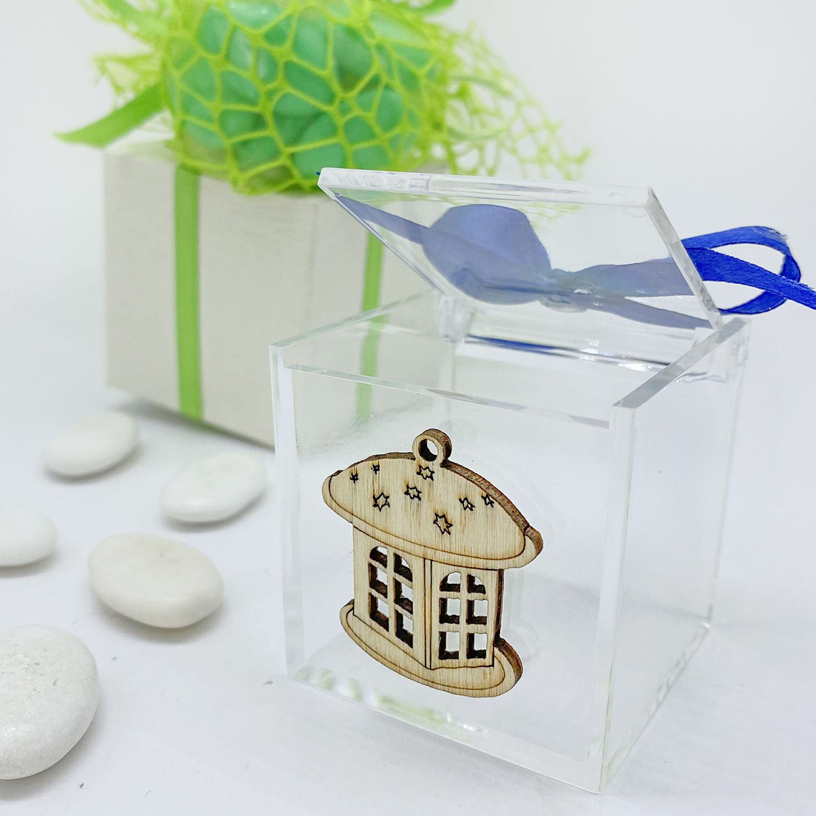 La bomboniera presenta una scatola in plexiglass resistente e trasparente, che permette di ammirare il suo contenuto in modo elegante. Il ciondolo in legno a forma di lantera,invece, aggiunge un tocco di raffinatezza.