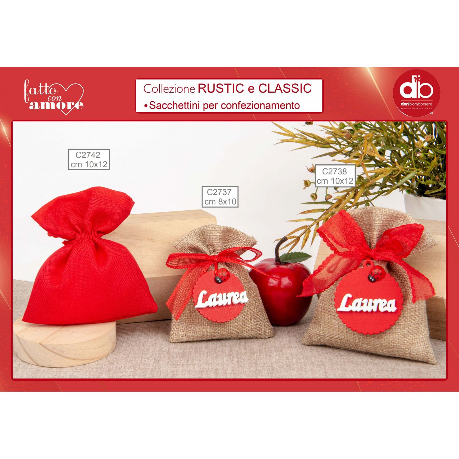 Regala ai tuoi amici e parenti un tocco di eleganza con questo Sacchettino porta confetti in juta rosso. Un'idea confettata originale, di tendenza e di sicuro successo! Utilizzato come segnaposto o come regalo di fine festa, questo gadget economico è l'ideale per decorare il tavolo del tuo evento, come laurea, cresima, Natale, San Valentino o nozze di rubino. Elegante e con una dimensione di 10x12 cm circa, questo sacchettino con confetti è un modo per augurare ai tuoi invitati tutto il meglio per il loro avvenire. Regalare questo piccolo oggetto significa augurare loro un futuro ricco di emozioni, vitalità e determinazione, proprio come il colore rosso con cui è fatto.