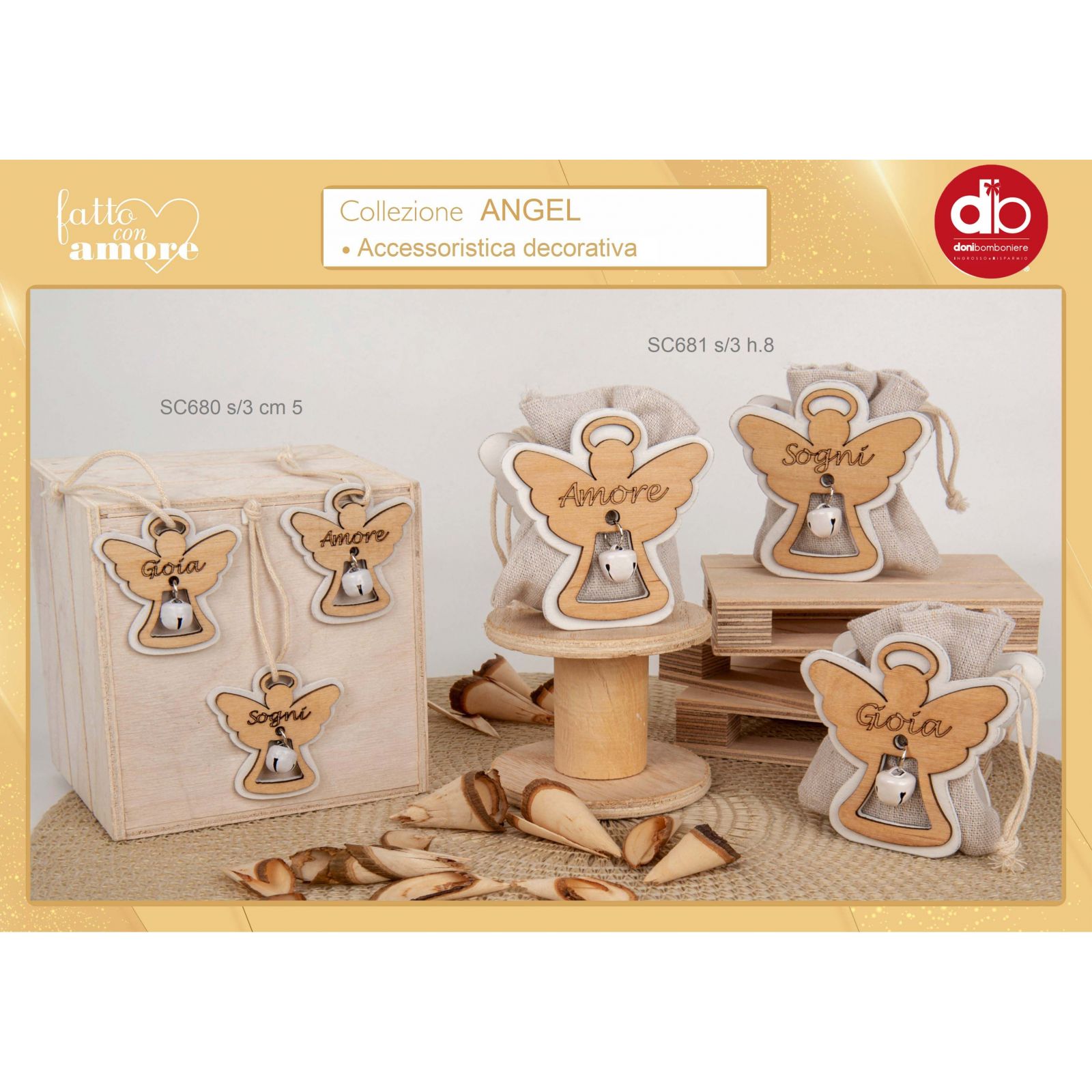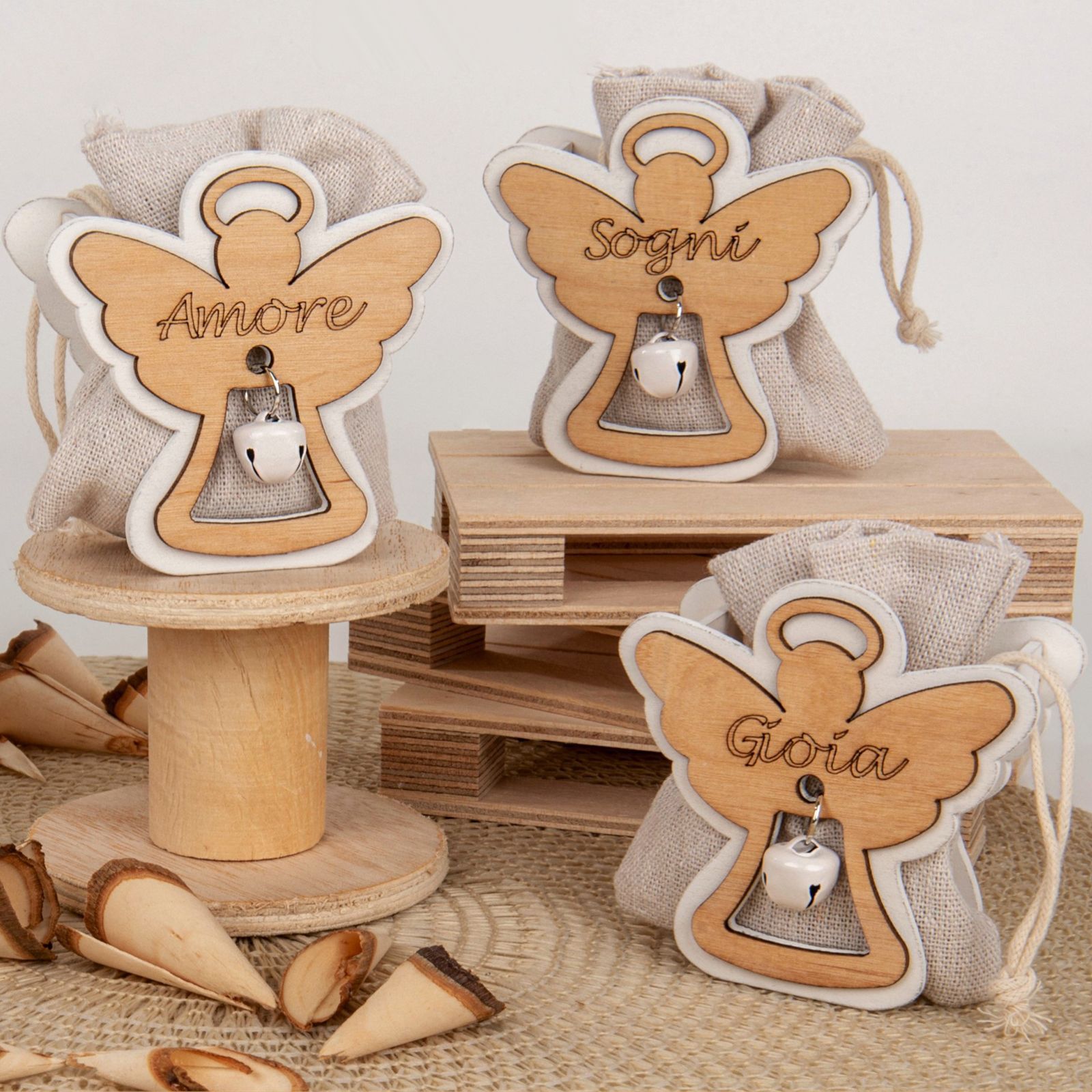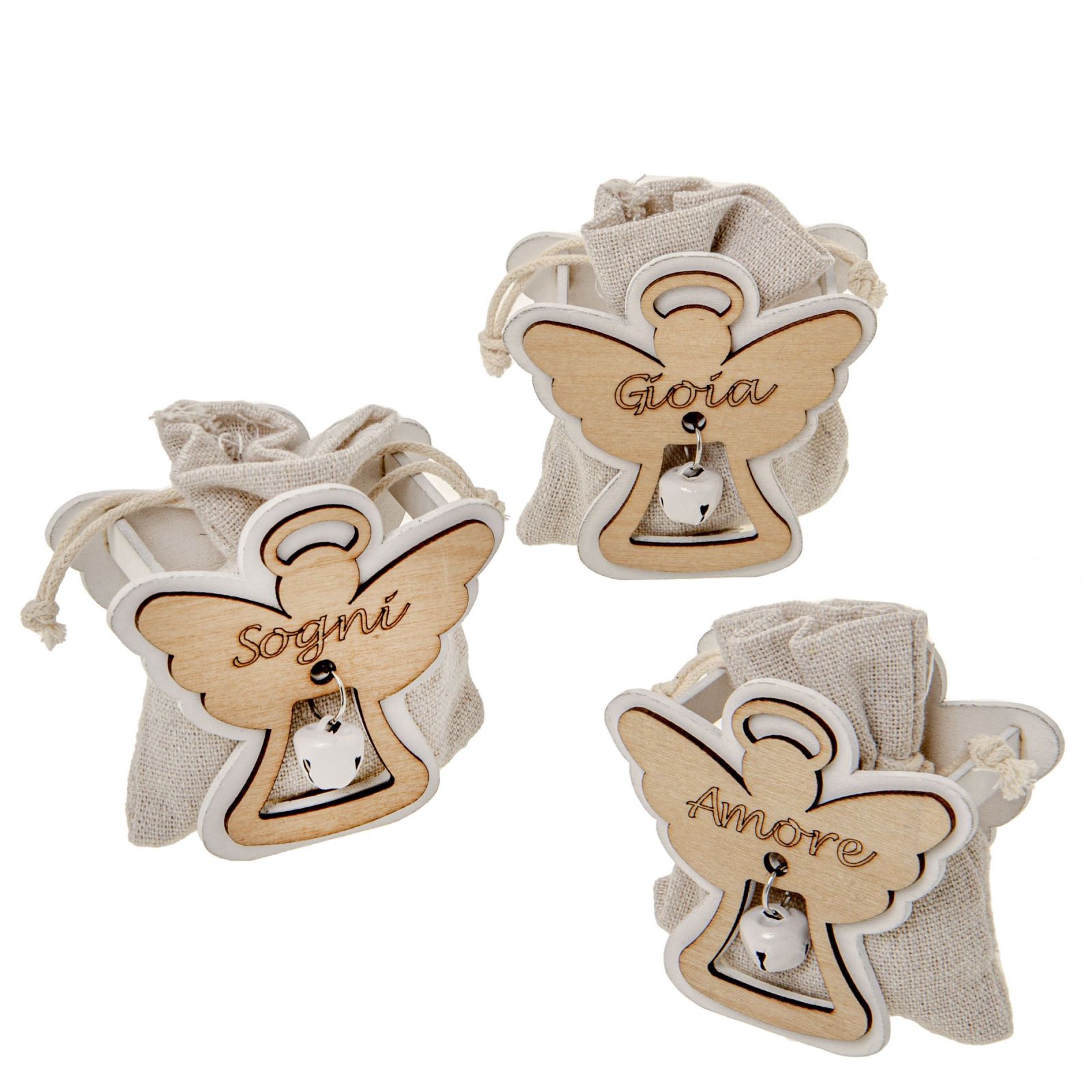 Regala un angioletto come simbolo di protezione e amore con questa bomboniera della linea Angel Bag: una scatolina in legno con sacchettino porta confetti, angioletto in doppio strato e sonaglino. Questa pratica ed elegante soluzione di porta confetti è assortita in tre varianti, ciascuna con una parola significatva 'amore', 'gioia' e 'sogni', e si presta a qualsiasi evento, dalle nascite ai battesimi, dalle comunioni alle cresime, dai matrimoni ai compleanni, senza distinzione. La funzione di segnaposto è assicurata e rappresenta un gradevole regalo per i tuoi invitati. Con l'acquisto di questa bomboniera si porta un tocco di originalità e di stile ad ogni allestimento di tavola. Questo accessorio devorativo può anche essere usato come porta caramelle e porta confetti. La bomboniera della linea Angel Bag regala un tenero pensiero di amore a chi la riceve.