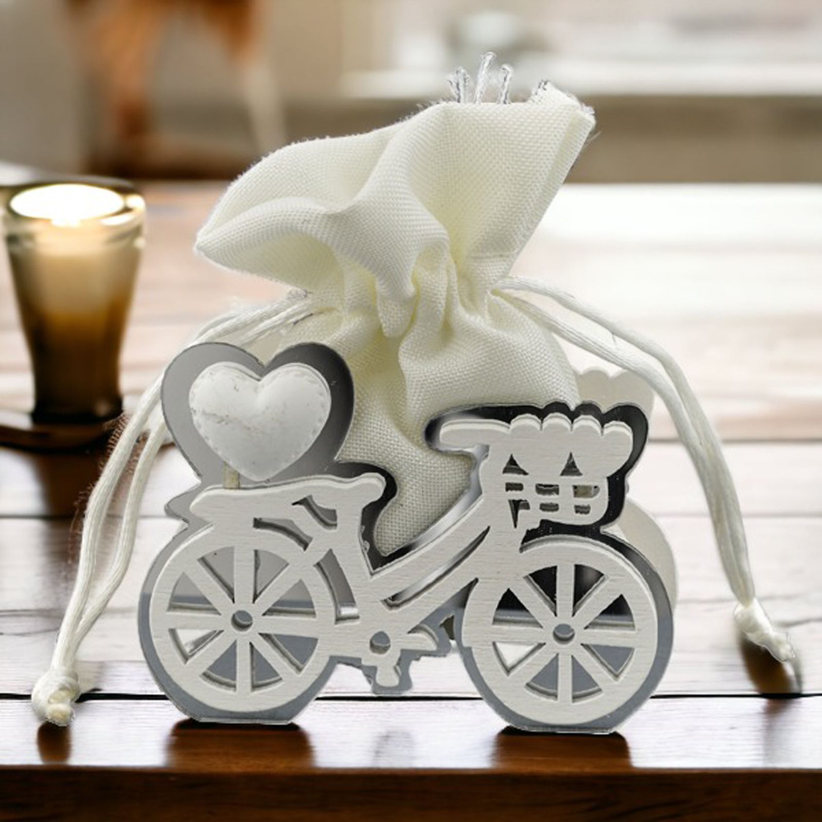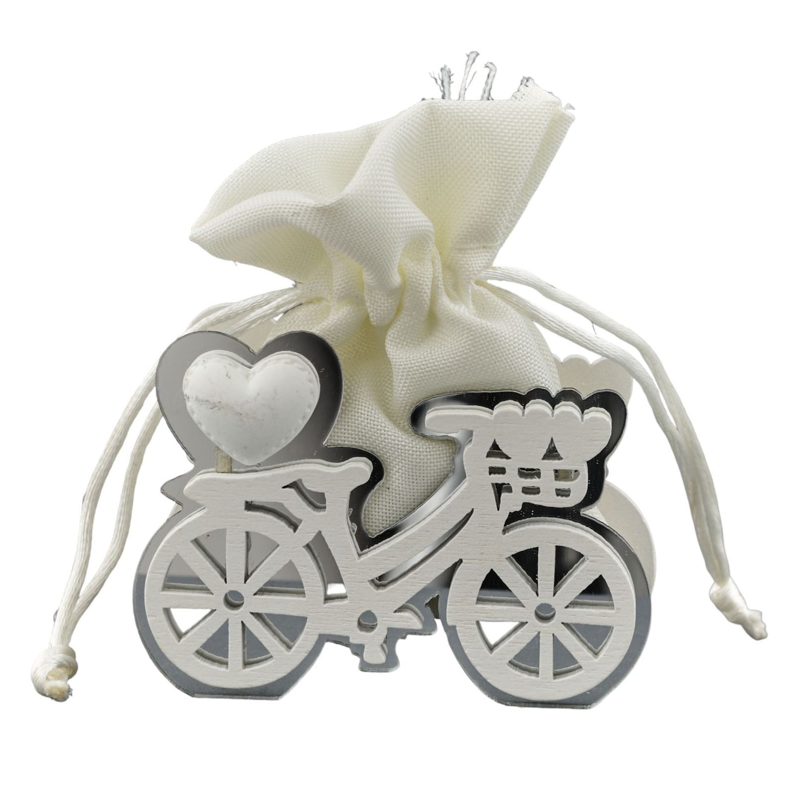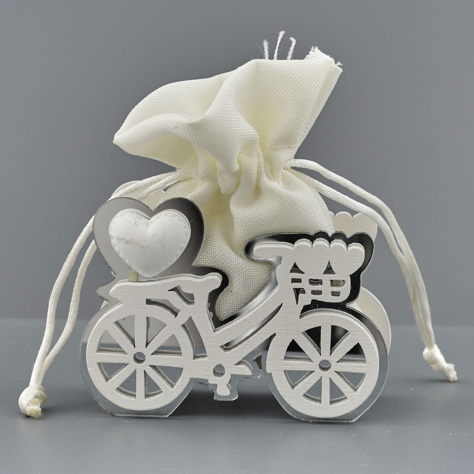 Regala emozioni con questo incantevole portaconfetti a forma di bicicletta e cuore a doppio strato, realizzato con retro in plexiglass argentato e parte anteriore in legno bianco, che viene offerto insieme a un sacchettino bianco al centro. Una bomboniera di dimensioni 8x3,5x6,5 cm circa, realizzata nei colori argento e bianco. Una idea regalo perfetta per celebrare l'anniversario, le nozze d'argento o un matrimonio, un oggetto che sicuramente emozionerà tutti gli invitati!