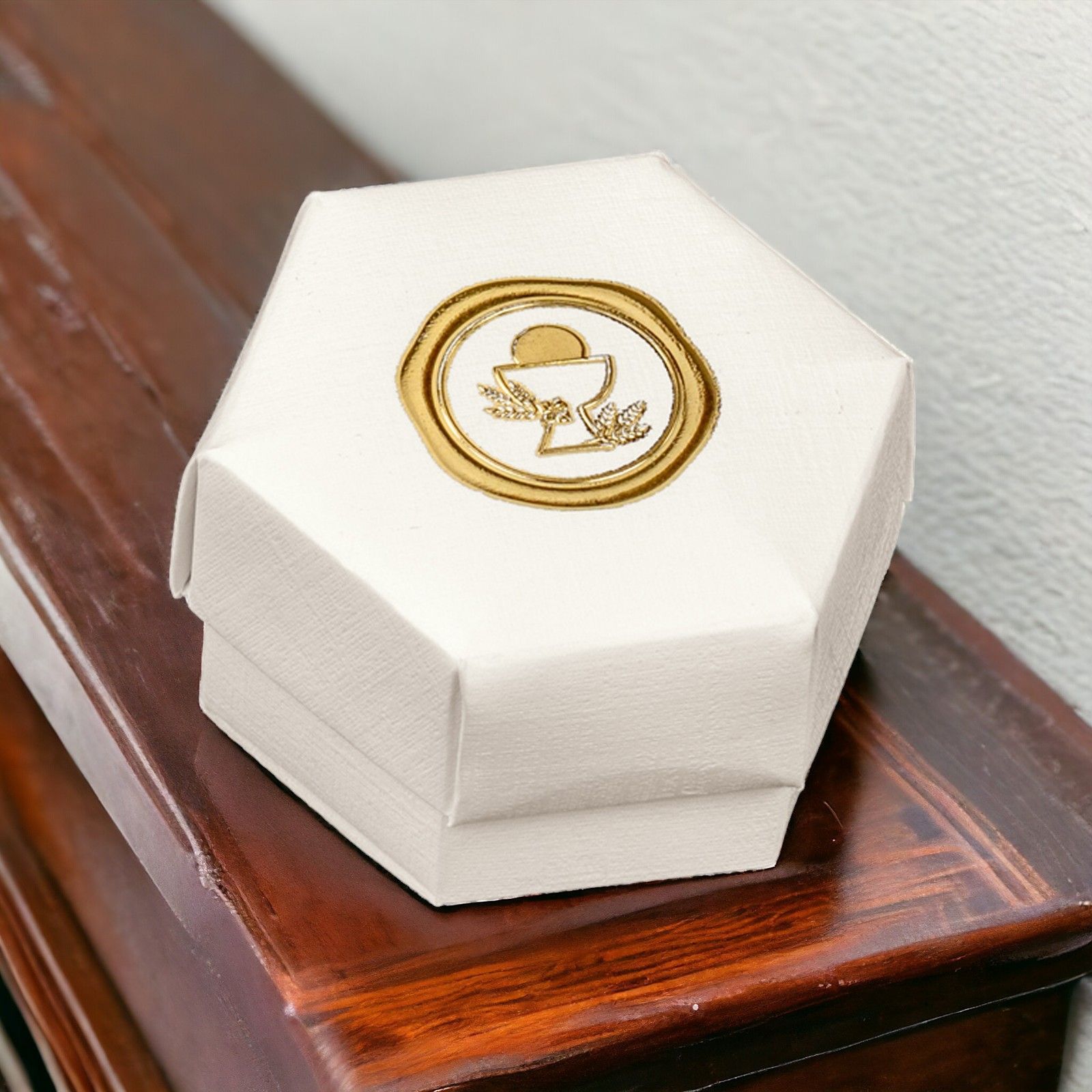 Immergiti nell'atmosfera sacra della comunione con la nostra scatolina esagonale per confetti. Decorata con simboli sacri in oro stampati a caldo sul coperchio, questa scatola incarna l'eleganza e il significato profondo dell'evento.