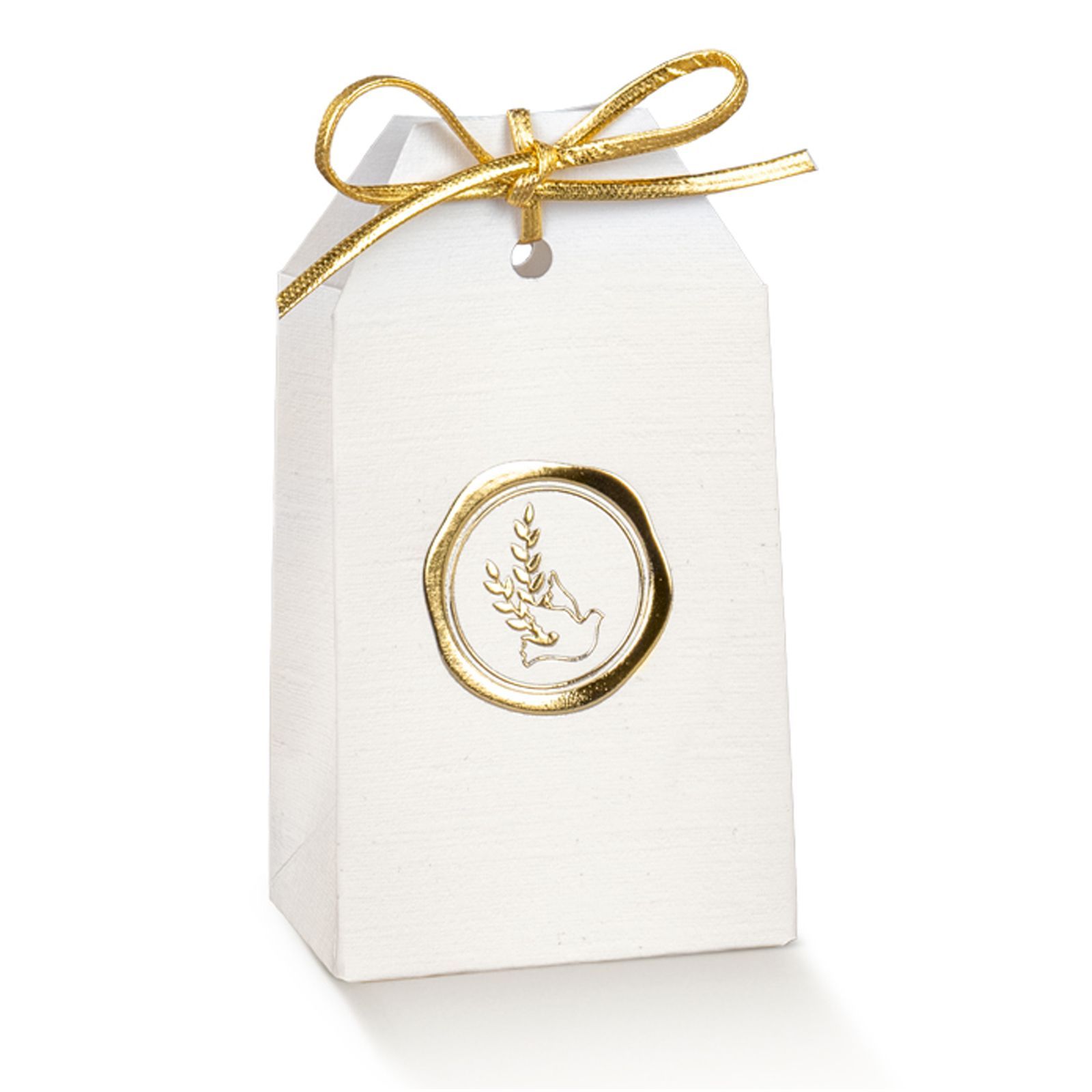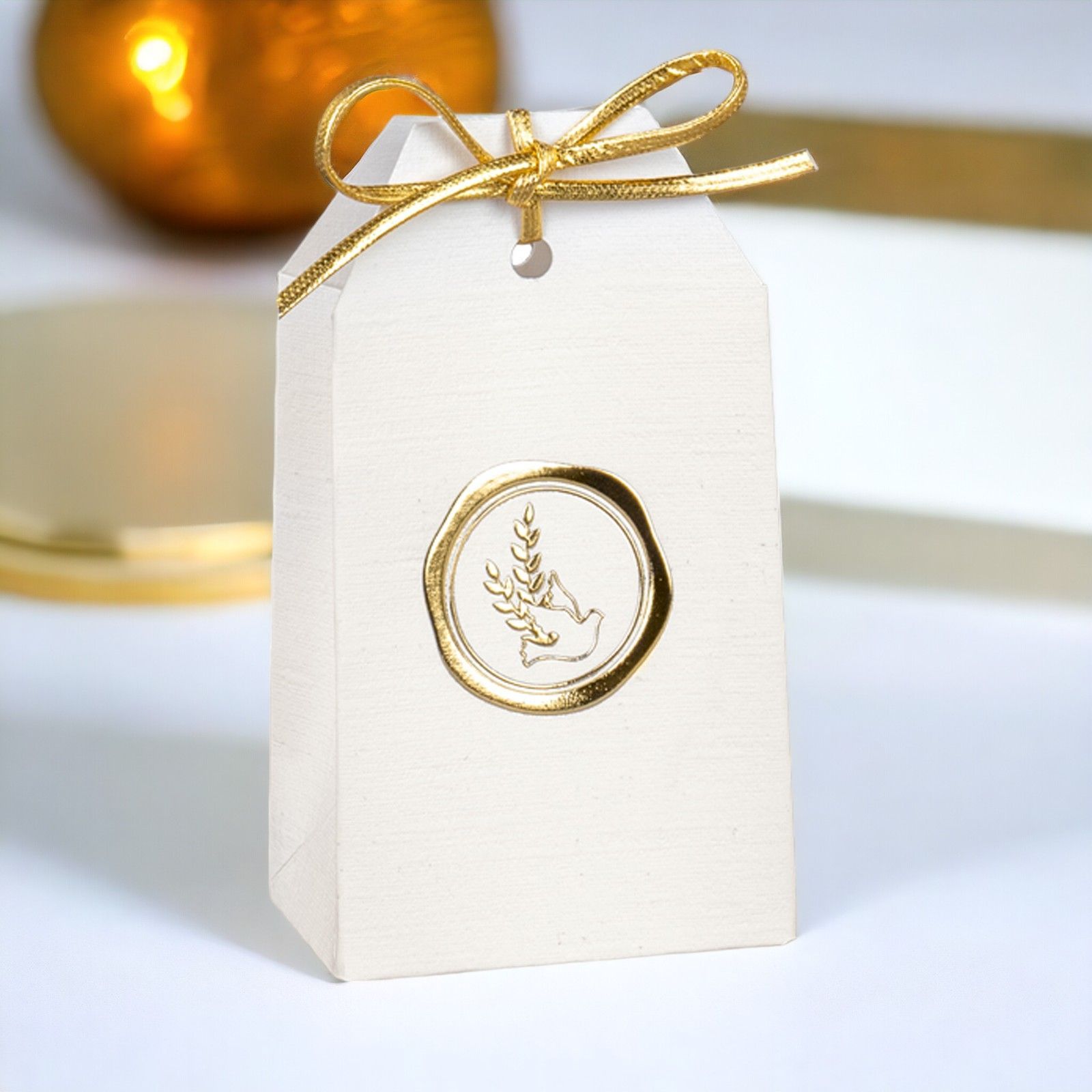 Per celebrare momenti sacri e significativi come la Comunione e la Cresima, questa delicata bustina tag portaconfetti è l'accessorio perfetto. Arricchita con il simbolo universale di pace, la colomba, insieme a un ramoscello d'ulivo dorato, rappresenta la spiritualità e la serenità di queste occasioni speciali.