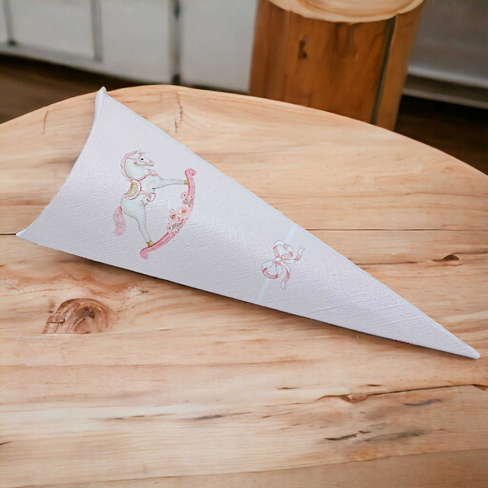 Il design affascinante e raffinato di questo portaconfetti in cartoncino rosa presenta un grazioso cavallo a dondolo, simbolo di innocenza e gioia dell'infanzia. Con circa 19 cm di altezza, si presenta come un ricordo adorabile da esporre o come segnaposto per abbellire la tua tavola.