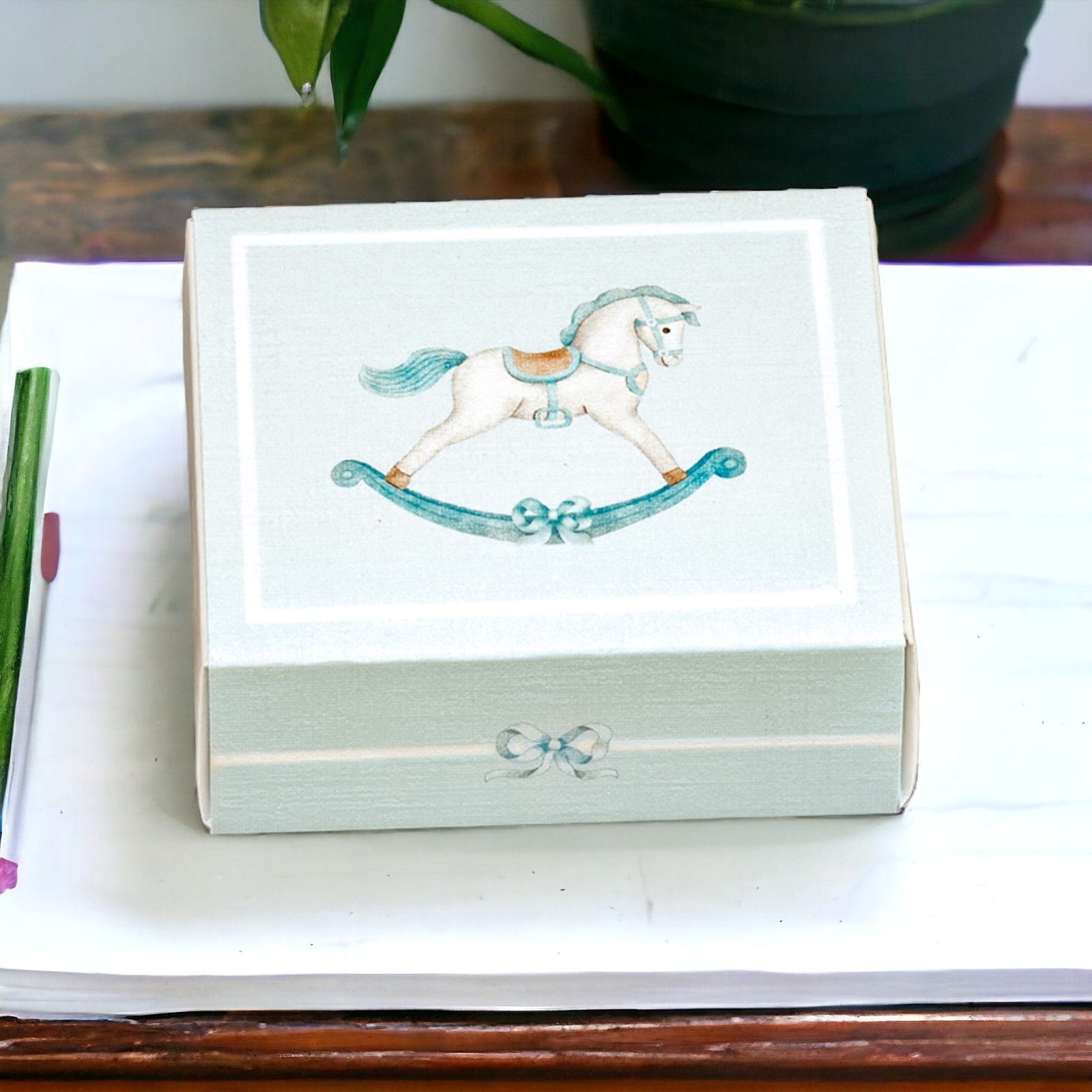 Scegliete la nostra scatolina portaconfetti rettangolare celeste con cavallo a dondolo e trasformate ogni momento speciale in un'occasione indimenticabile. Lasciate che il vostro evento brilli di amore, dolcezza e felicità.