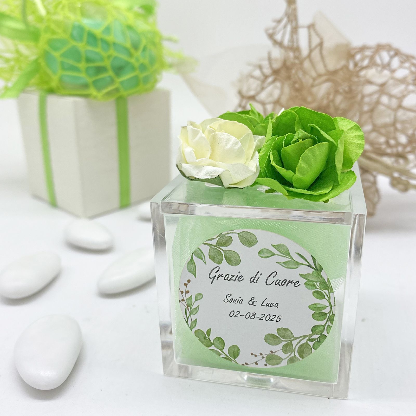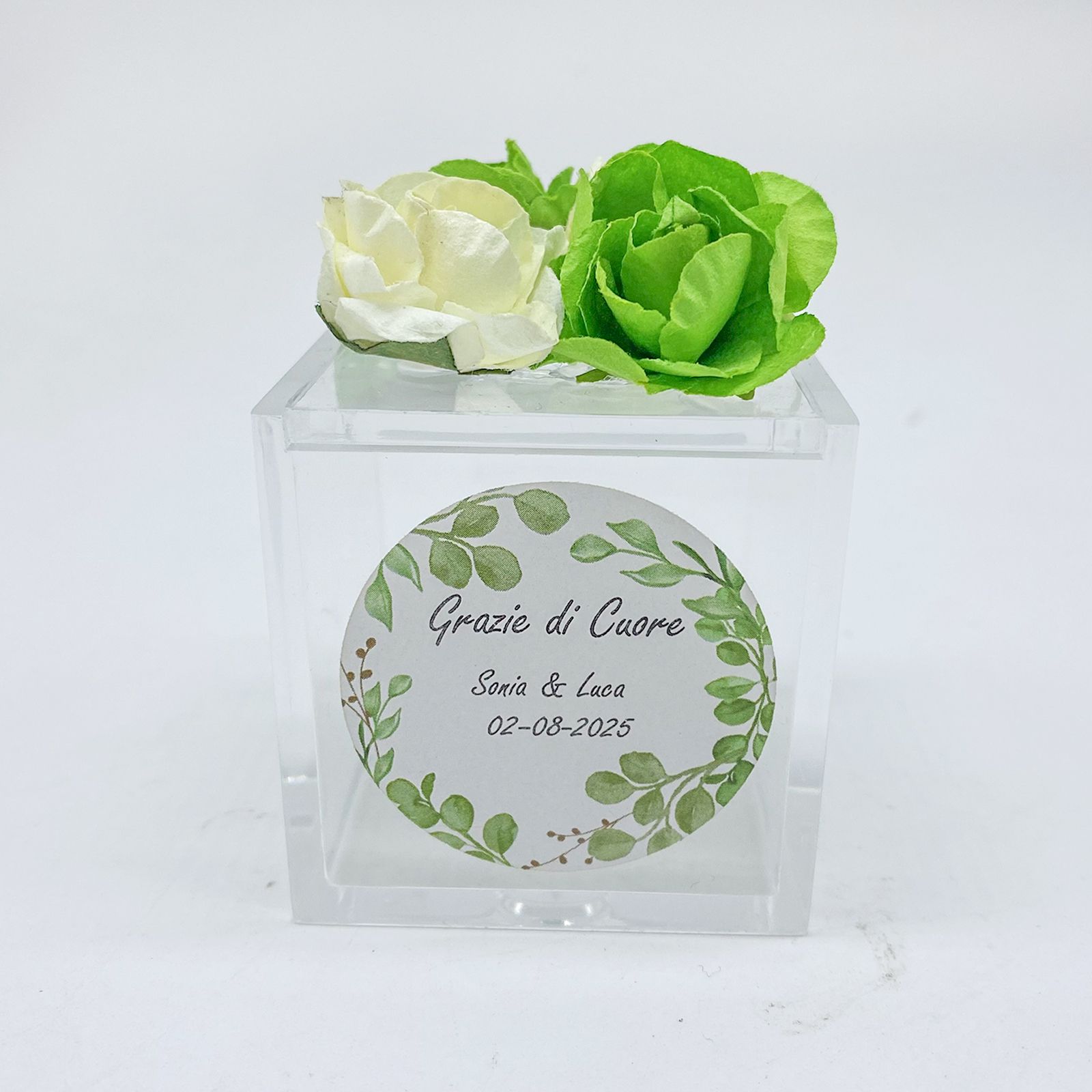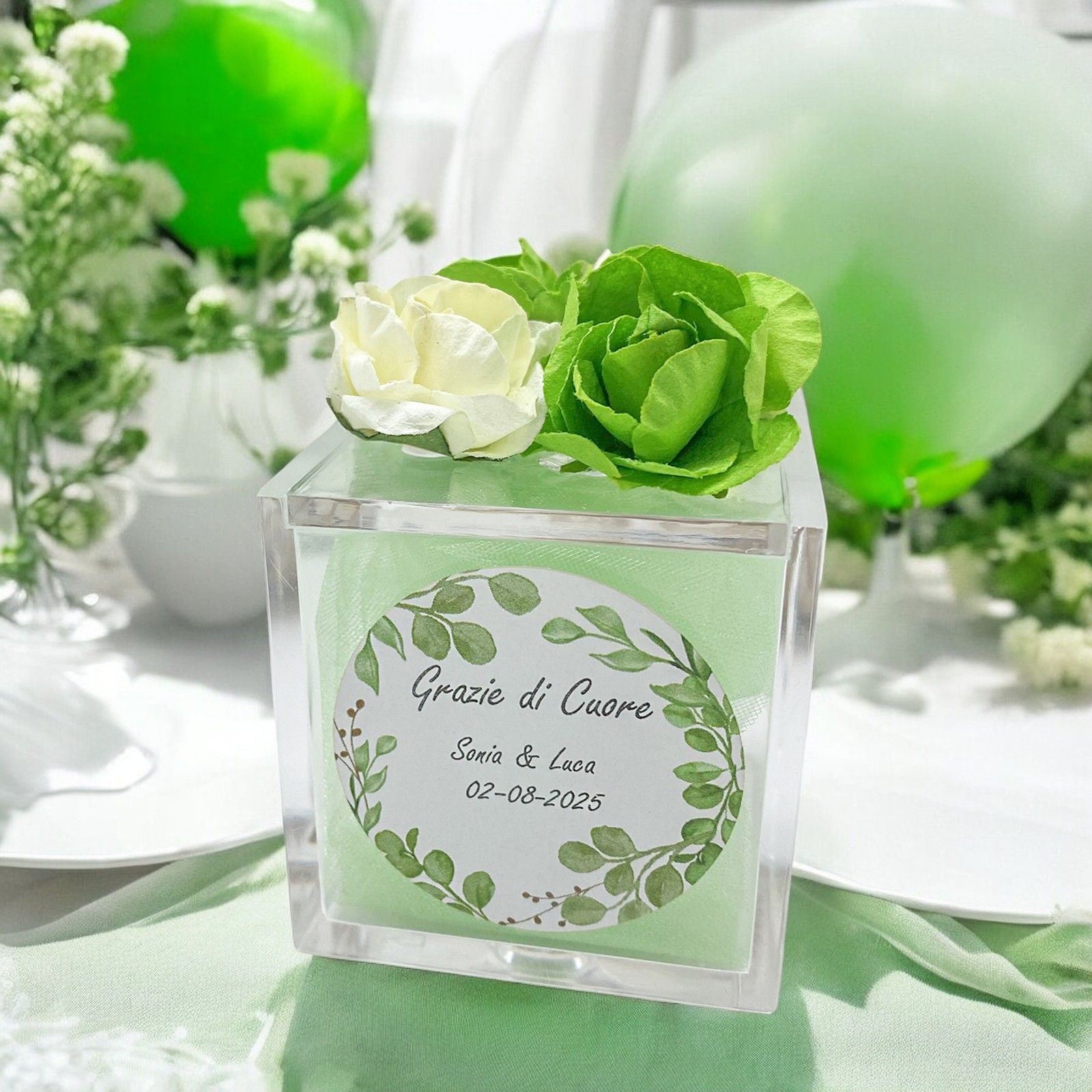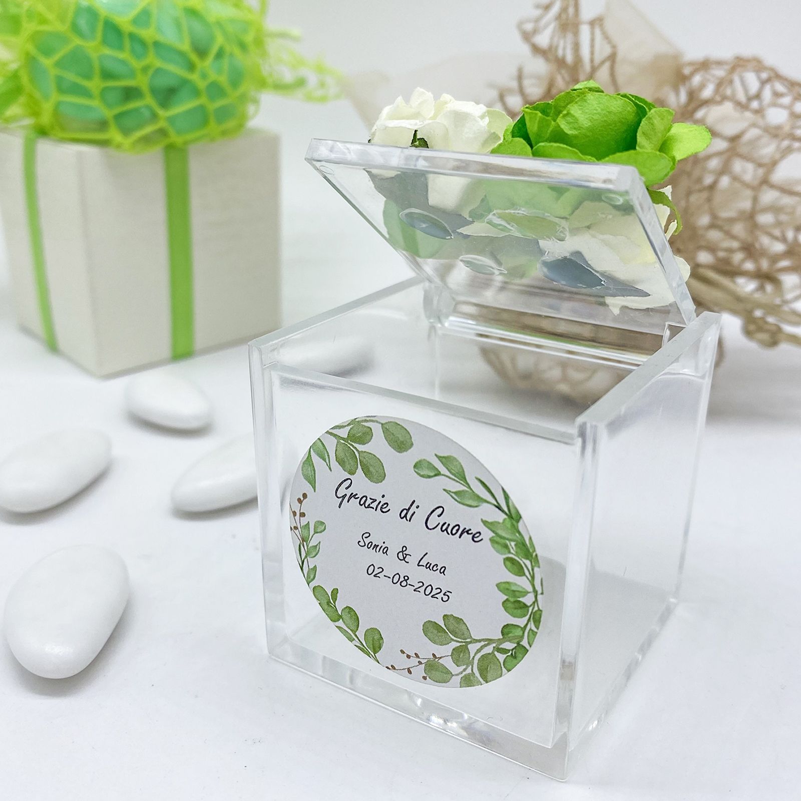 Presentiamo la nostra scatolina portaconfetti in plexiglass, un accessorio elegante e personalizzabile, ideale per eventi speciali come la promessa, il matrimonio o l'anniversario. Il design include un adesivo decorato con foglie per inserire il nome delgli sposi oppure del festeggiato.